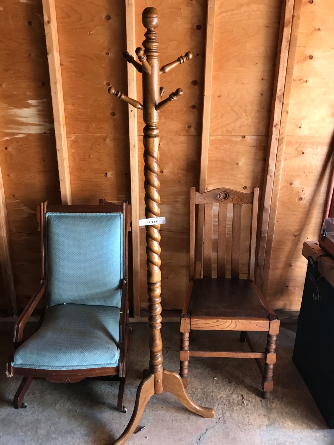 Wood coat rack (standing),blue upholstered rocking chair (minor damage)