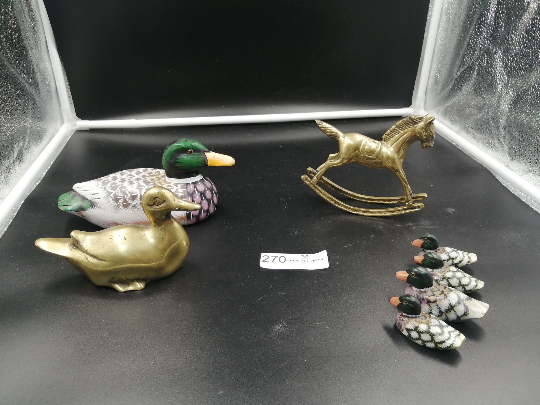 Wooden Ducks, Brass Duck, and Brass Rocking Horse
