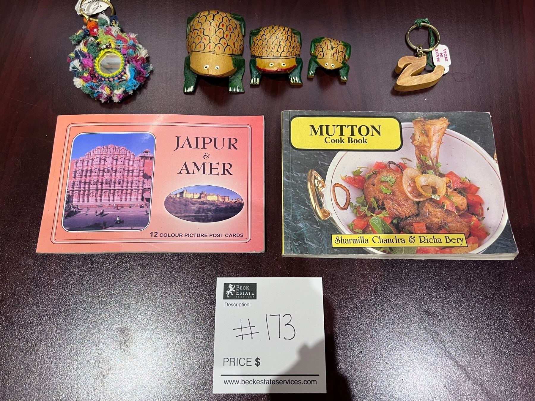Wooden Frog/Turtle Statuettes, Mutton Cook Book, Jaipur & Amer Post Card Book and 2 Keychains