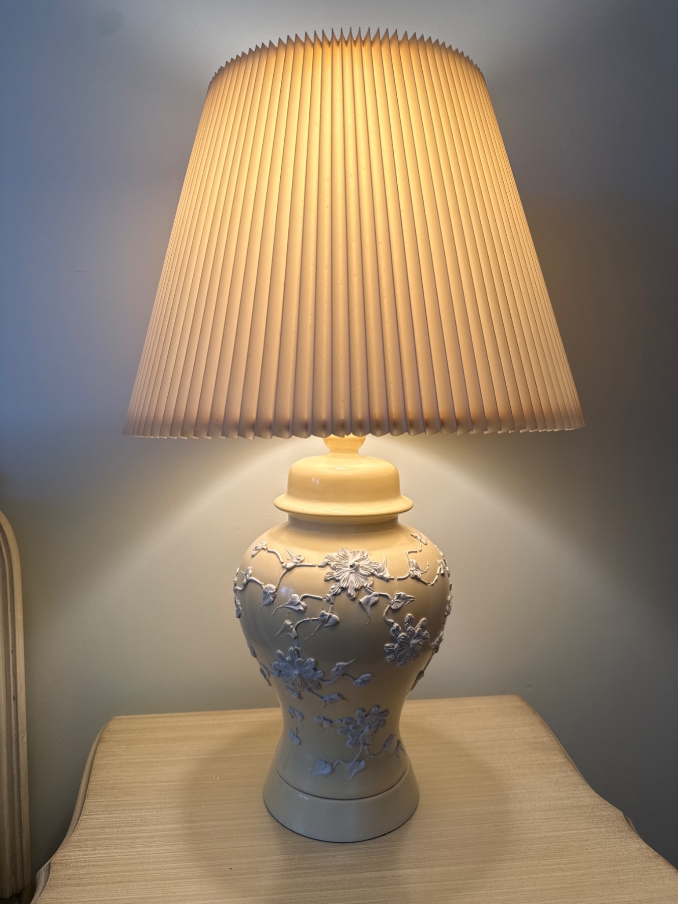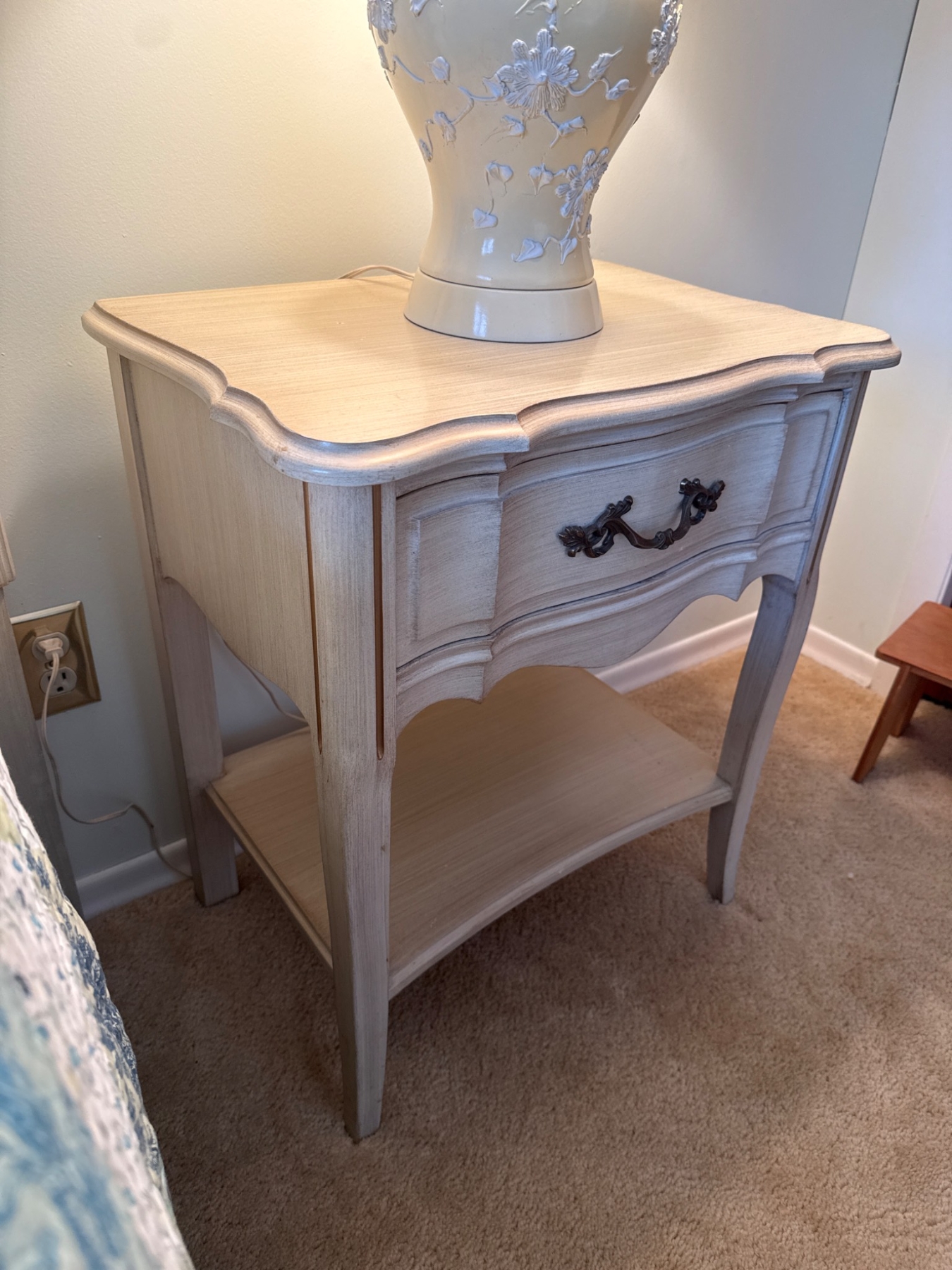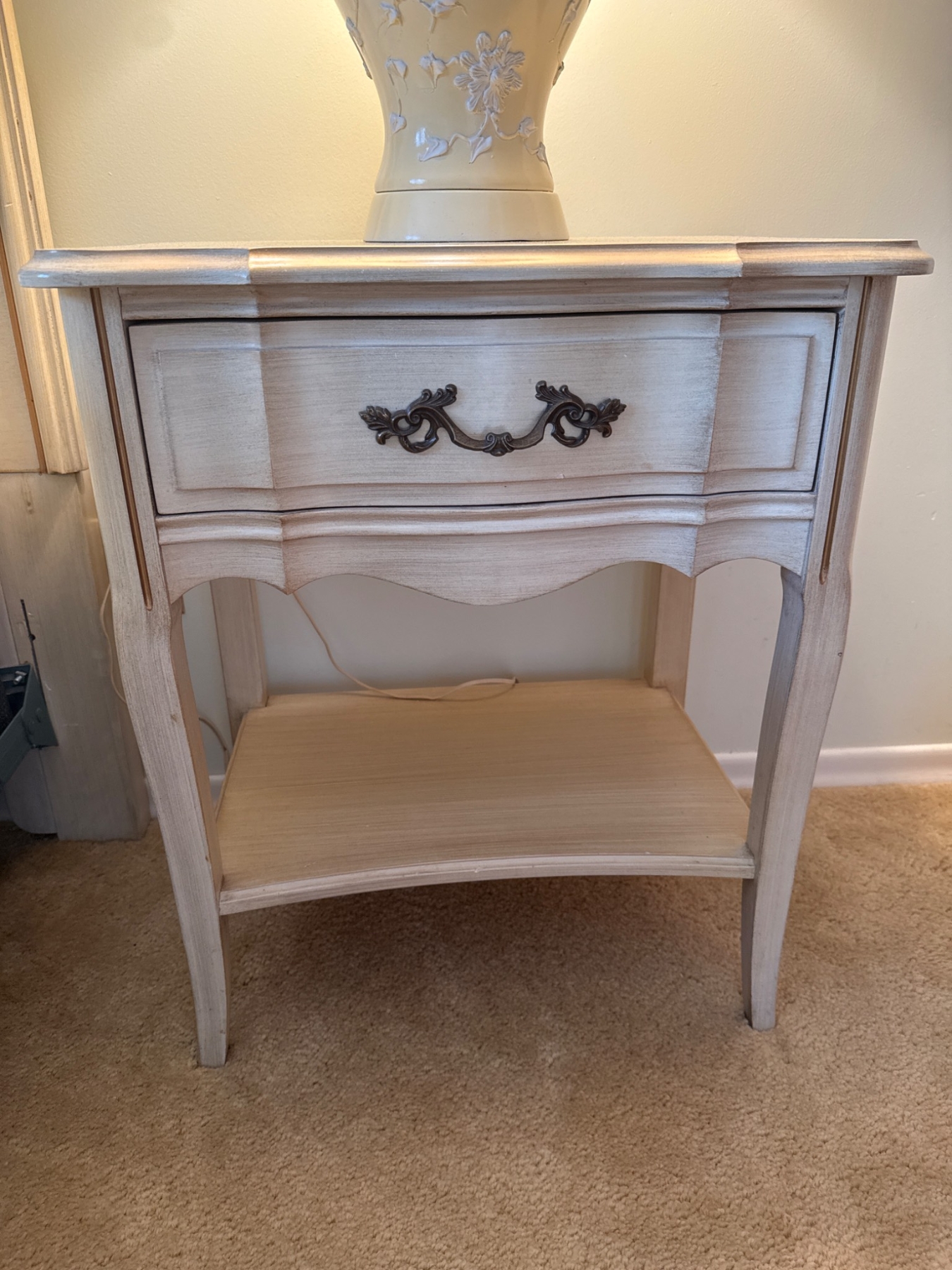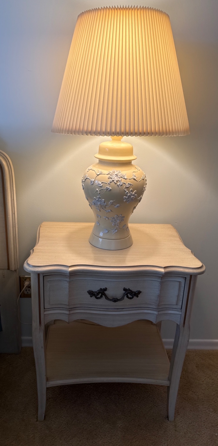 A wooden nightstand with an elegant design, featuring a single drawer with ornate metal hardware and a lower shelf for storage. The piece is topped with a floral-embossed ceramic table lamp and pleated shade. The nightstand measures approximately 24 inches wide, 18 inches deep, and 28 inches high. The lamp is about 30 inches tall, including the shade.
