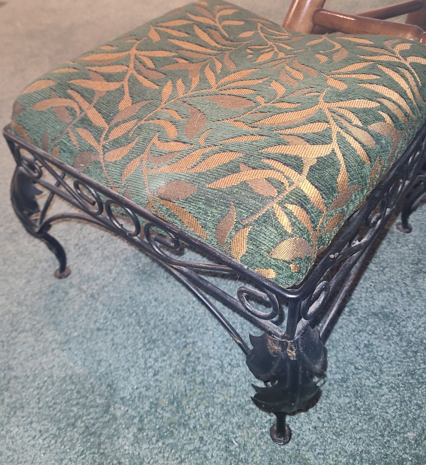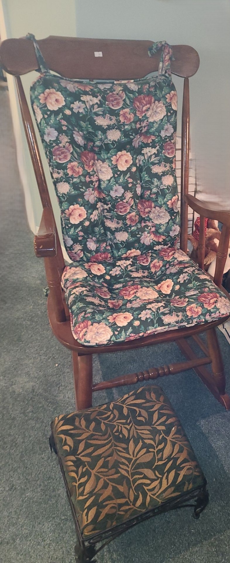 Wooden Rocking Chair 22 W, 28 D, 38 T and Metal Footstool w/ Leaf Upholstery 13.5 X 13.5, 10 T