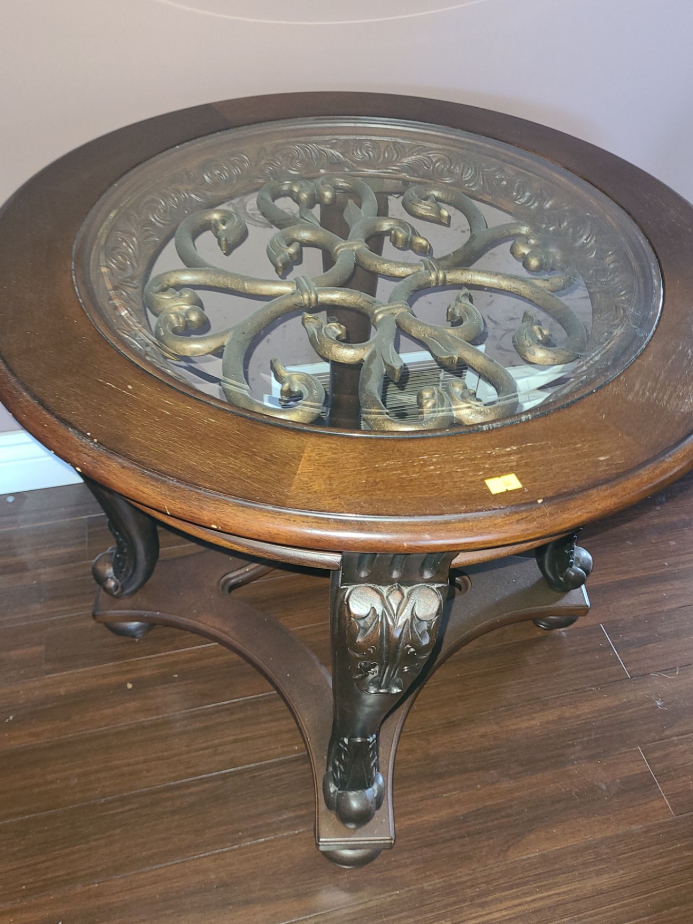 Wooden Side Table w/ Glass Insert Top and Scroll Design 28" Diameter Top, 26 T (2nd)
