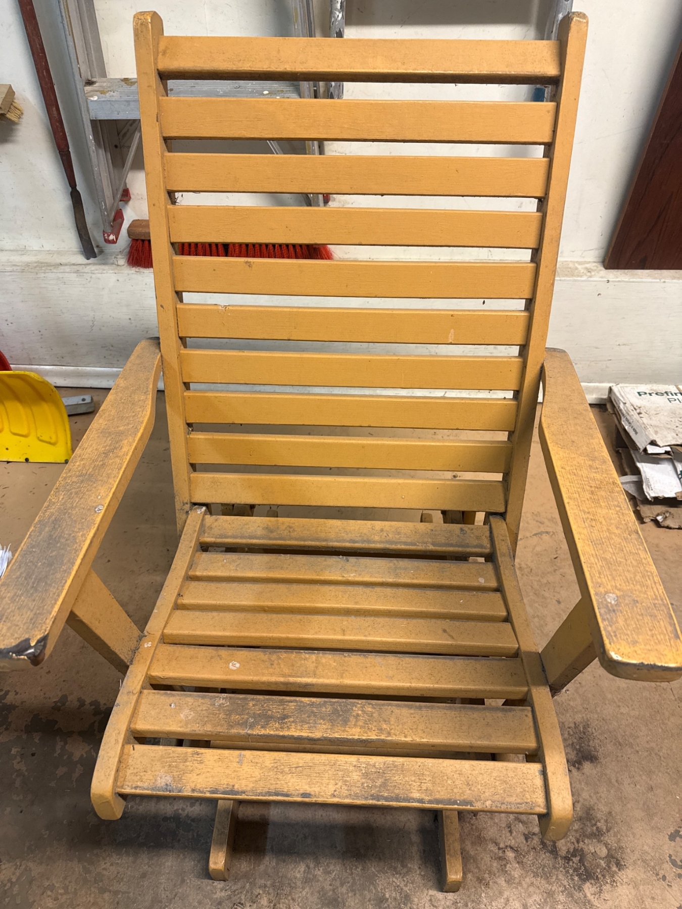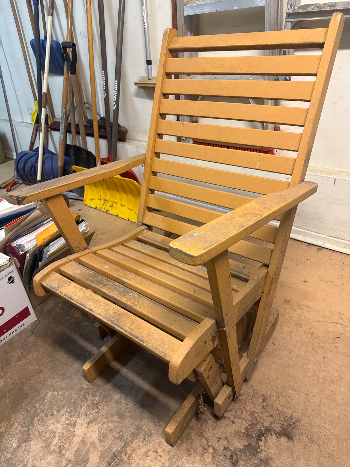 Wooden slat-back glider chair featuring a natural wood tone finish and a smooth rocking mechanism. The chair includes a high back with horizontal slats and armrests for comfortable sitting. The sturdy construction is ideal for indoor or covered outdoor use. Dimensions and specific wood type are not specified. Shows visible signs of use and wear, introducing a rustic charm.