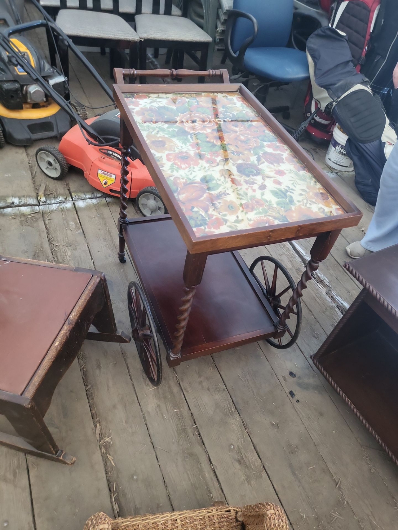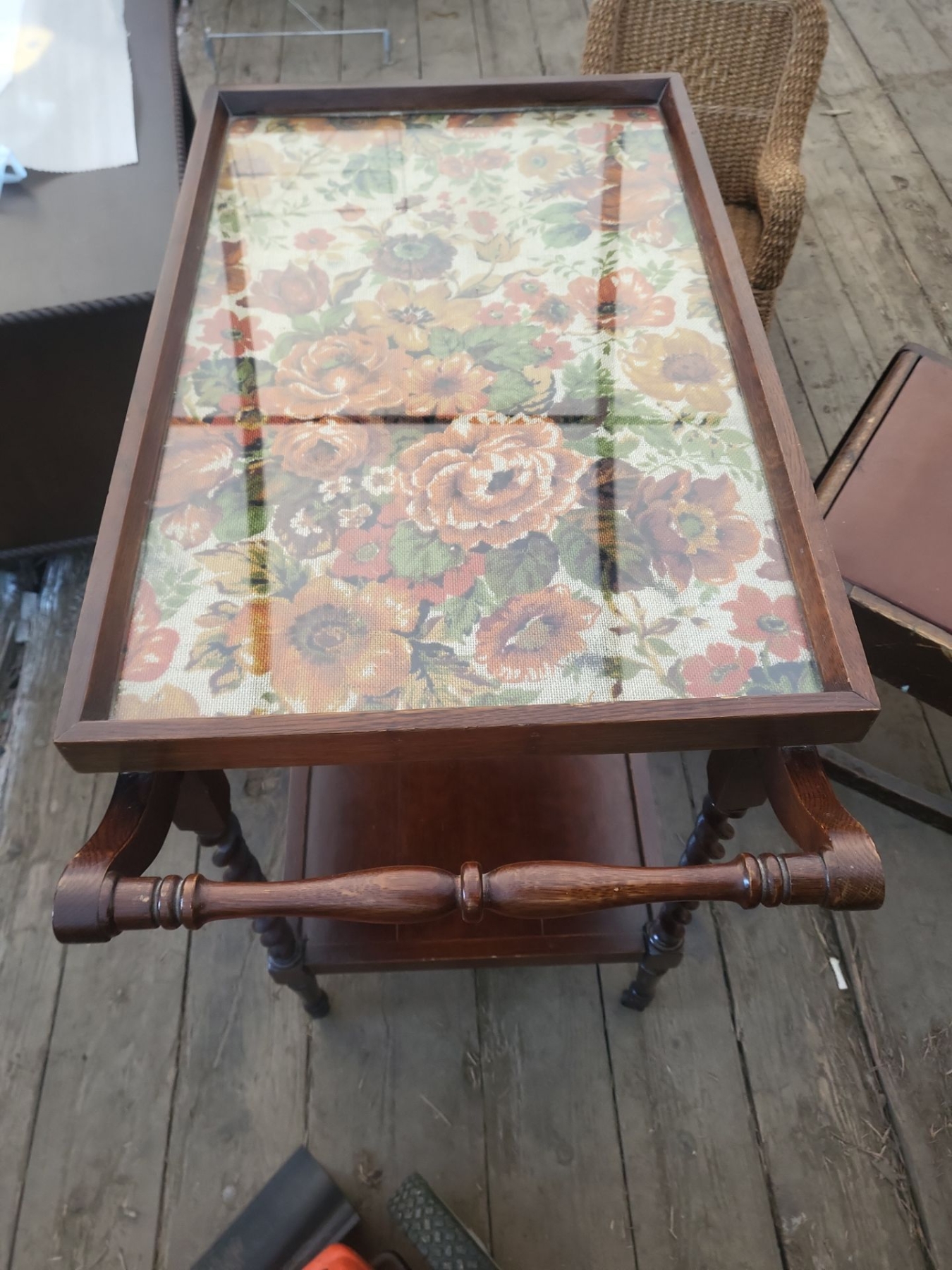 Wooden Tea Cart - Glass Covered Floral Needlepoint Top (30" x 17.5" x 32" Inches)