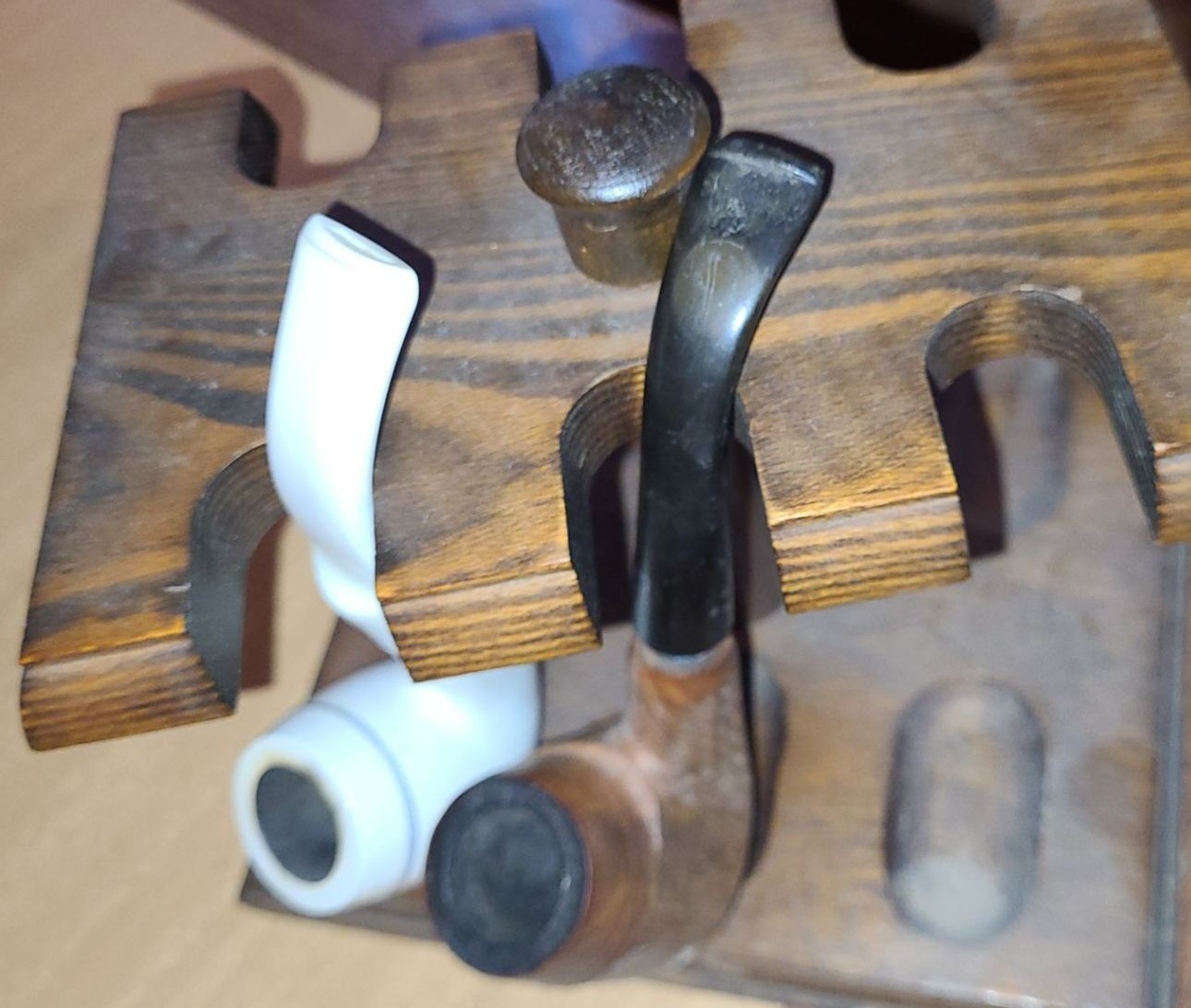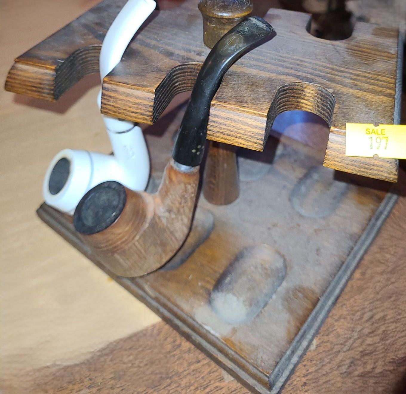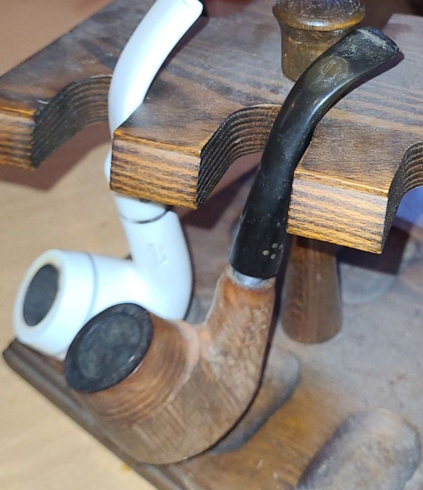 Wooden Tobacco Pipe Stand 7 W, 6 D, 5 T, Holds Six Pipes, w/ 2 Pipes Included