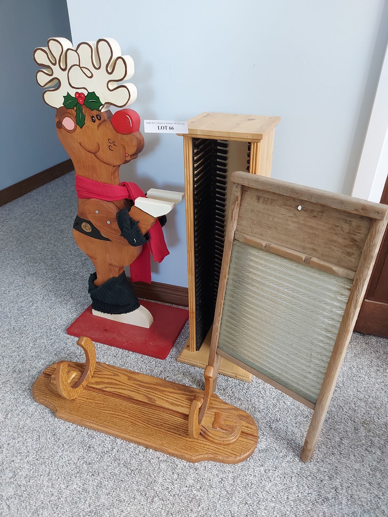 Wooden reindeer decor, wood CD tower, wooden horseshoe coat hook/rack, vintage washboard with glass