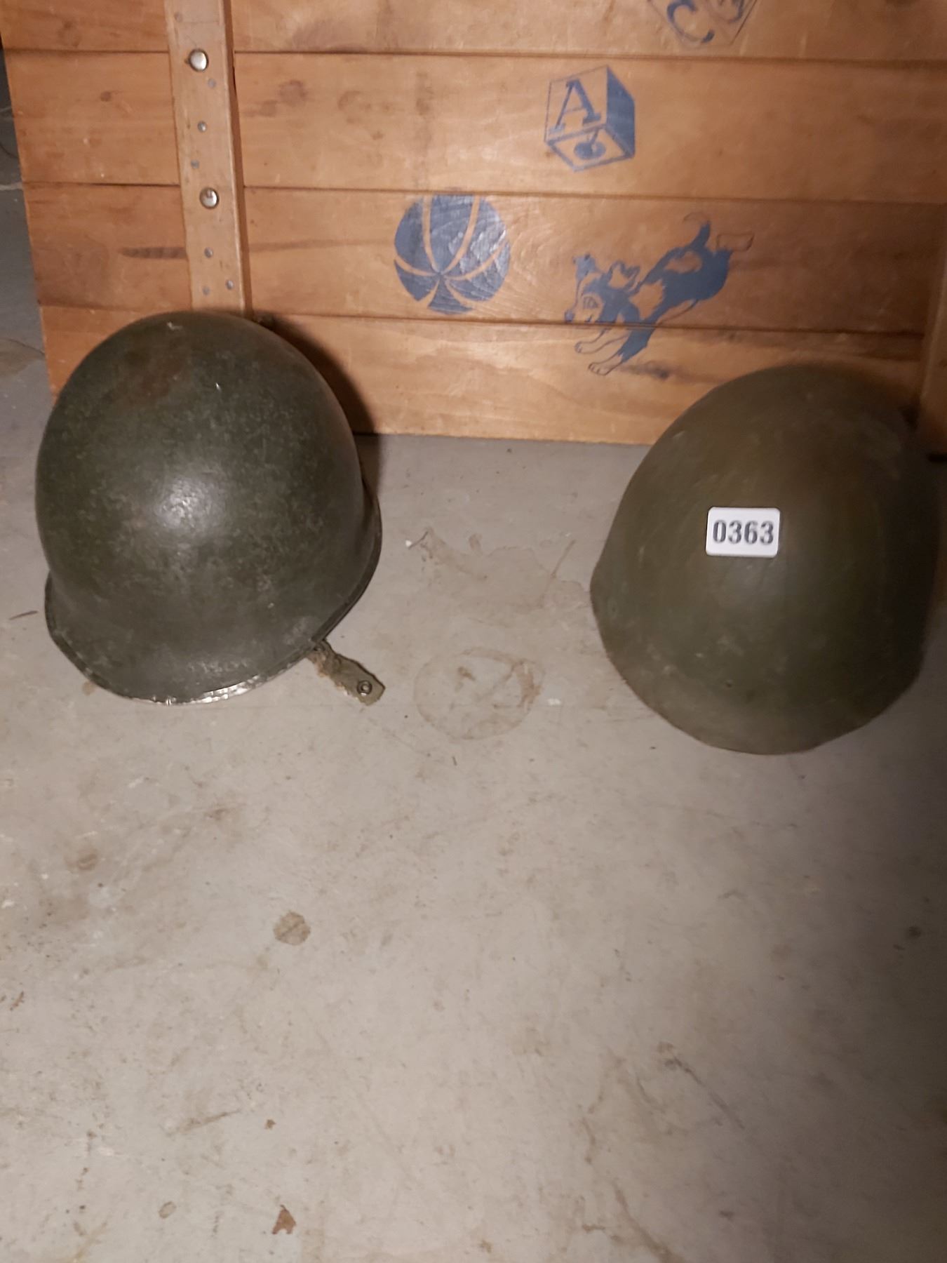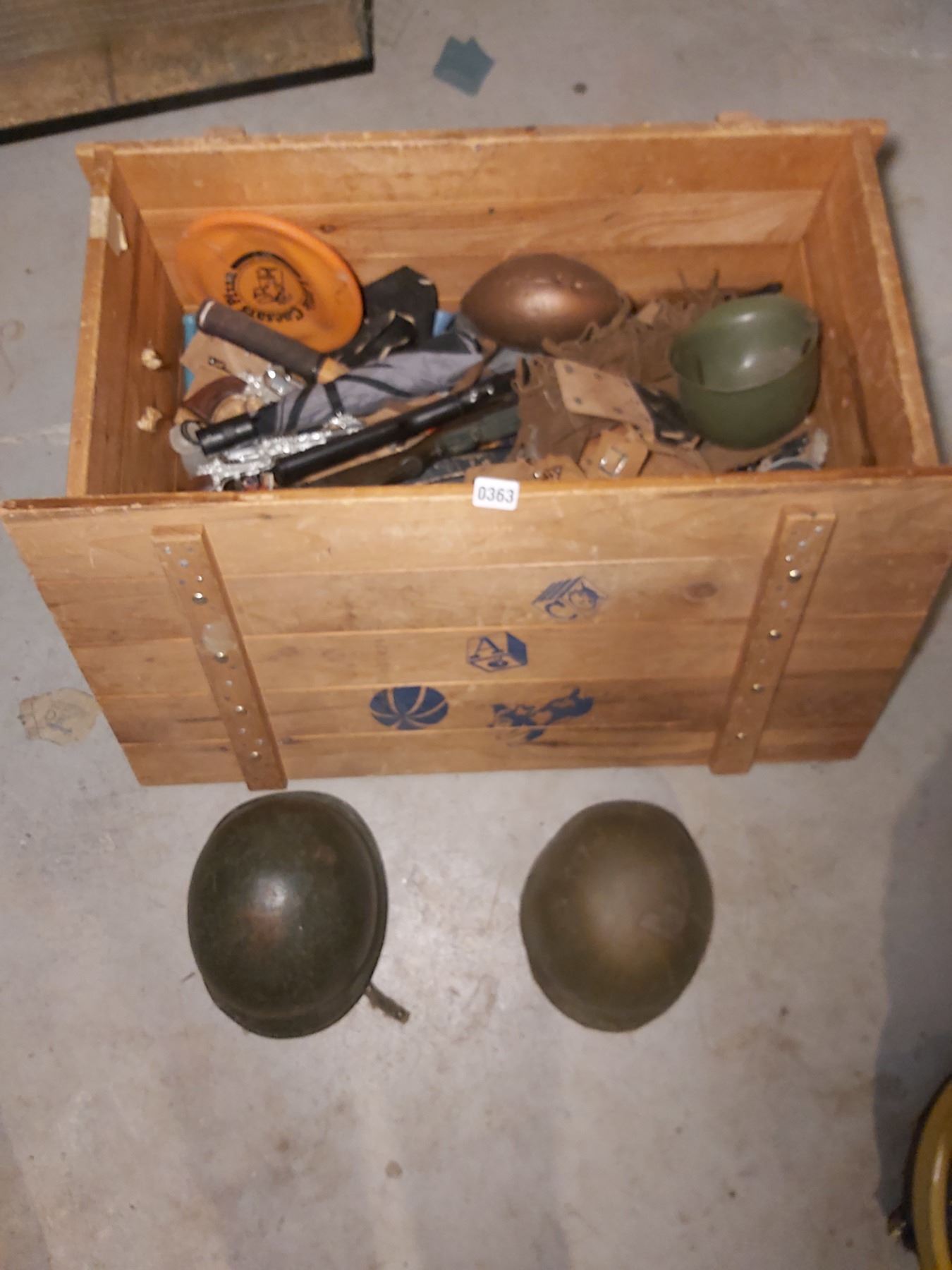Wooden toy chest with army toys, including 2 World War 2 helmets (35" W, 18" D, 15" H)