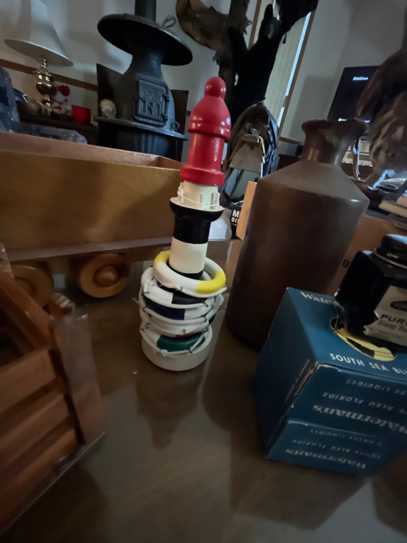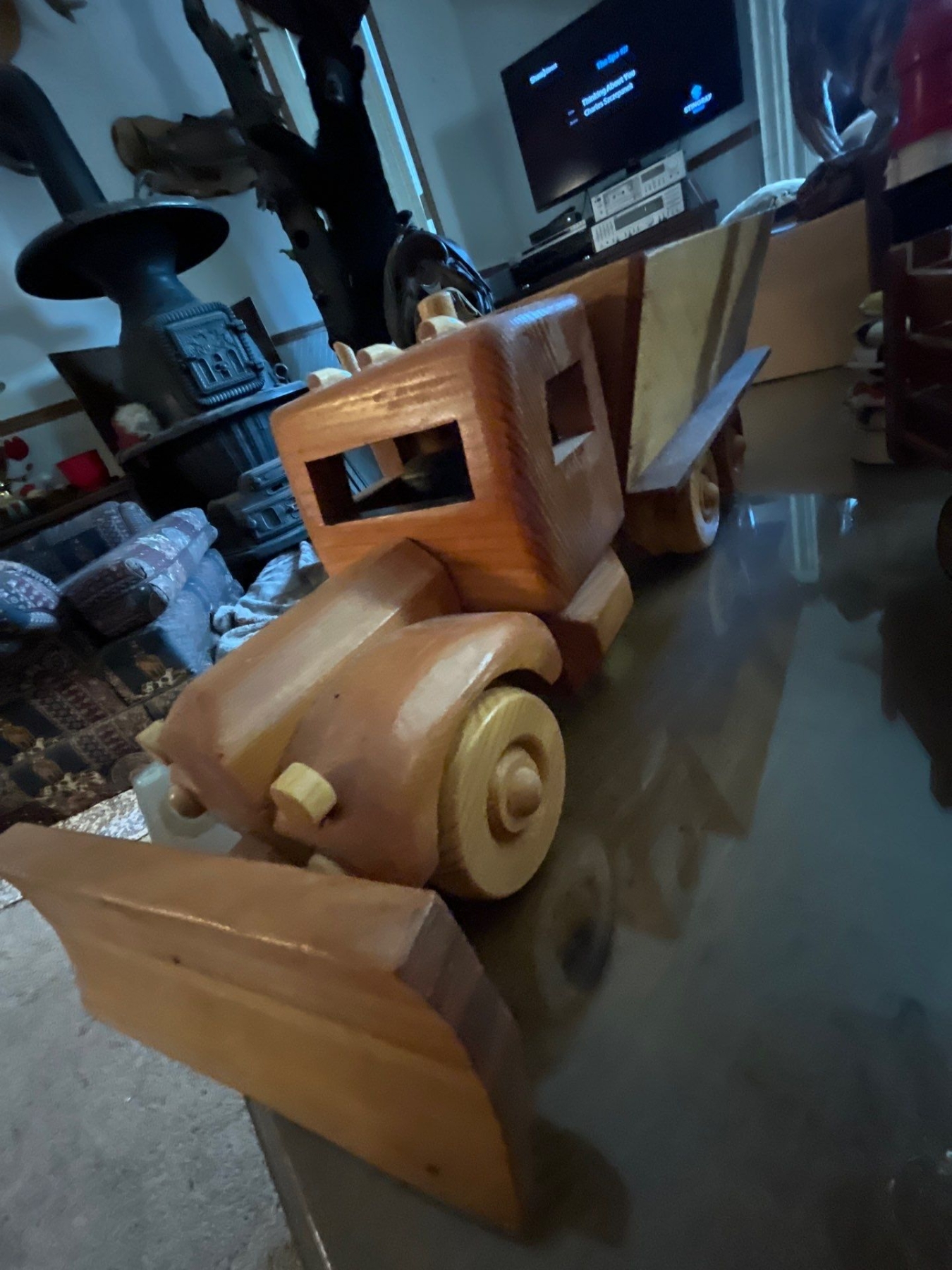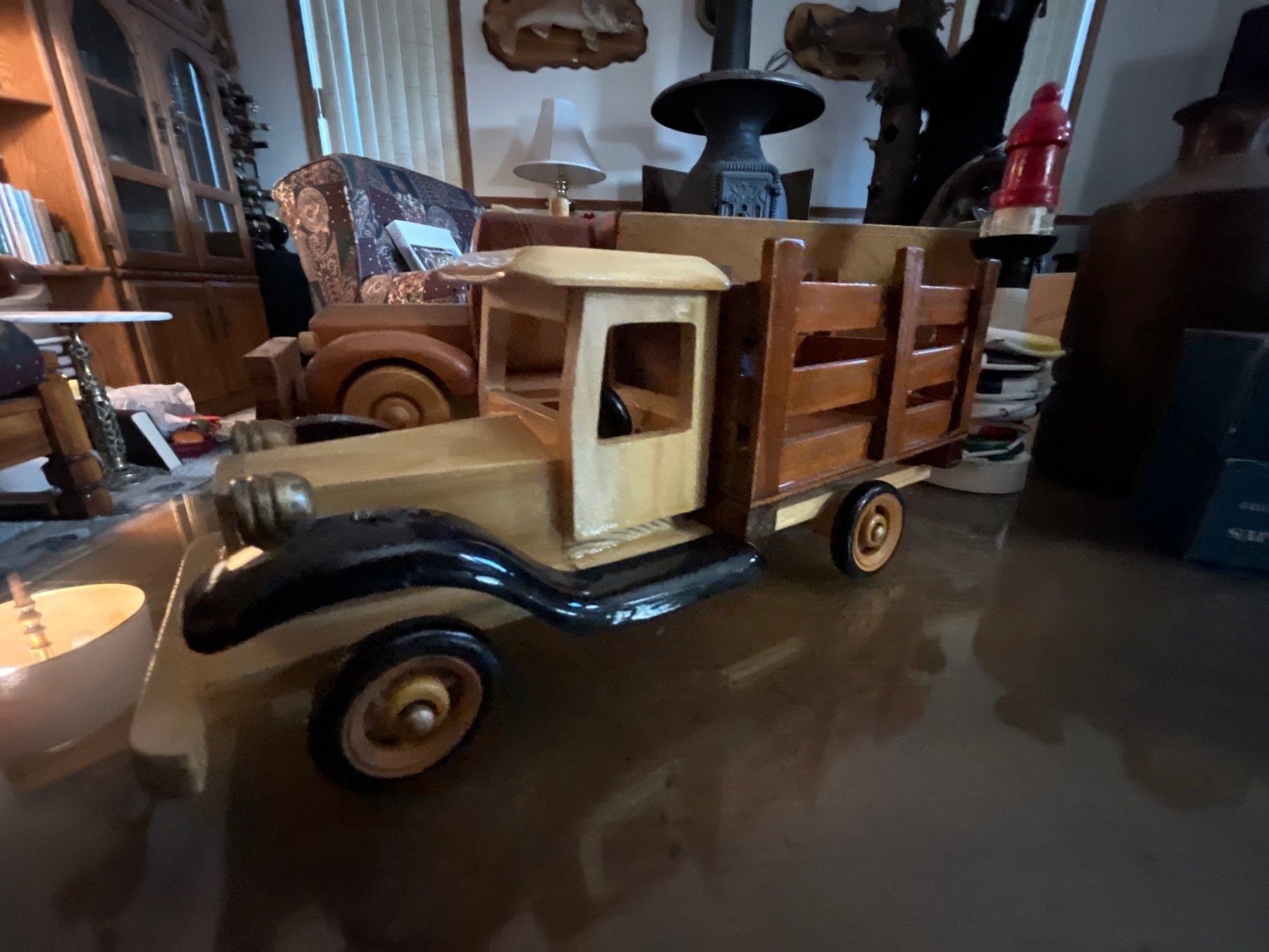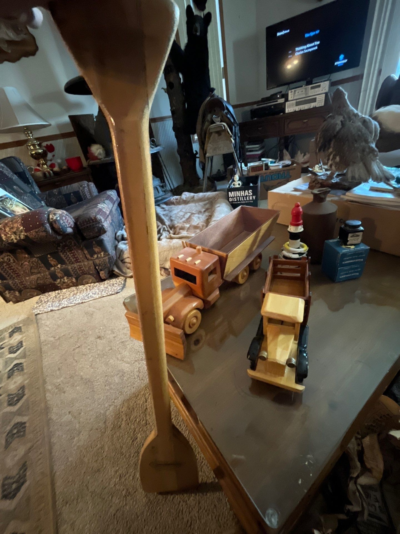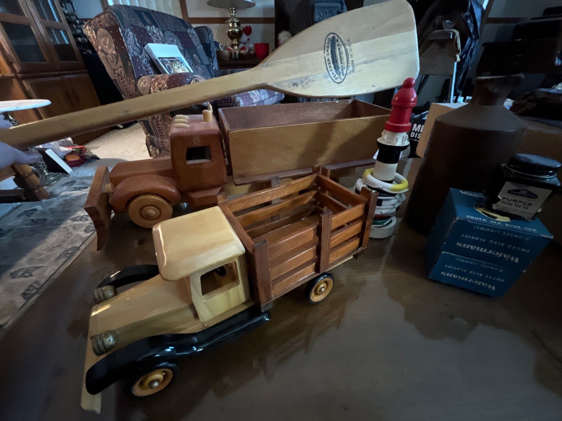 Wooden toy trucks, vintage ink for ink walls, small wooden paddle and light wooden lighthouse game.