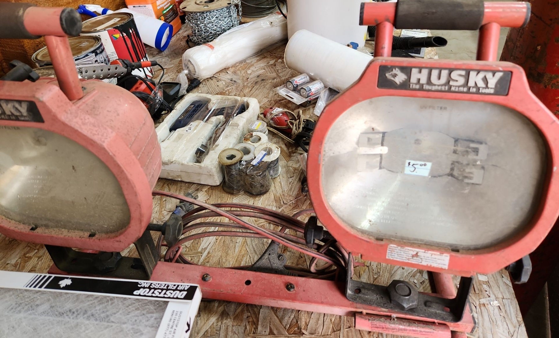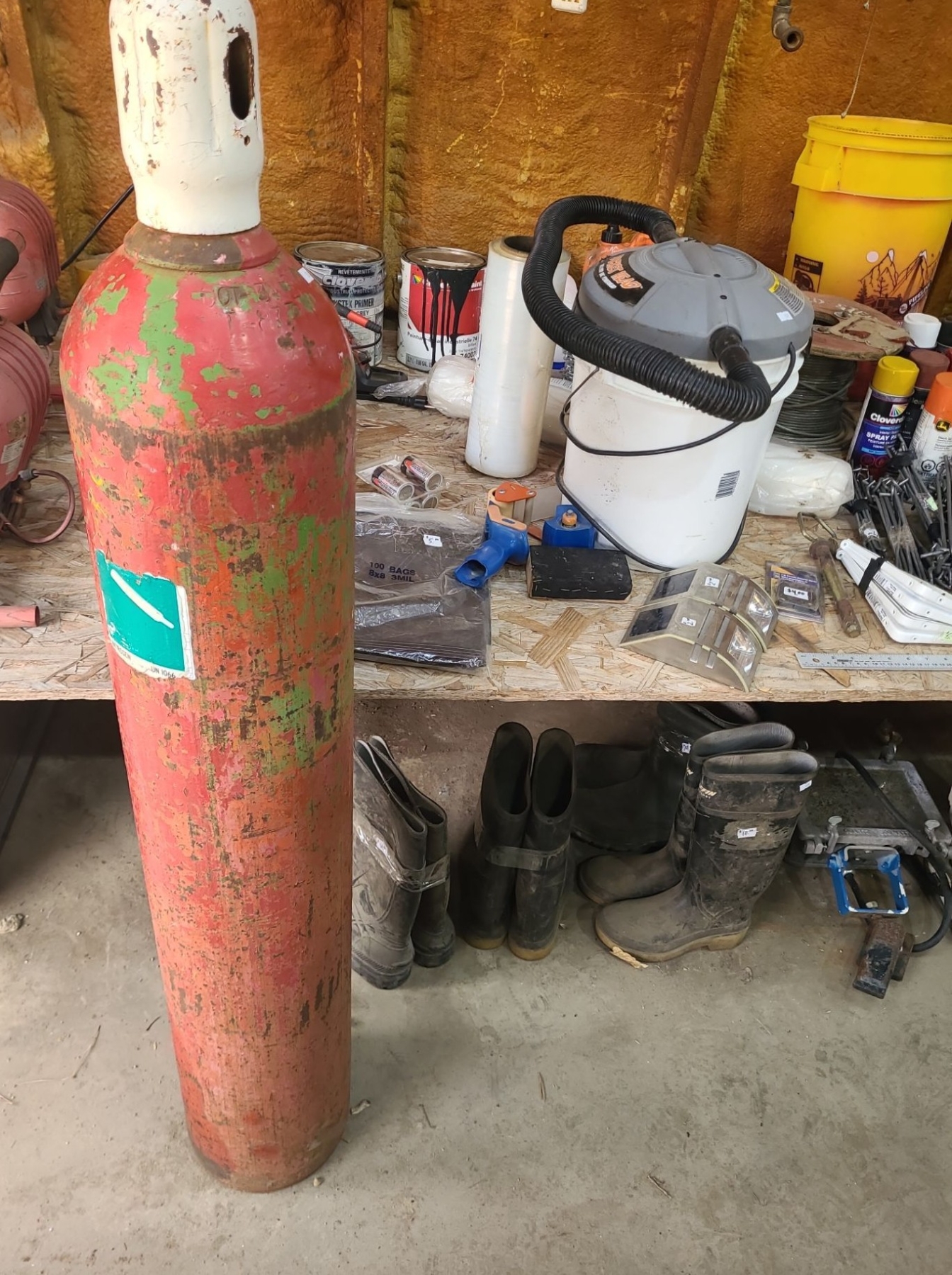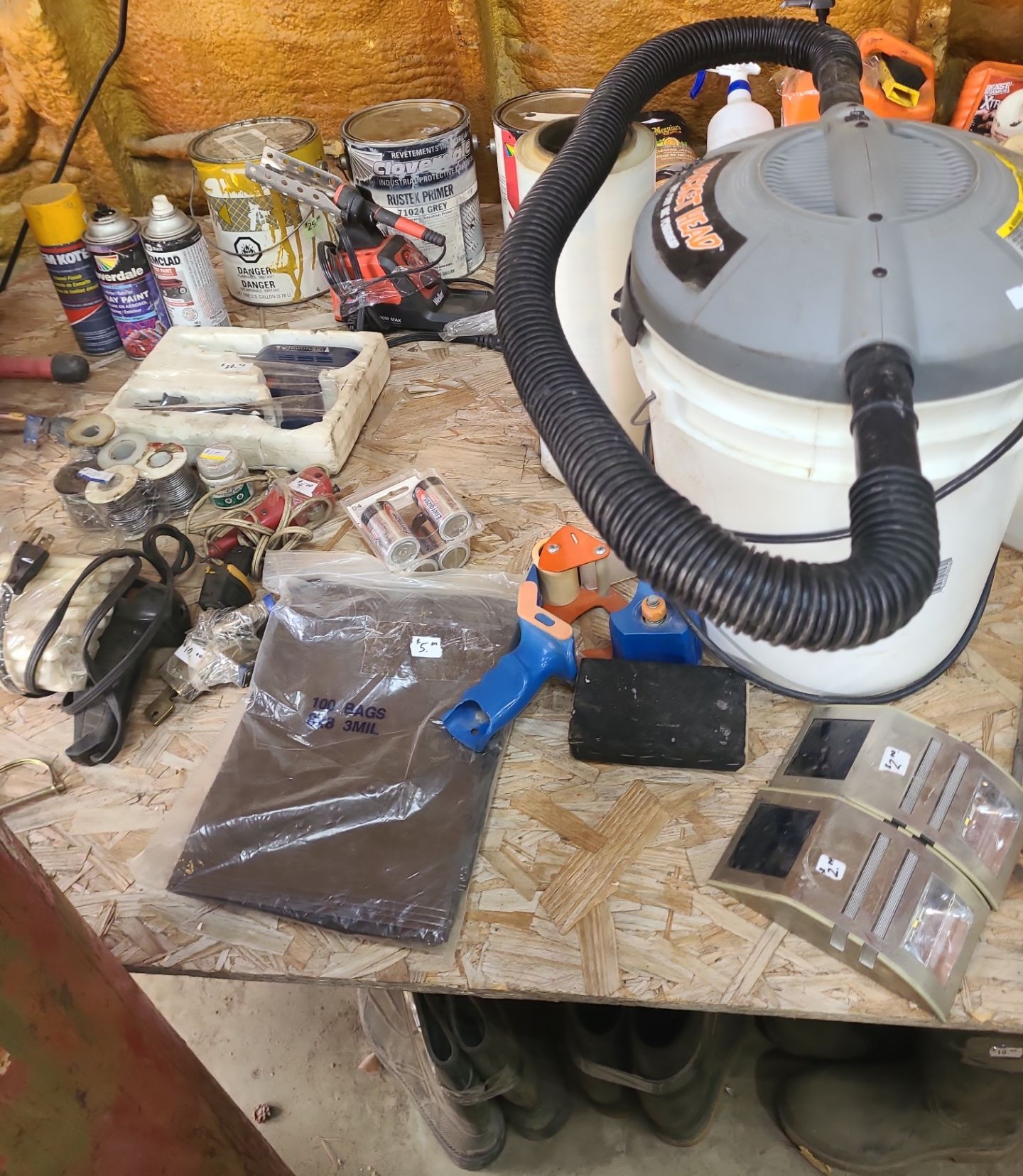 Worklights, Nitrogen Canister, Buckethead Wet/ Dry Vac, Rubber Boots Folding Table & more