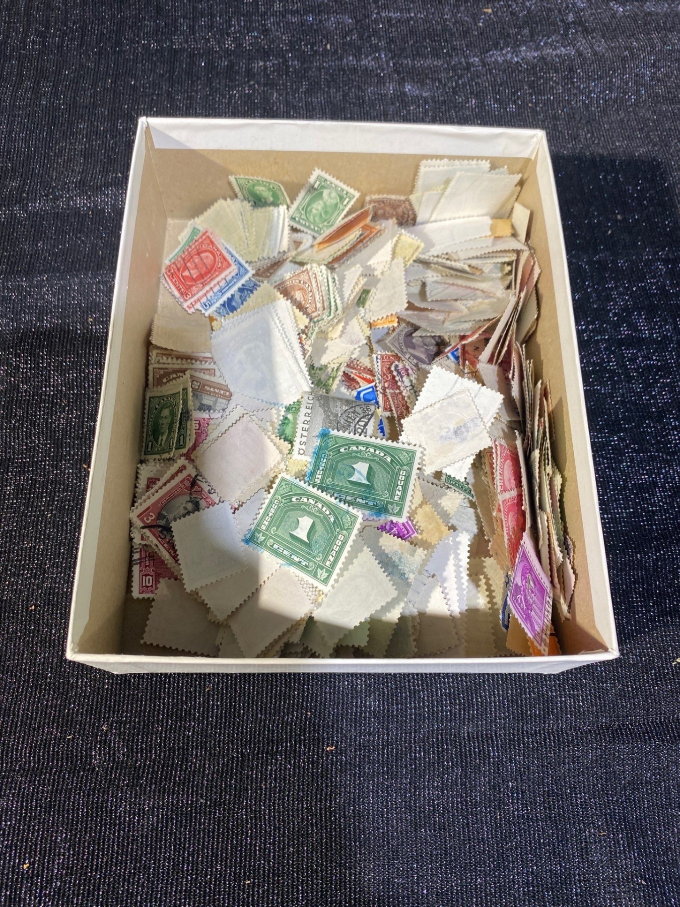 A boxed assortment of vintage world postage stamps gathered from various countries and eras. Includes a mix of used and unused examples featuring diverse themes, colours, and cancellations. Estate-sourced and unsorted, offering strong discovery potential for collectors and resellers seeking global variety.