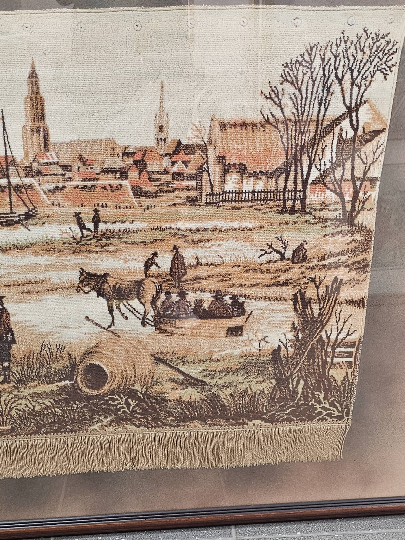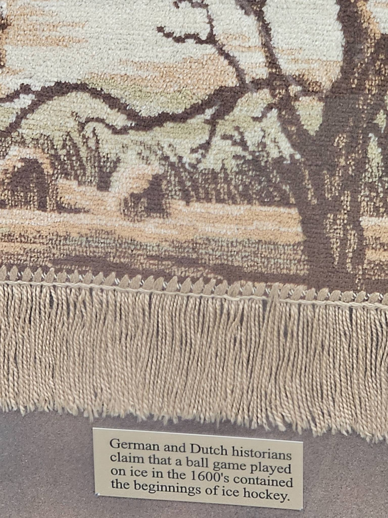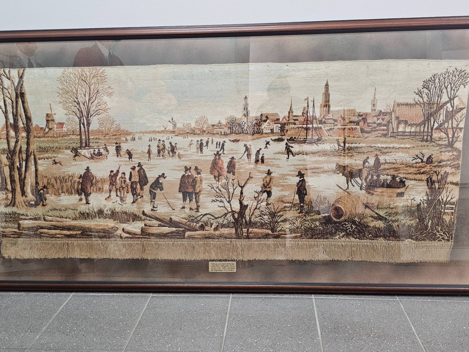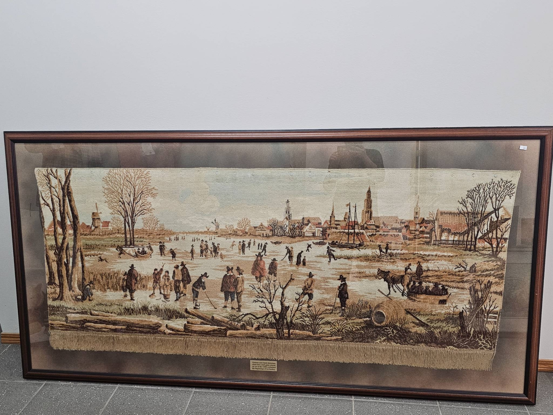 This 77-inch wide by 39-inch tall woven textile depicts a 17th-century winter scene with figures ice skating and partaking in rural activities. Detailed craftsmanship highlights a historical moment, framed under glass in a wooden frame with subtle embellishments. The plaque mentions ties to the origins of ice hockey, adding cultural significance to this piece.