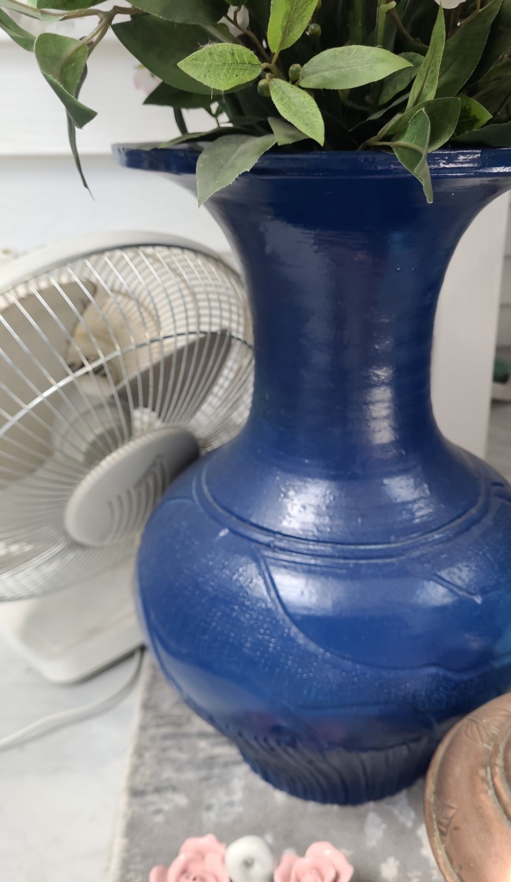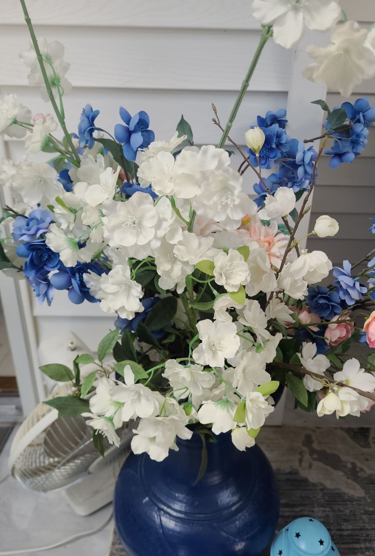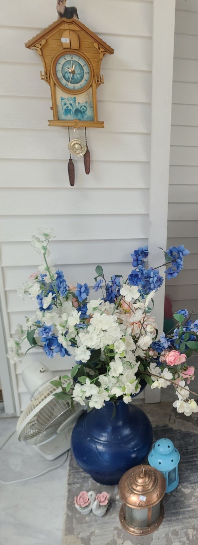 Yorkie Clock 10.5 X 23, Fan, Lanterns, Blue Floor Vase 18 T, Artificial Flowers, Runner 37 X 119