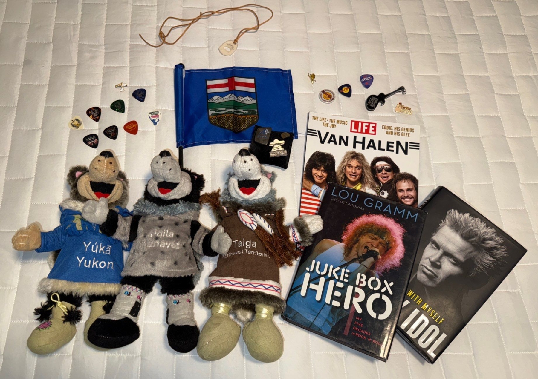 Yukon Wolf Pack, Guitar Picks, & Collectible Pins & Flag w/ Books & Magazine