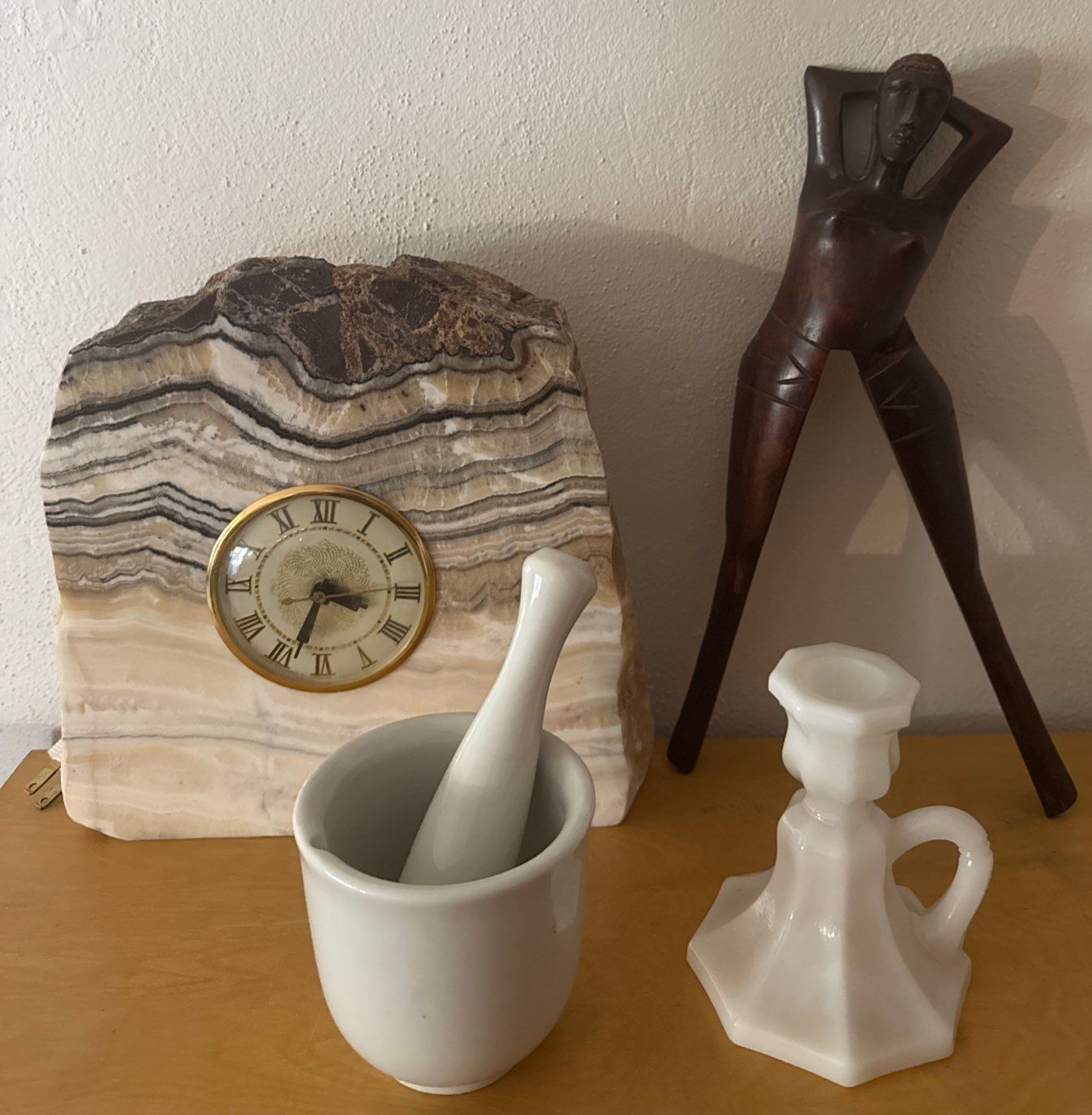 Zebra Calcite Mantel Clock w/ Erotica Nude Woman Nut Cracker 11T Mortar & Pestel & More