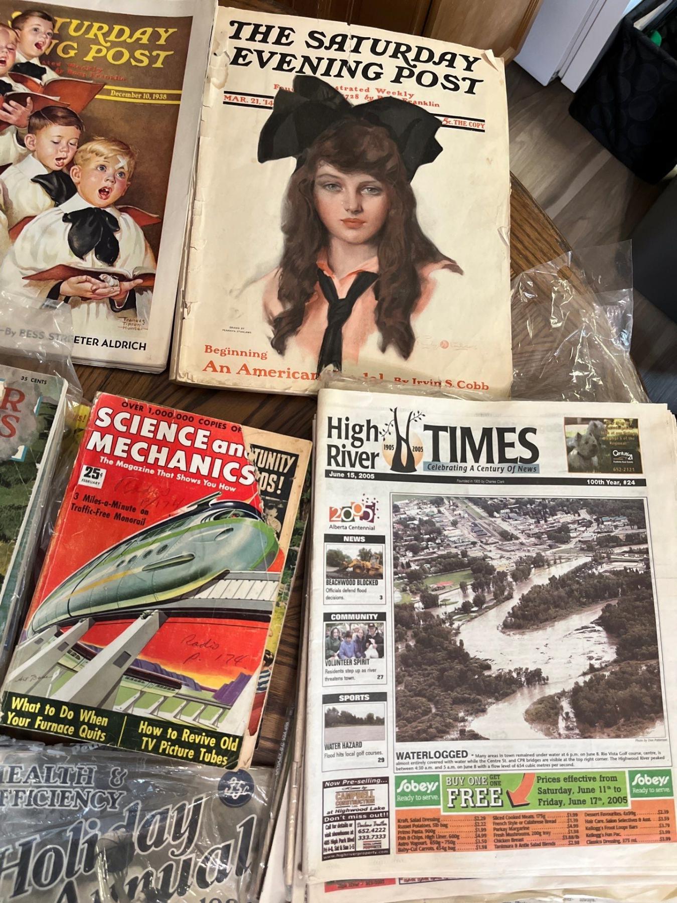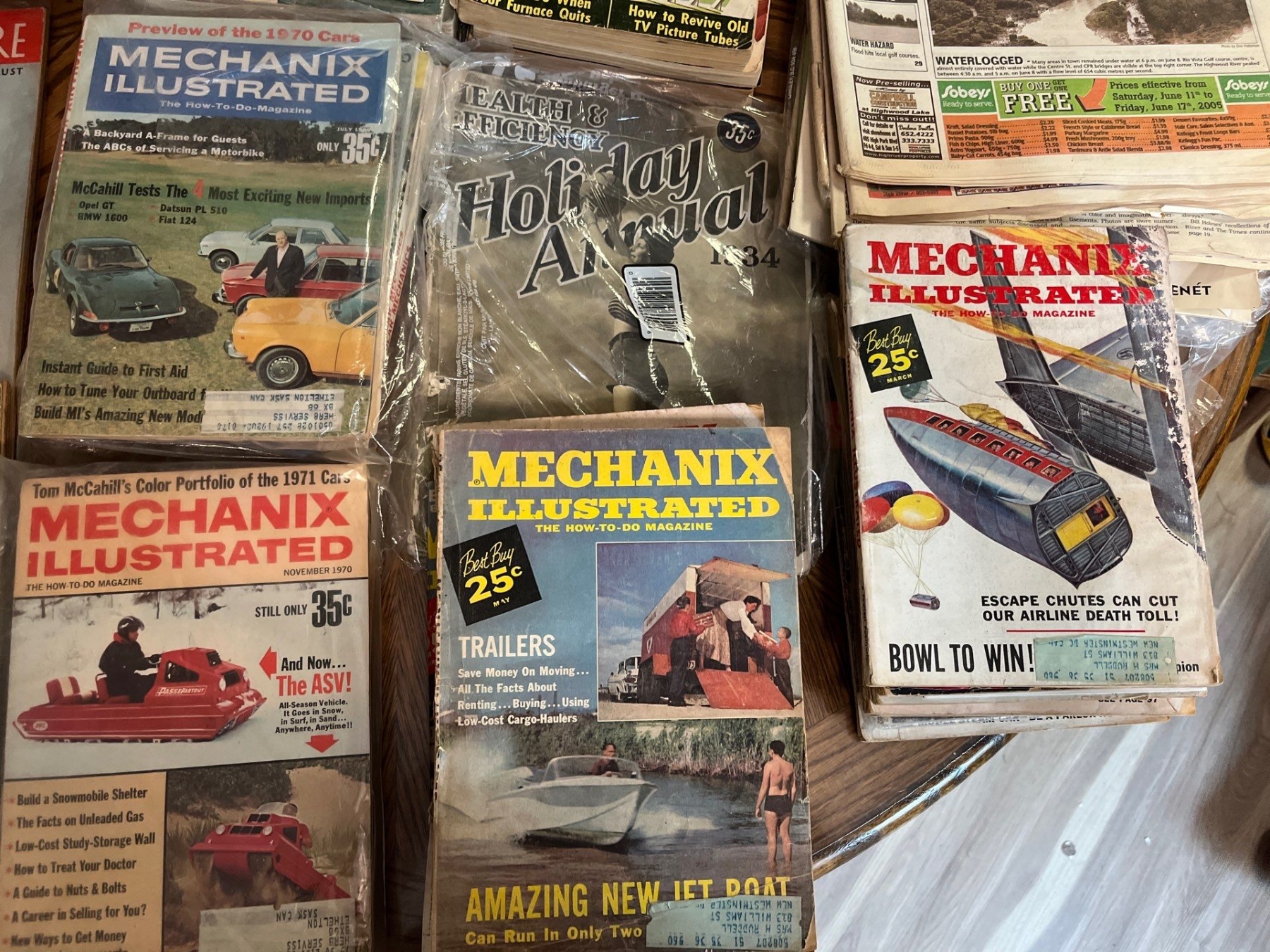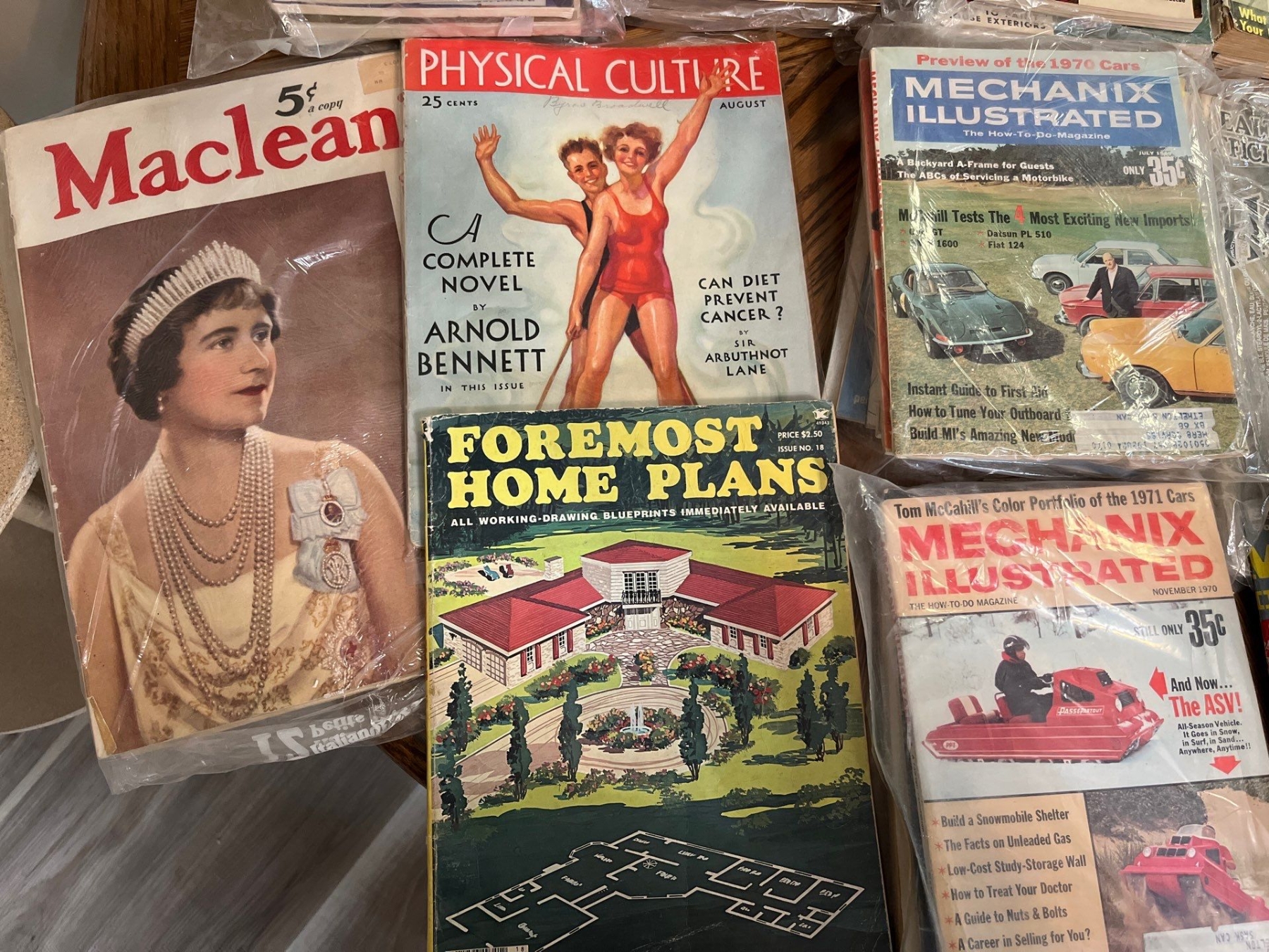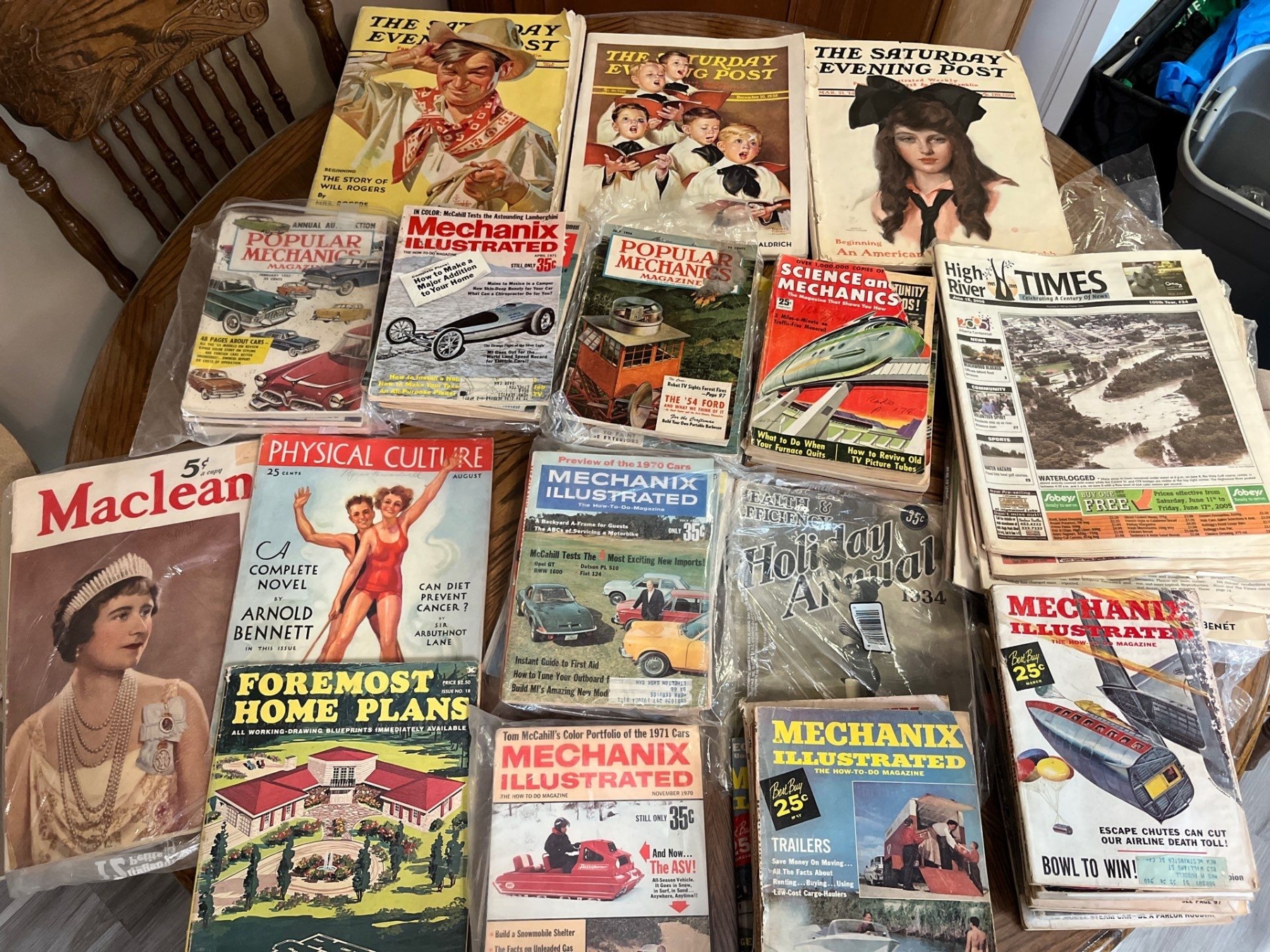 a large collection of Mechanic , illustrated , popular mechanics, physical culture, MacLean's magazine, magazines range from the early 1900s to around 1960 and a number of other vintage printed items items range from $5 to $45 hundreds of them
