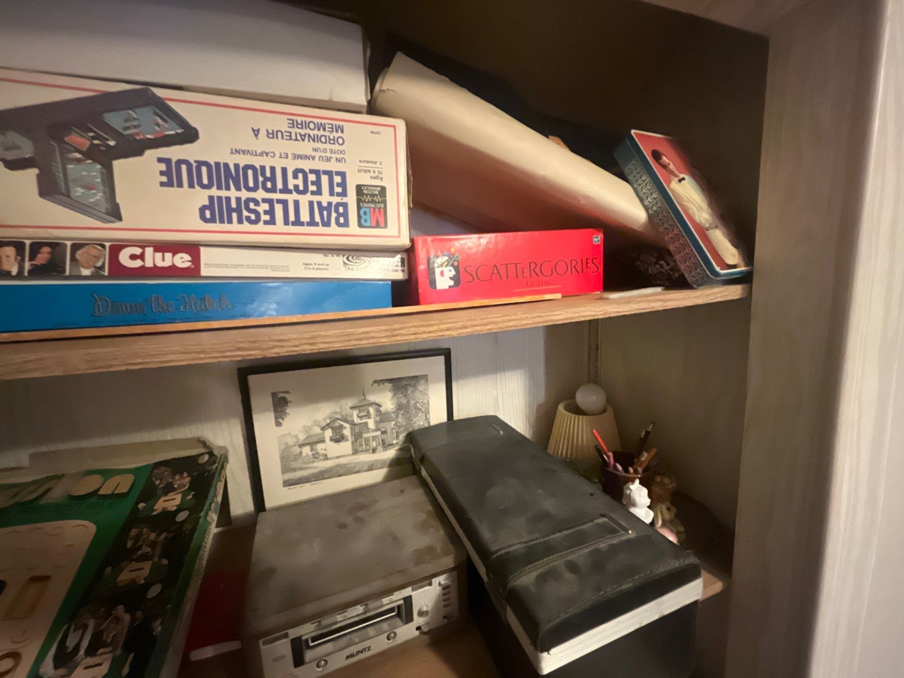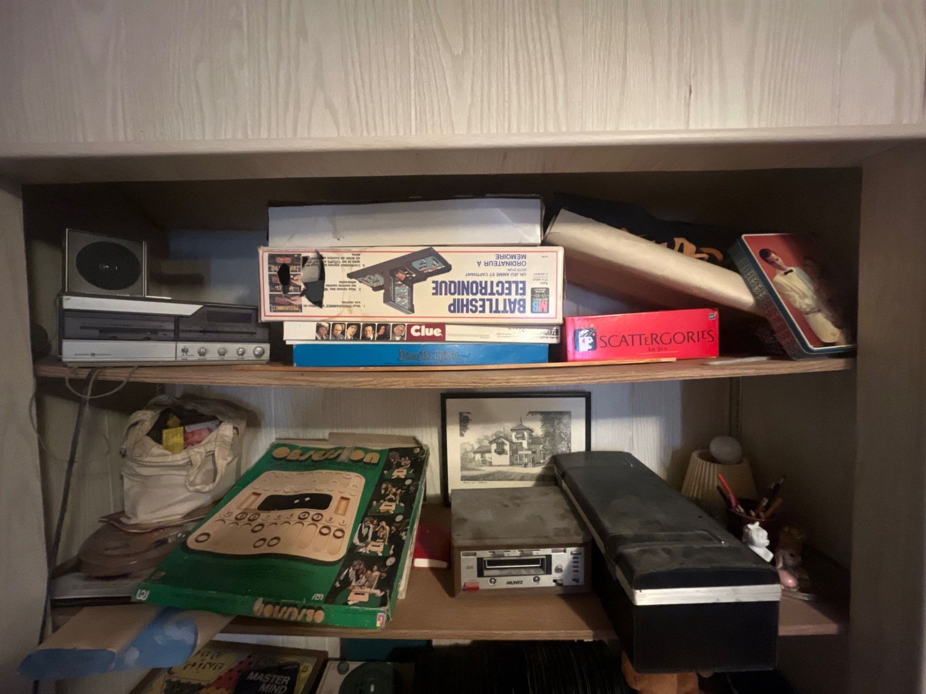 a number of vintage games, clue, battleship category, vintage casino game, generally electric cassette deck with cassettes and a Muntz Atrack player with a track