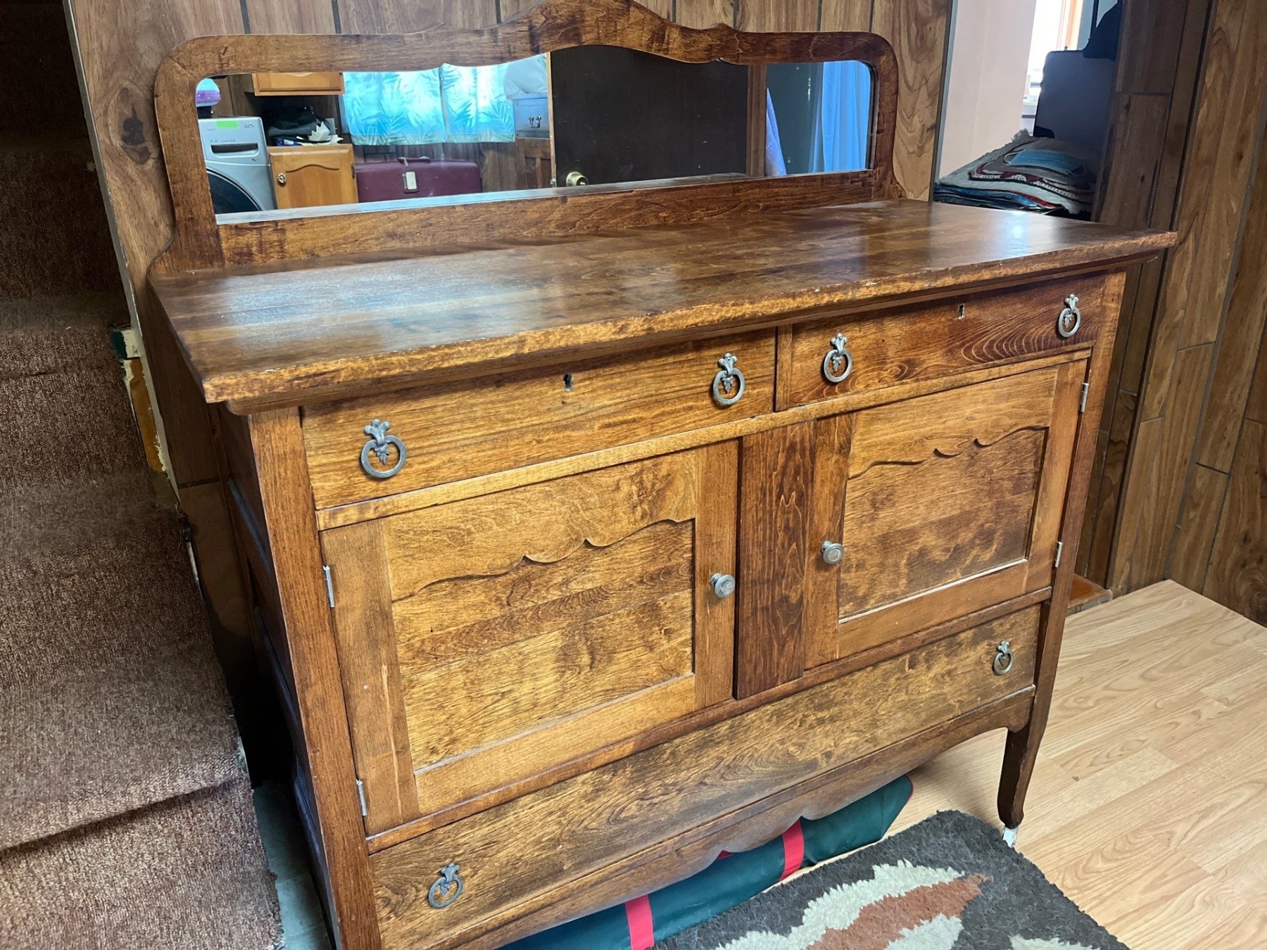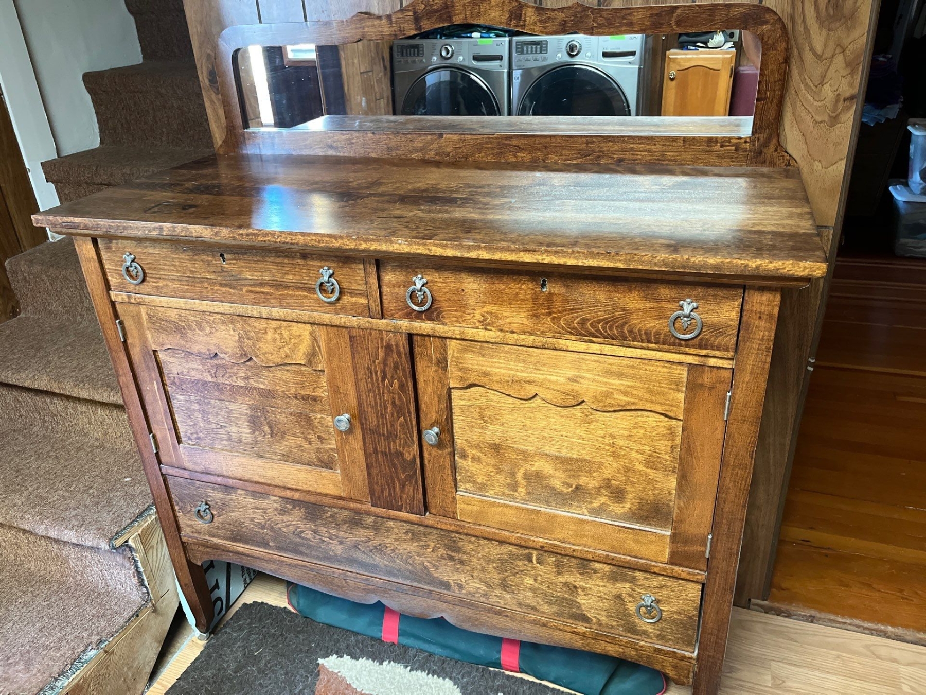 antique beautifully, handcrafted, solid wood hutch with all original hardware, including mirror in beautiful condition49” h 46”L 20”d