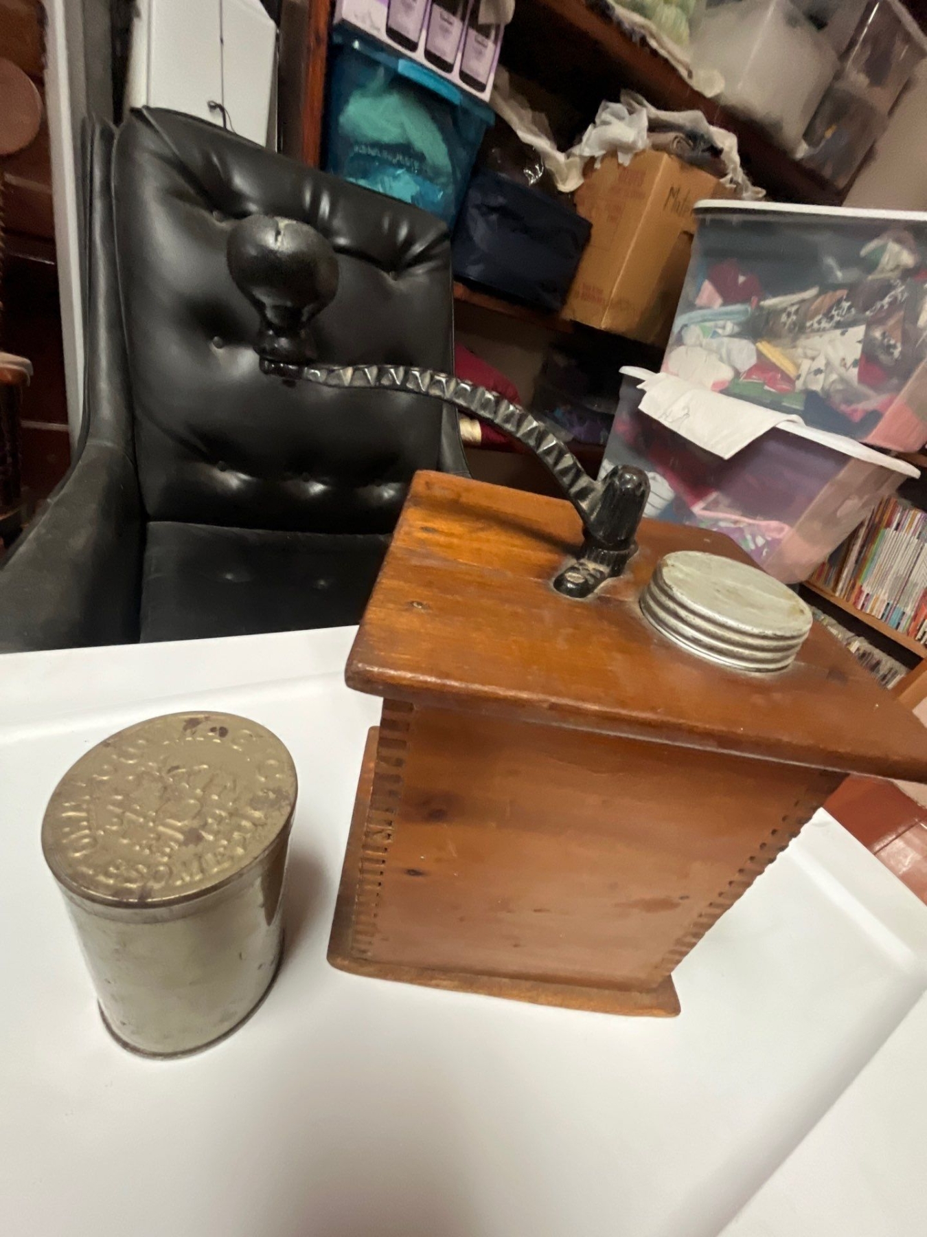 antique coffee, grinder, and vintage tin