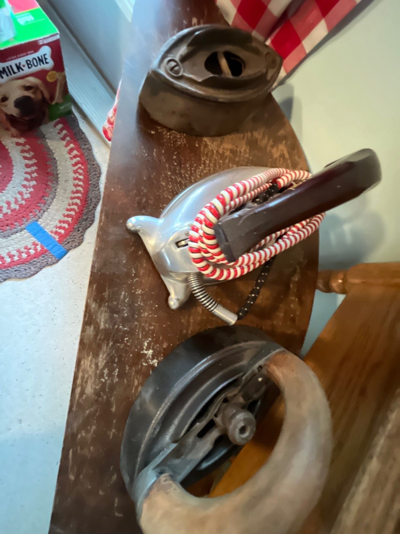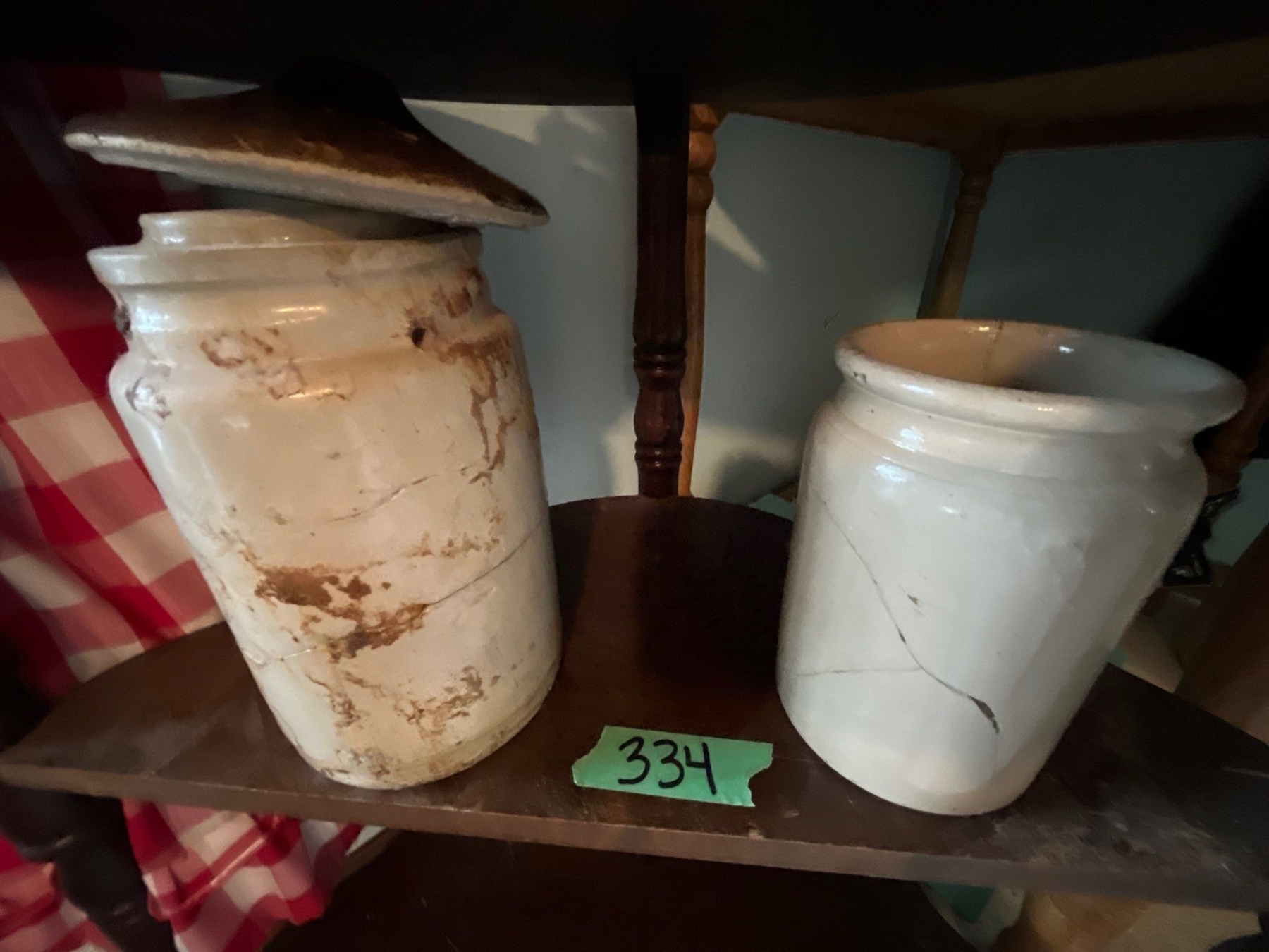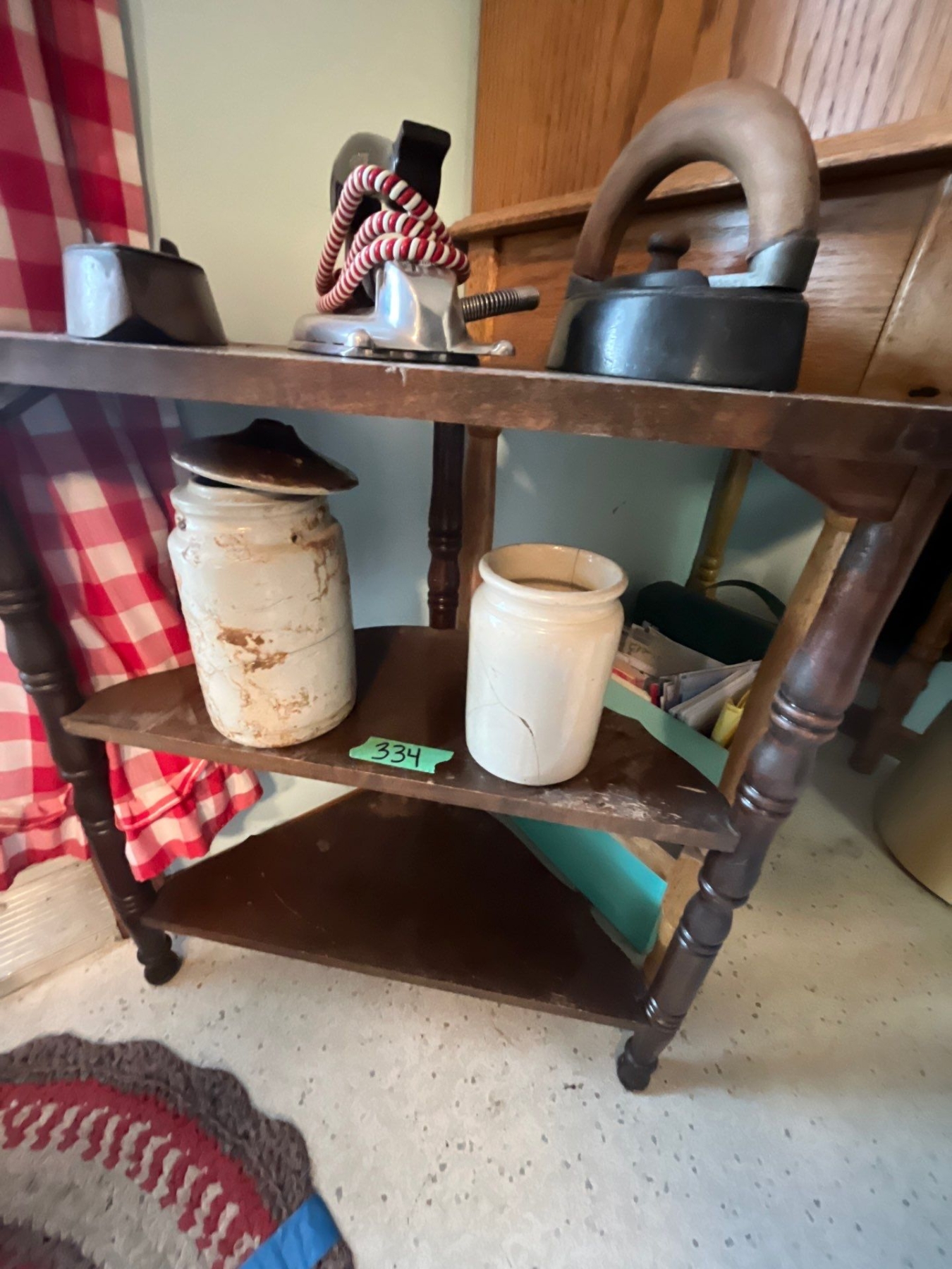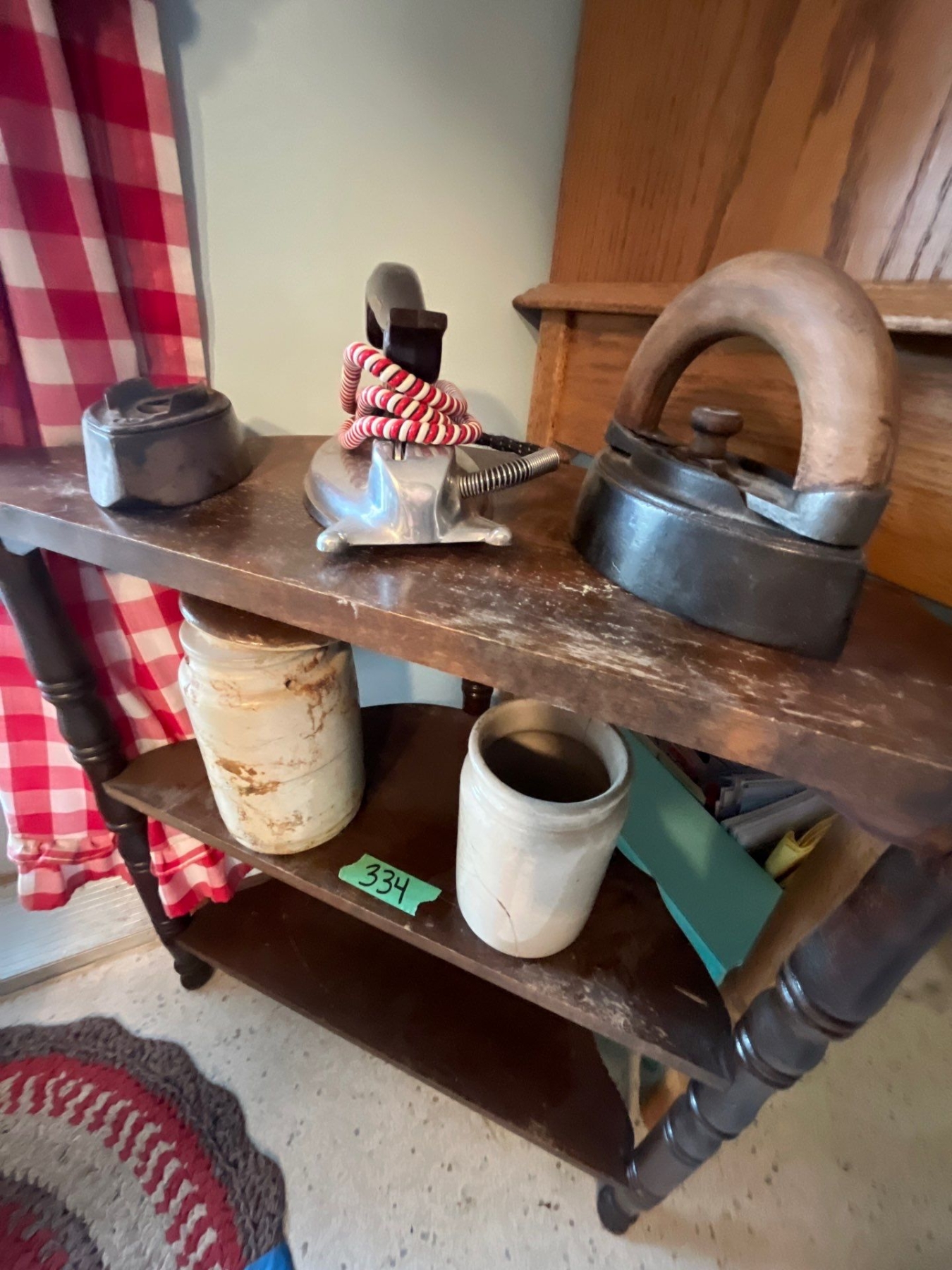 antique small corner table with two antique irons, one with folder and a vintage electric iron and two small crocs with some damage shelf height, 24 inches width 24 inches depth 11 inches