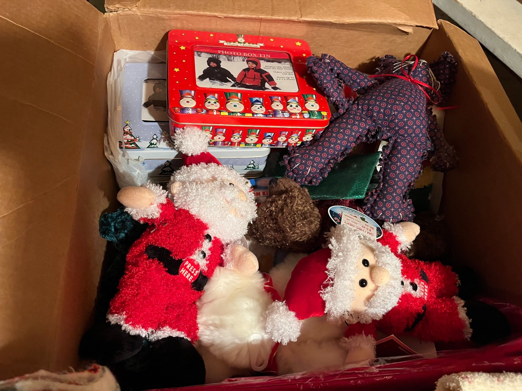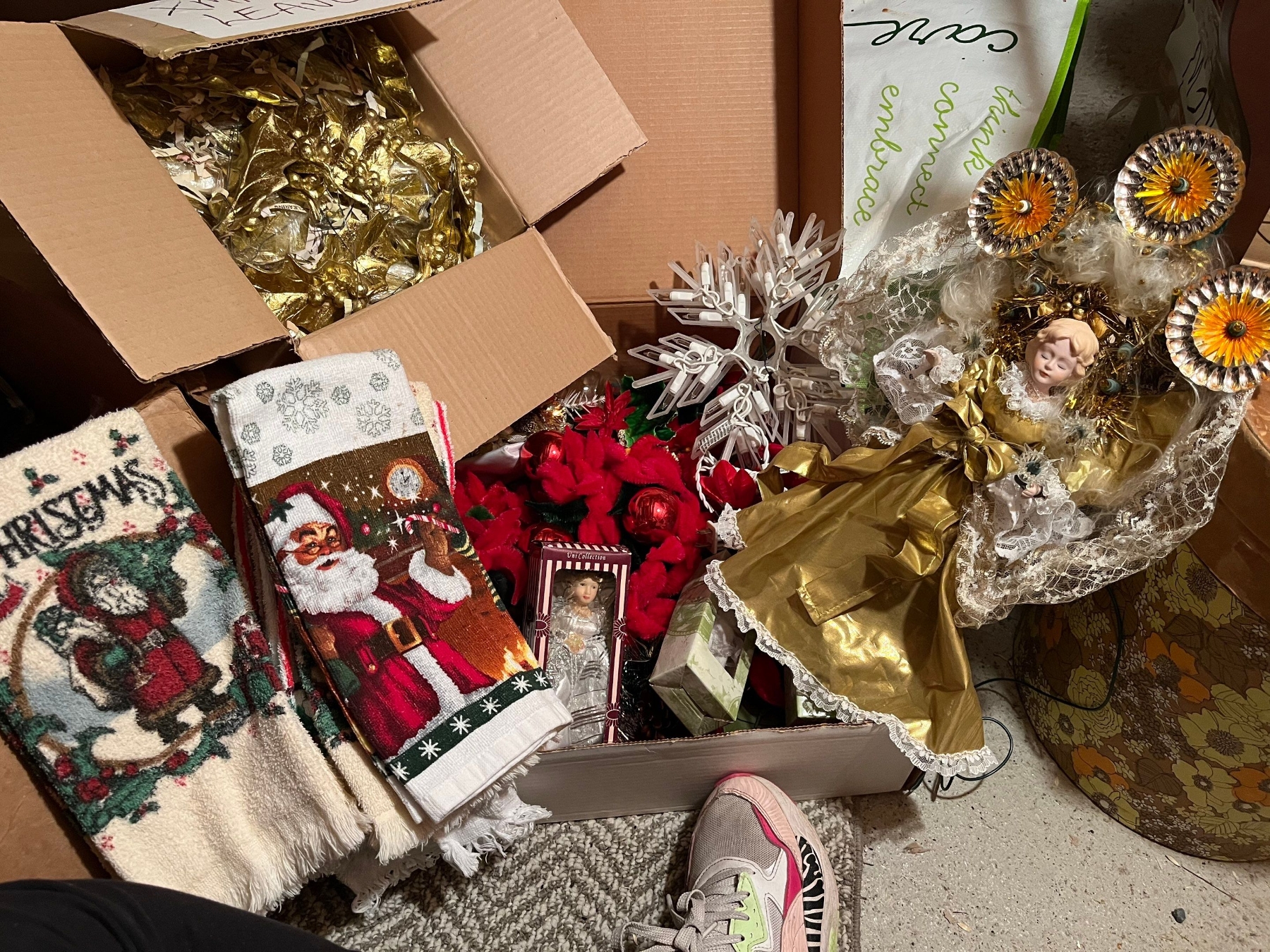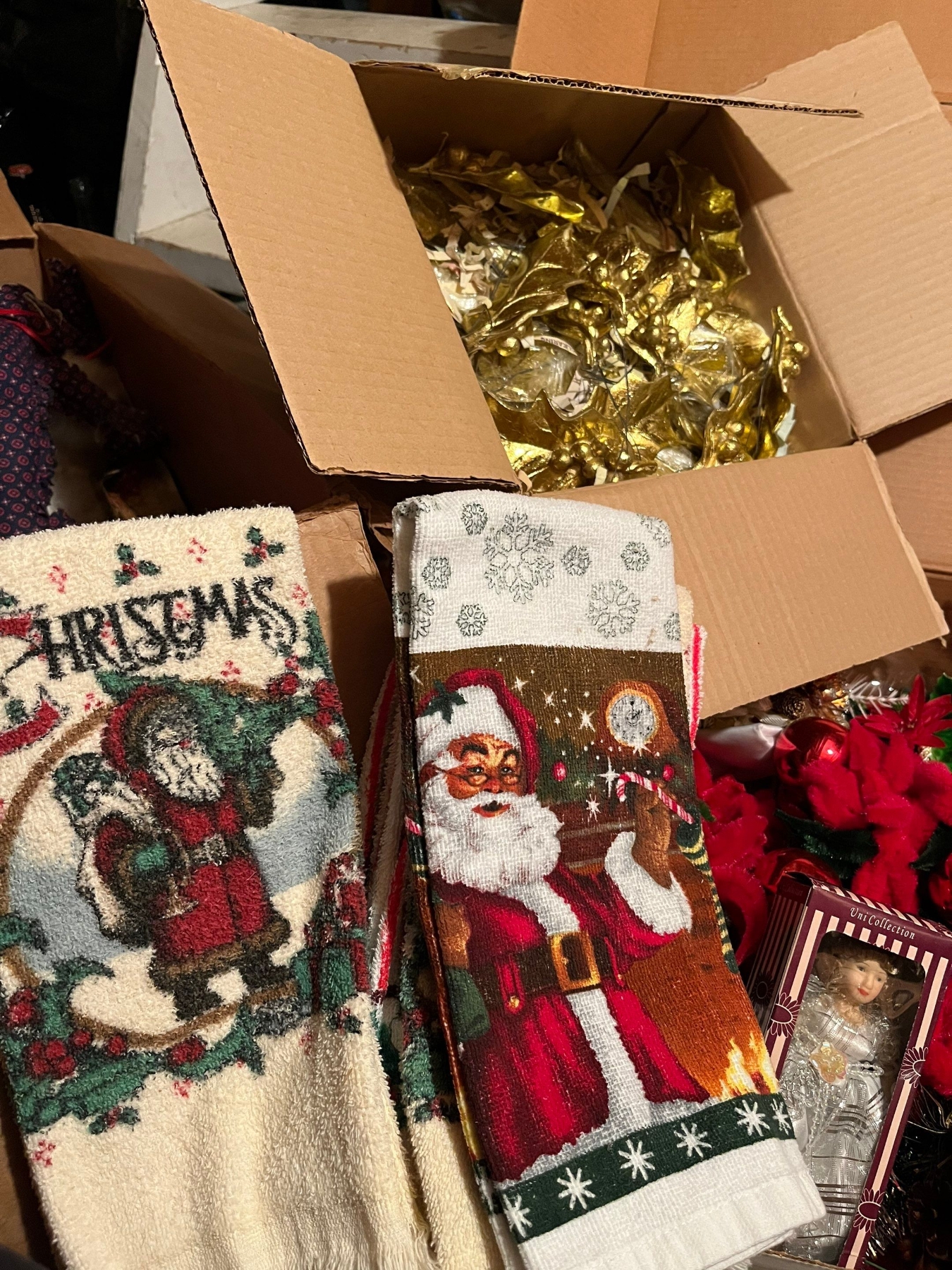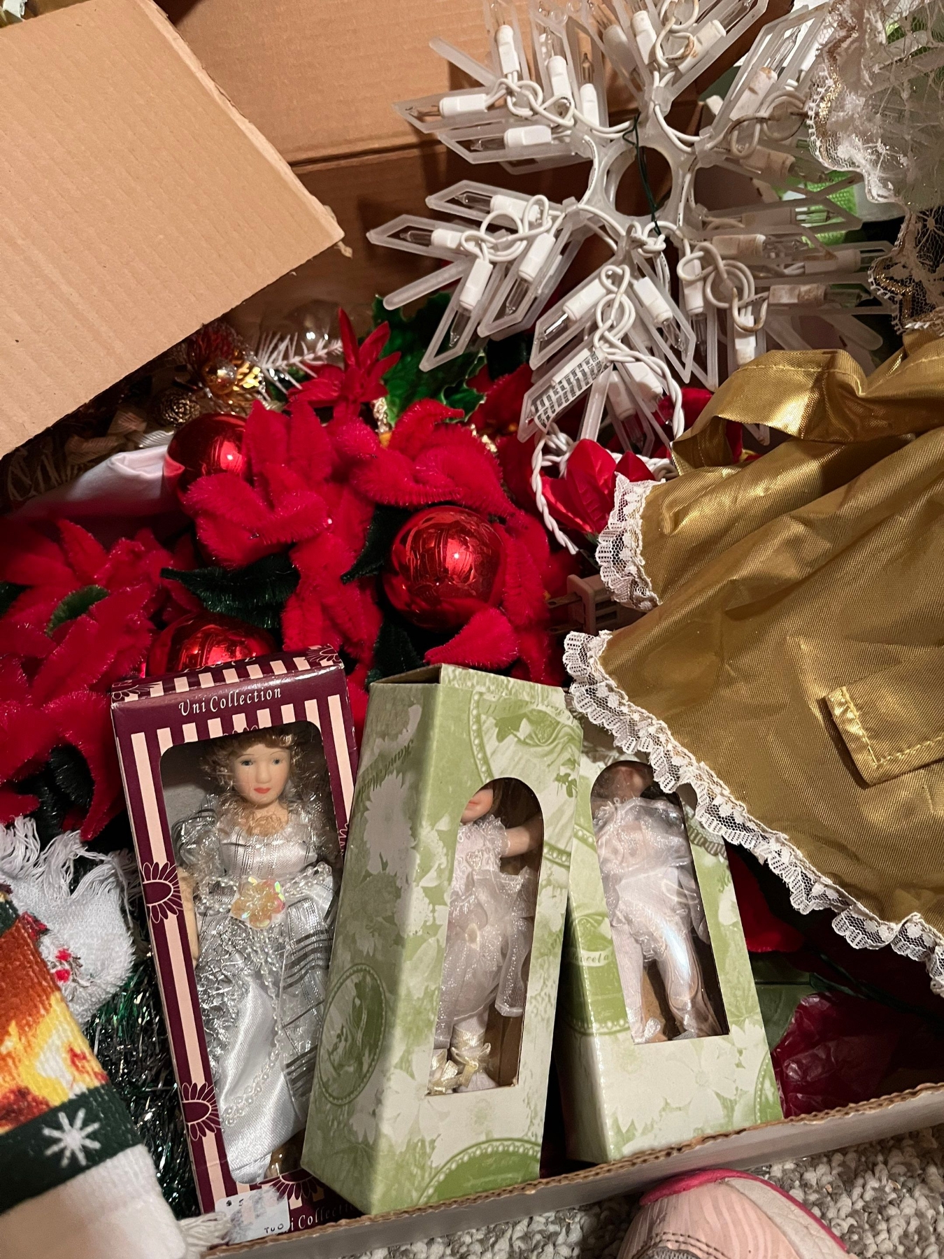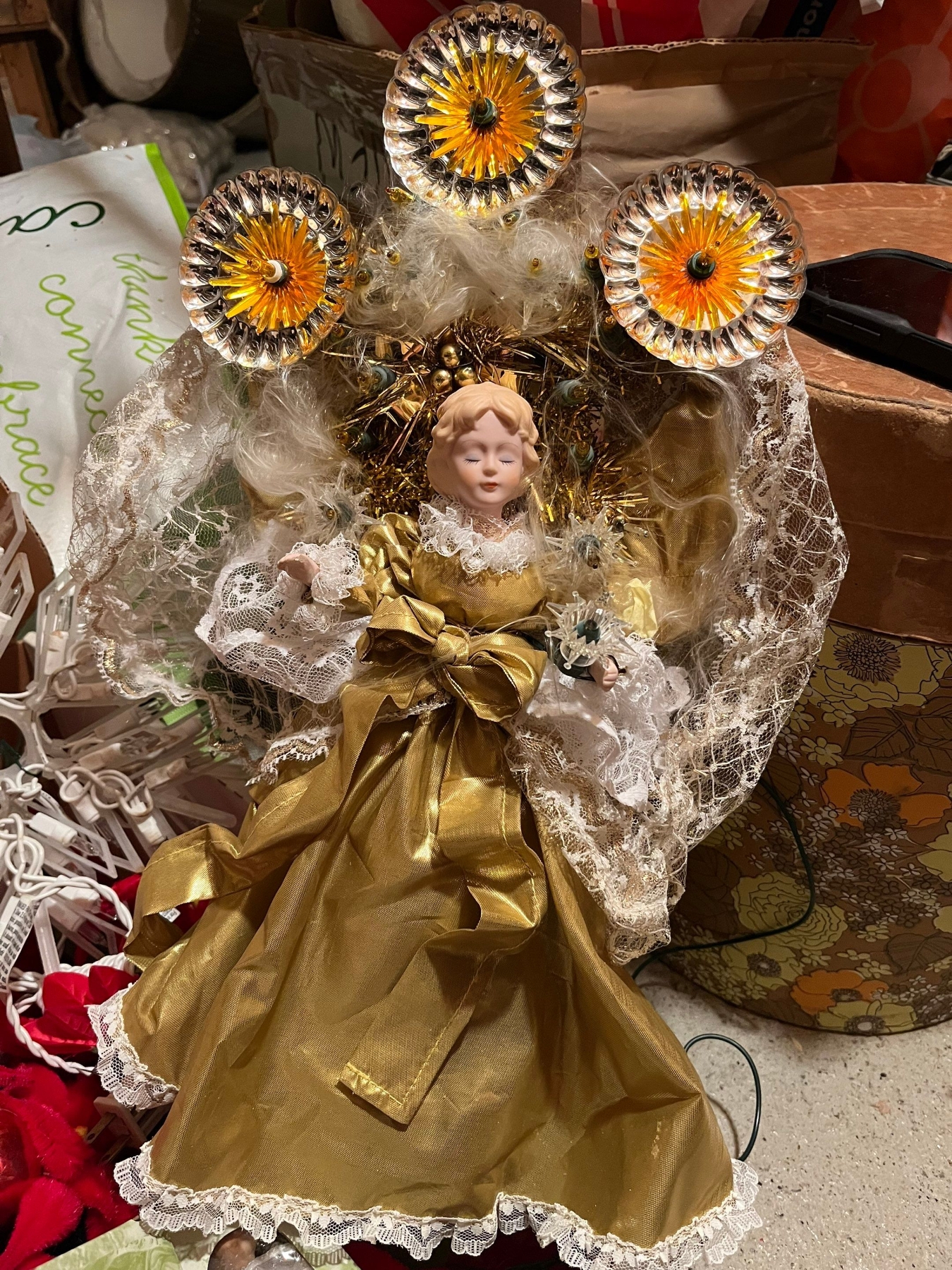 beautiful gold vintage leaves and elegant tree topper angel. Assortment of Christmas teddies tins that you can insert your family picture in tablecloth, hand towels, light up snowflake tree topper, antique ceramic little princess dolls and a wide assortment of poinsettias and glass Christmas decorations.