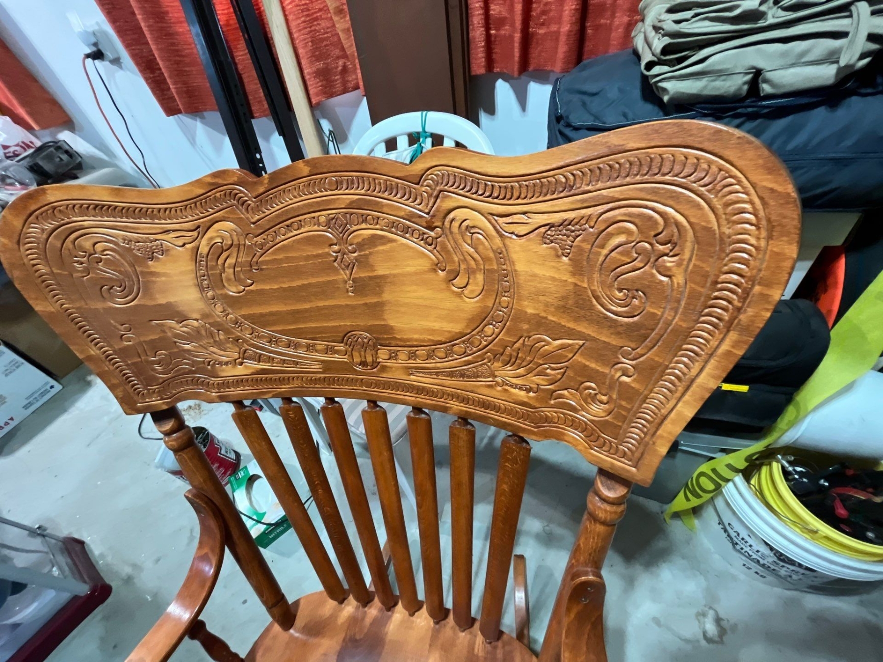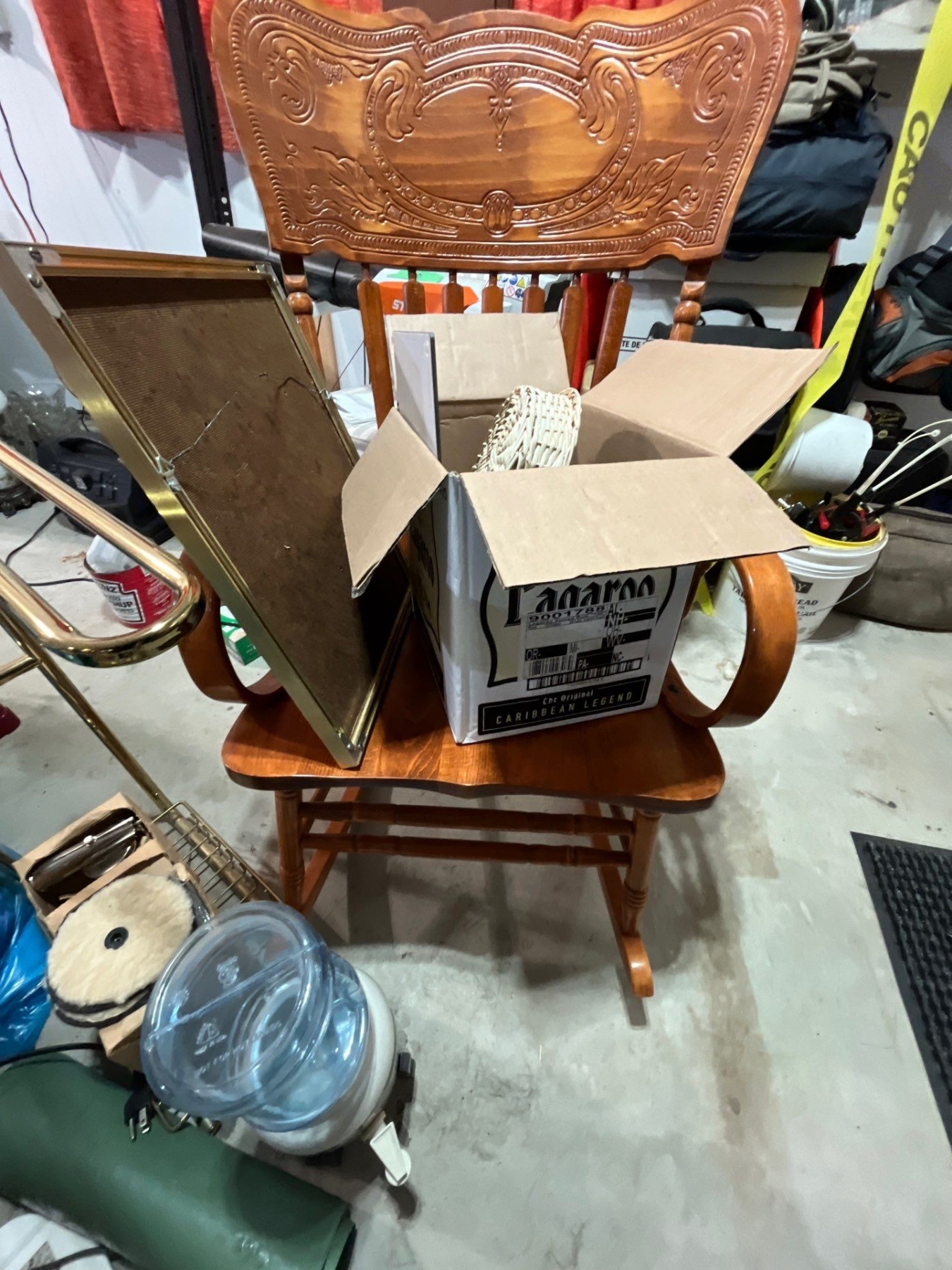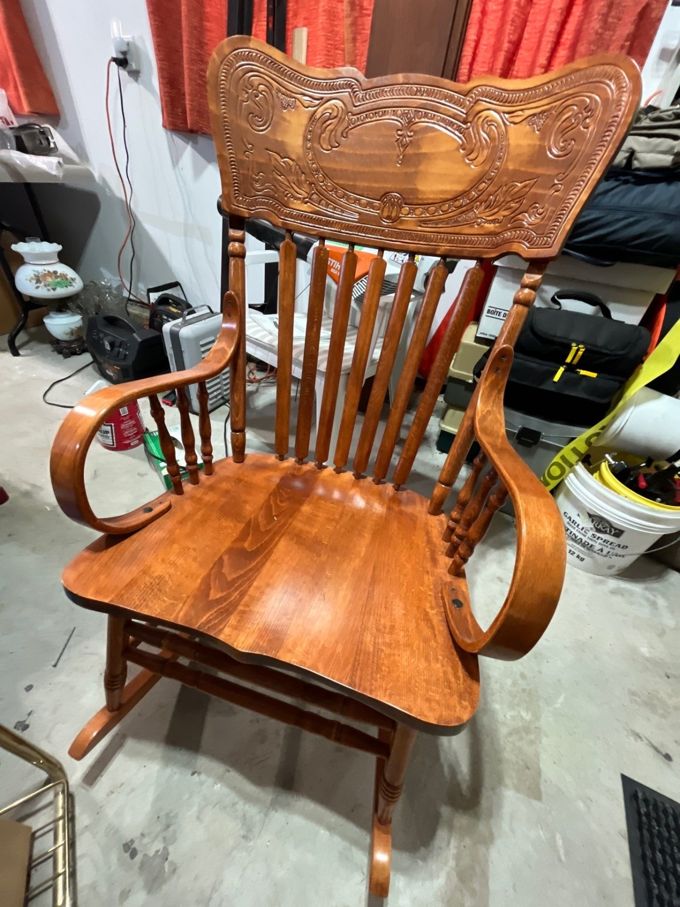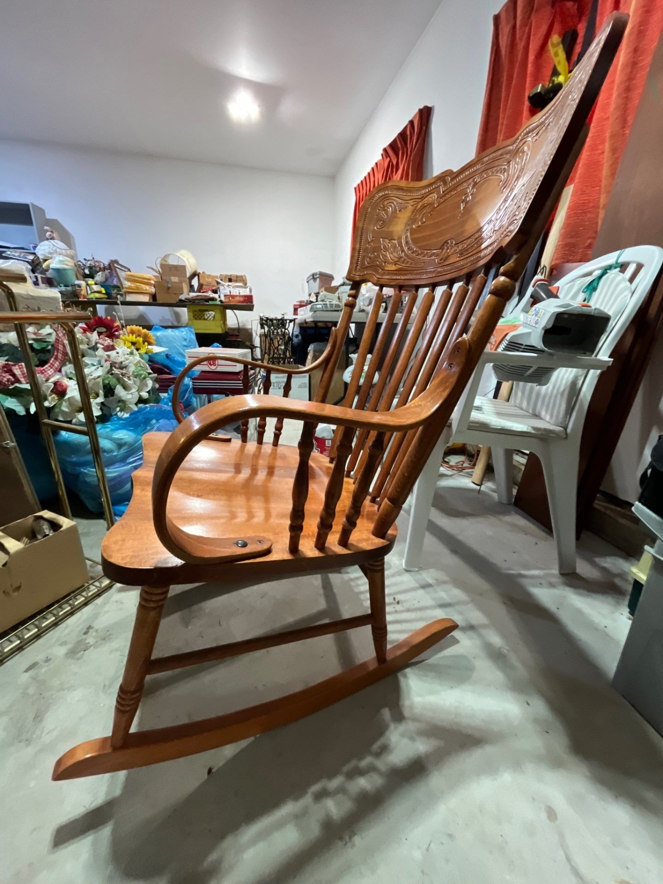 beautiful wood rocking chair with towel, hangers, water, jug, and other miscellaneous items all sold