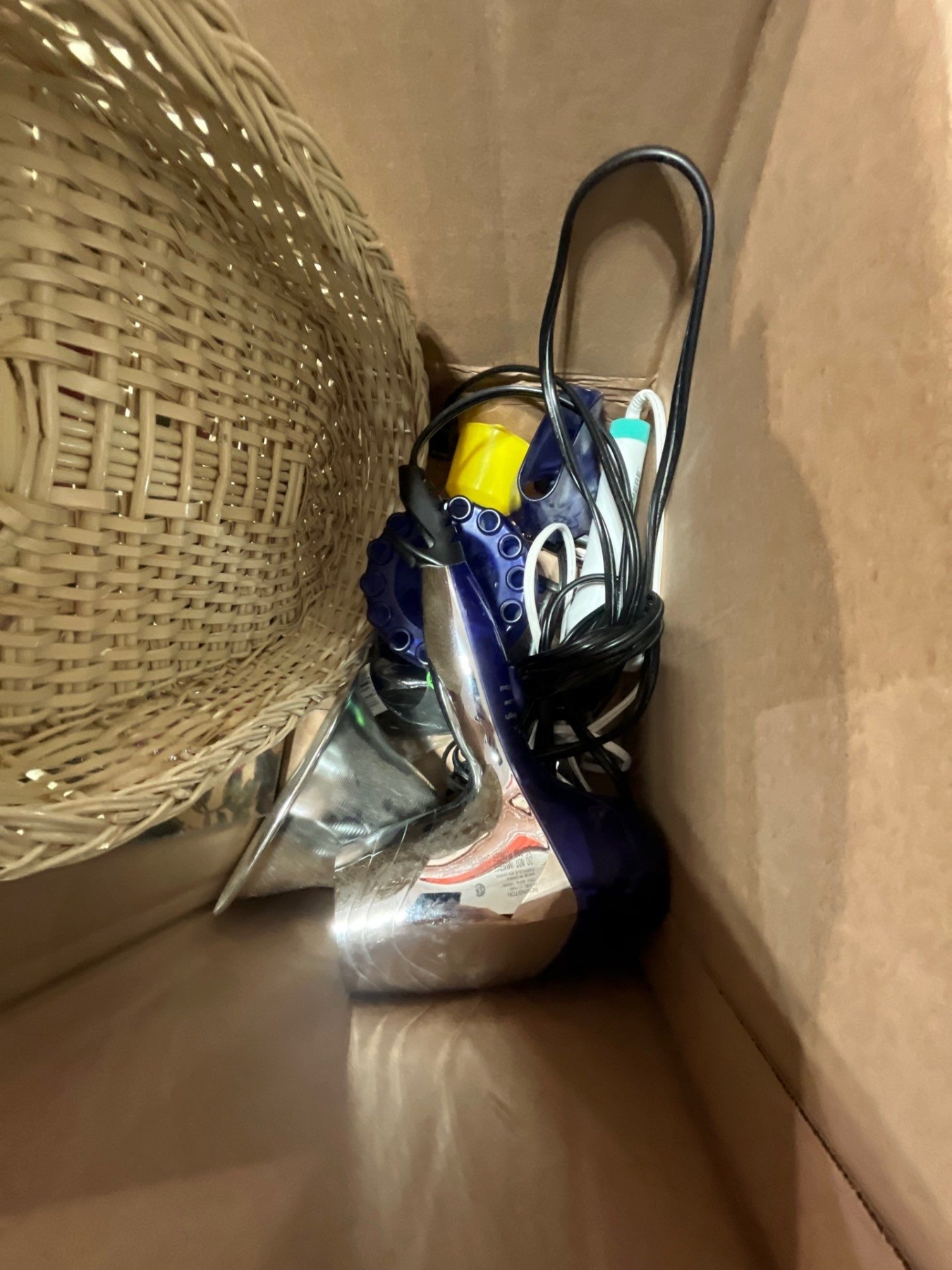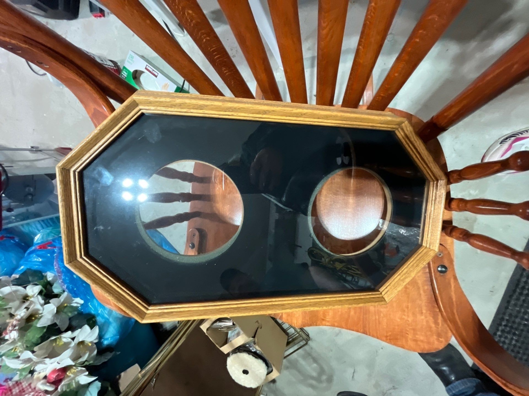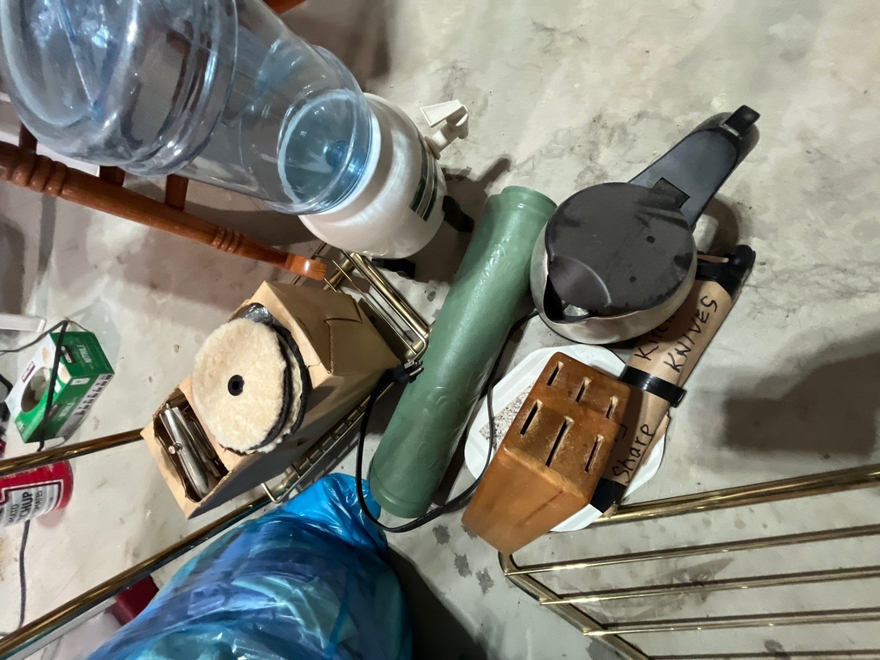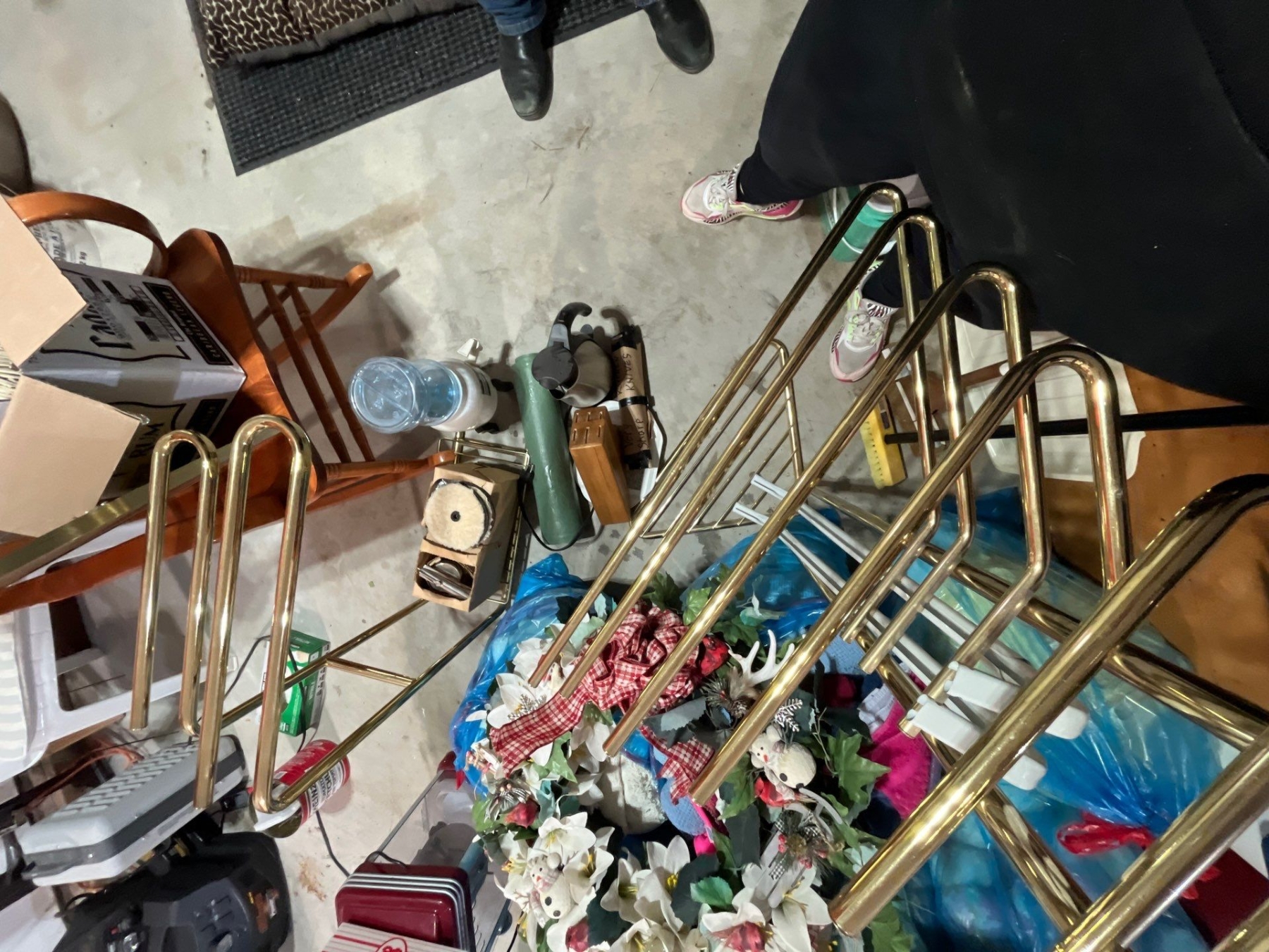 beautiful wood rocking chair with towel, hangers, water, jug, and other miscellaneous items all sold