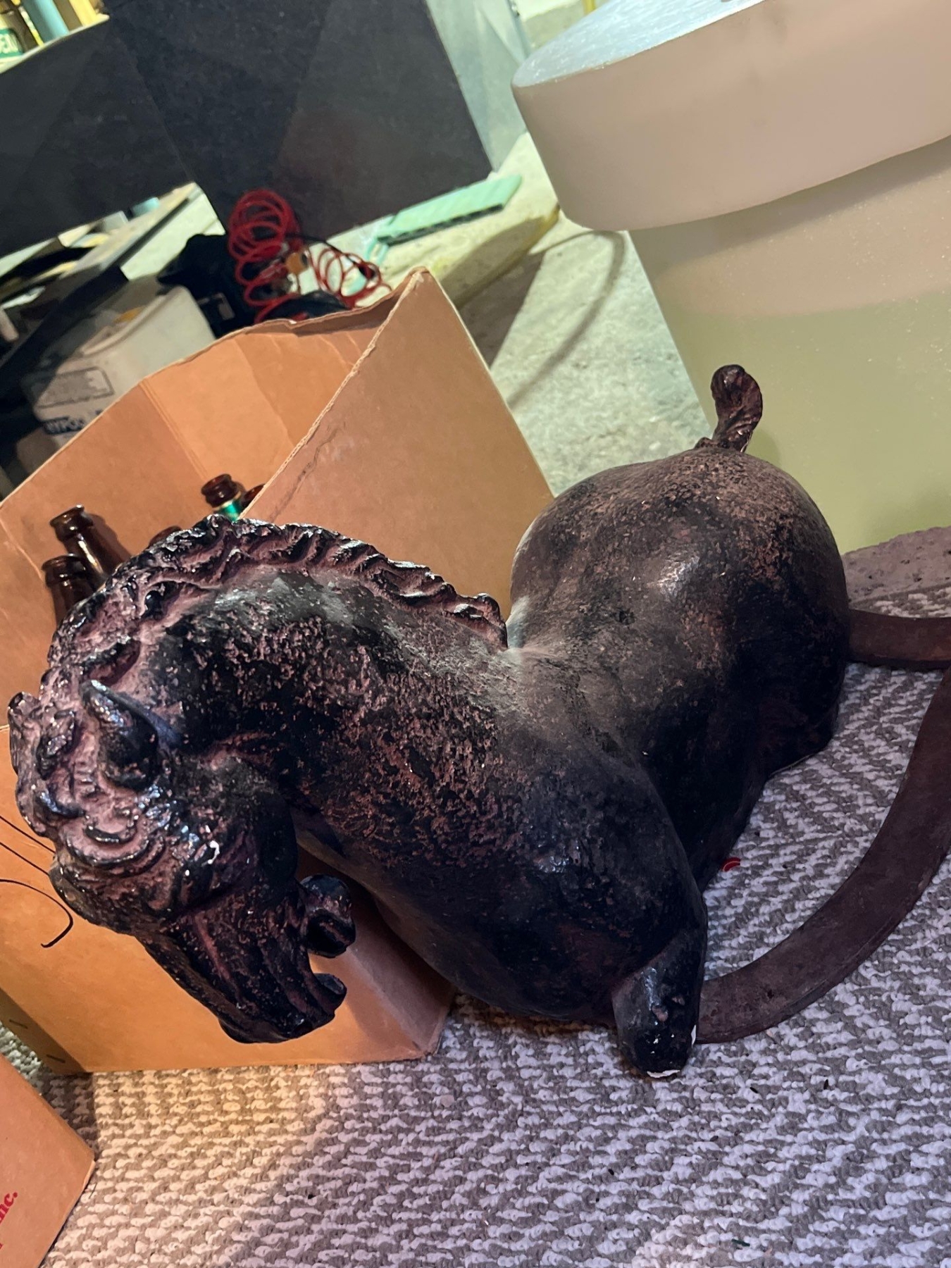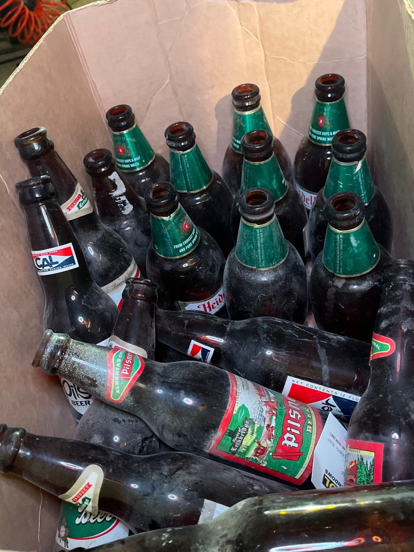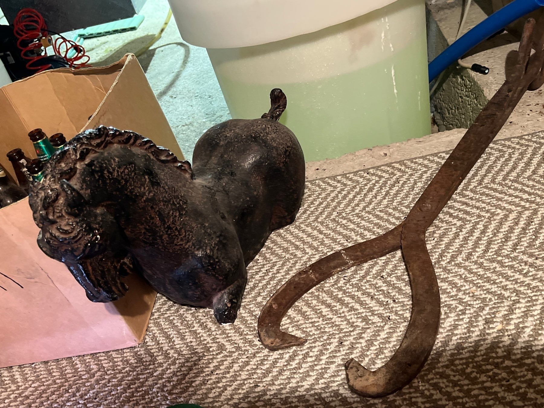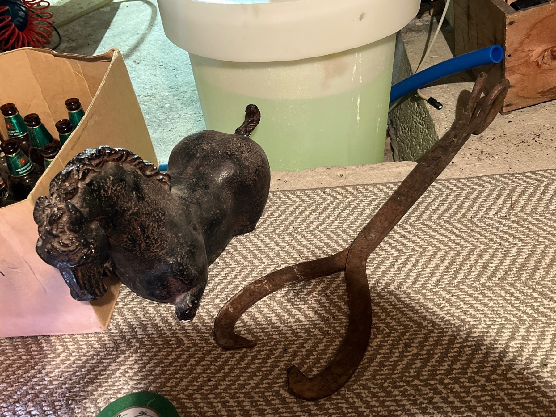 ceramic half of horse, antique log prongs and a box of variety beer bottles