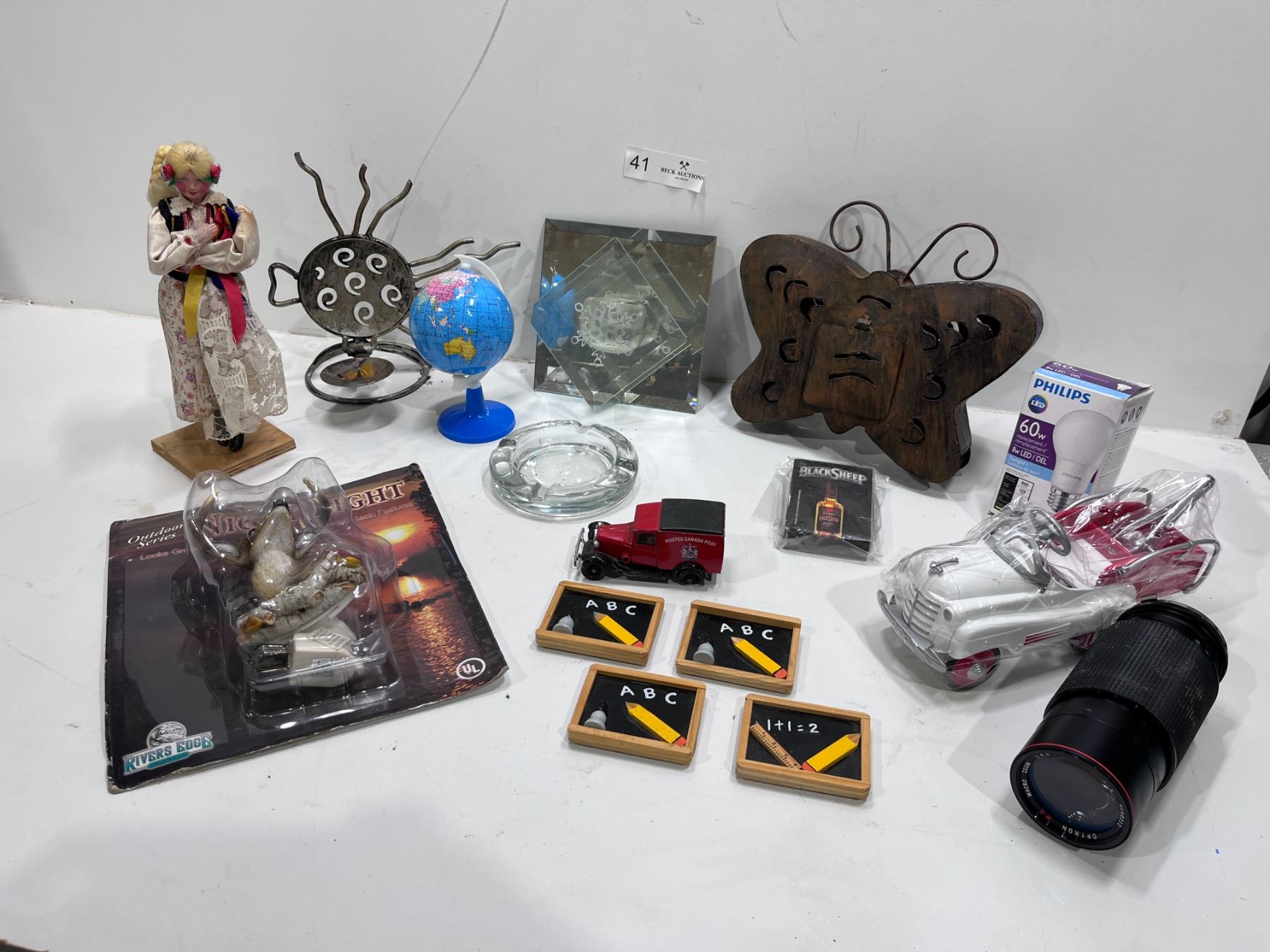 assortment of candle holders, ashtrays, doll, night light, light bulb, magnets, cars, deck of cards, optom macro zoom.