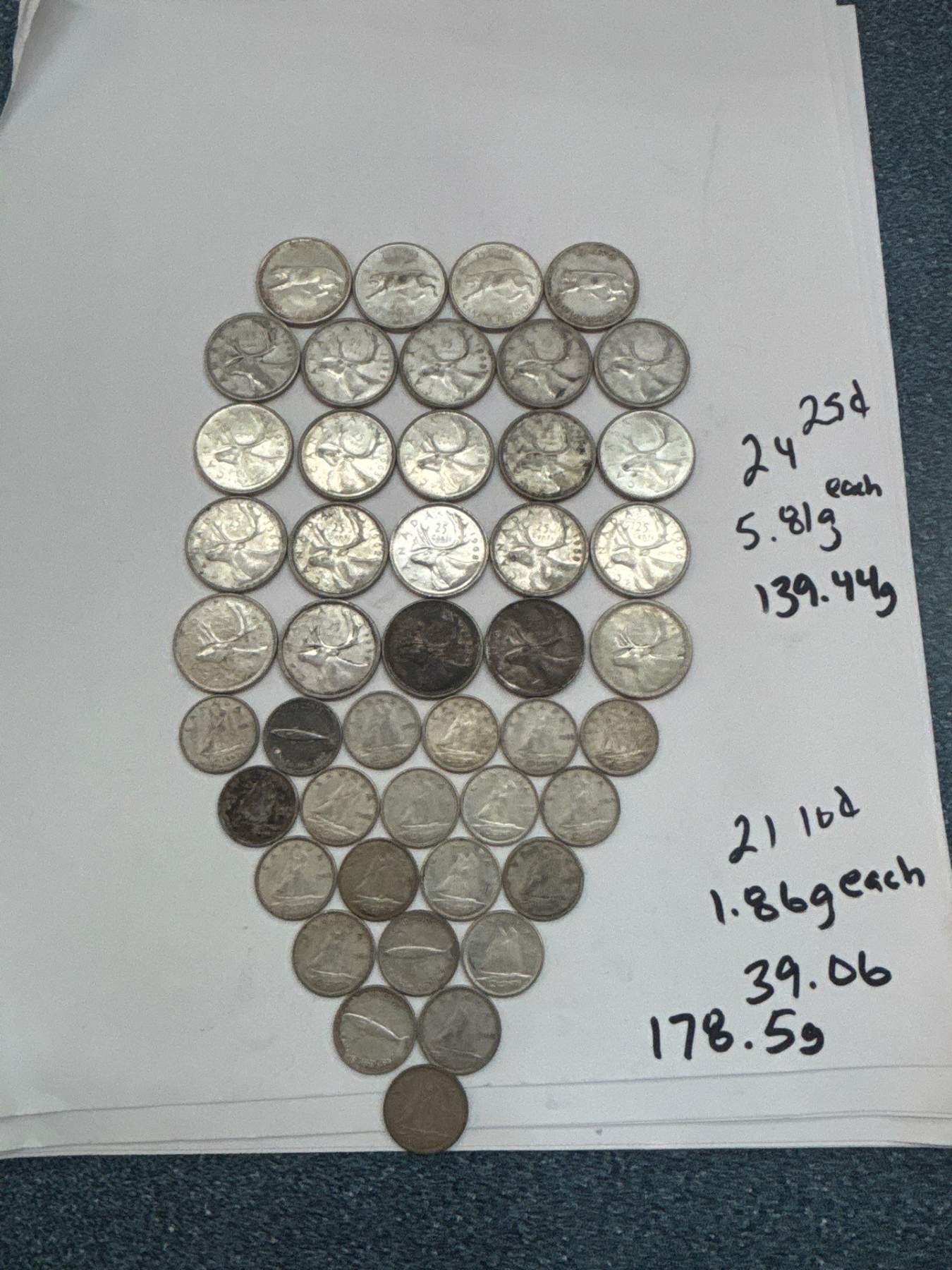 collection of Canadian 25 cents and Canadian 10 cents all 80% silver 178g Total weight .