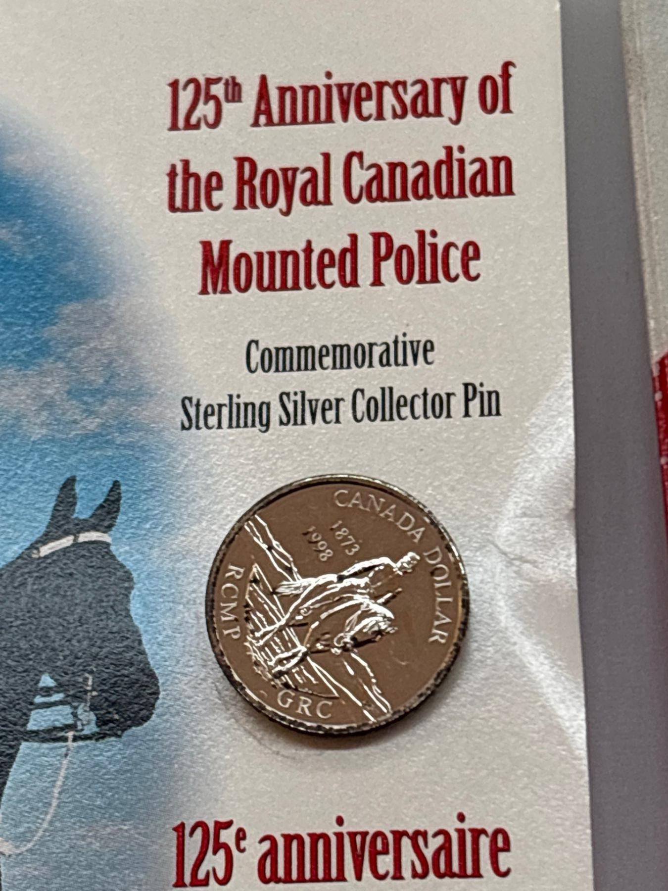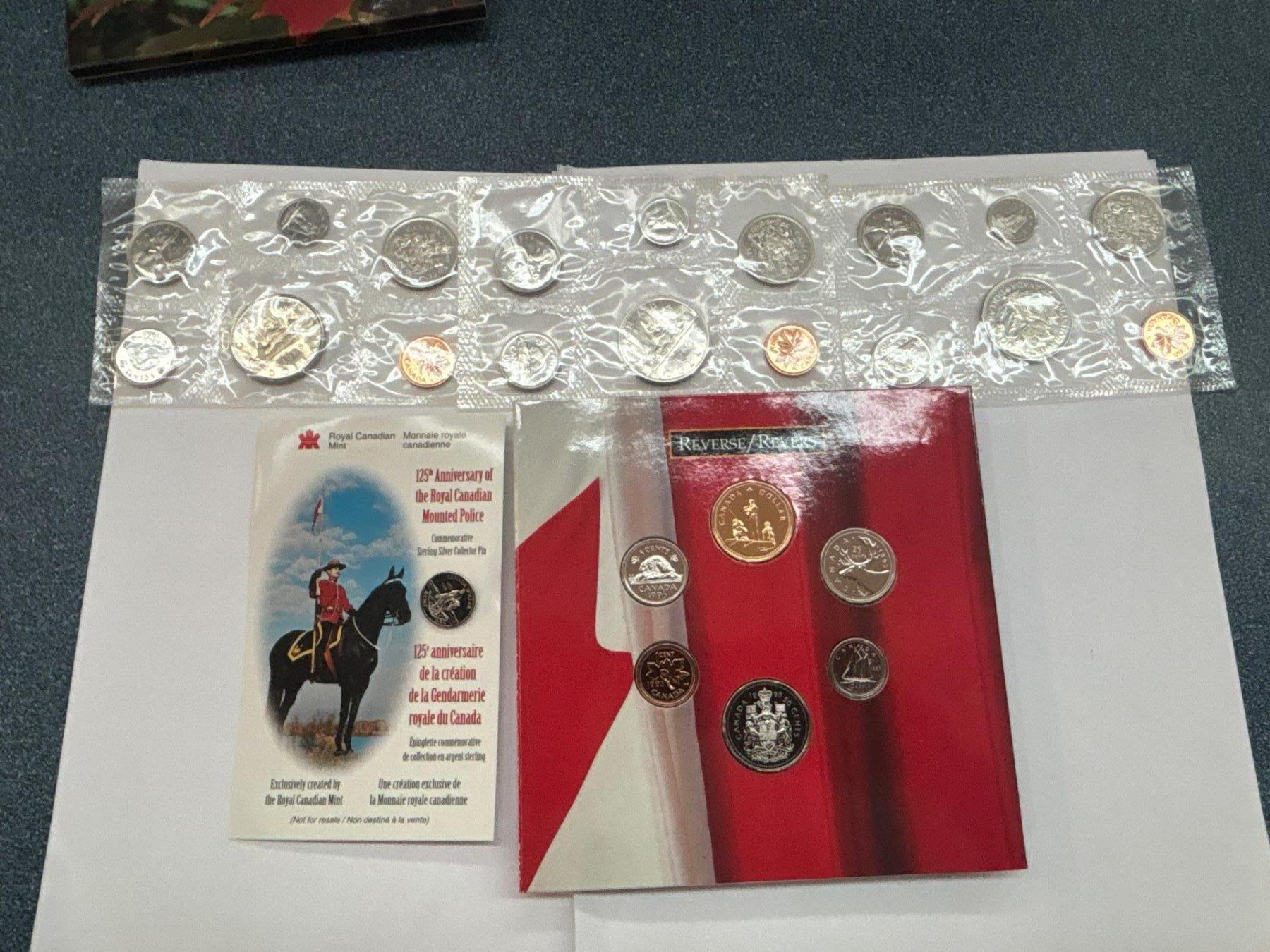 collection of Canadian uncirculated Coins 1970,69,68 125th anniversary of the Royal Canadian mounted police Sterling Silver collector pin and 1995 oh Canada uncirculated coin set