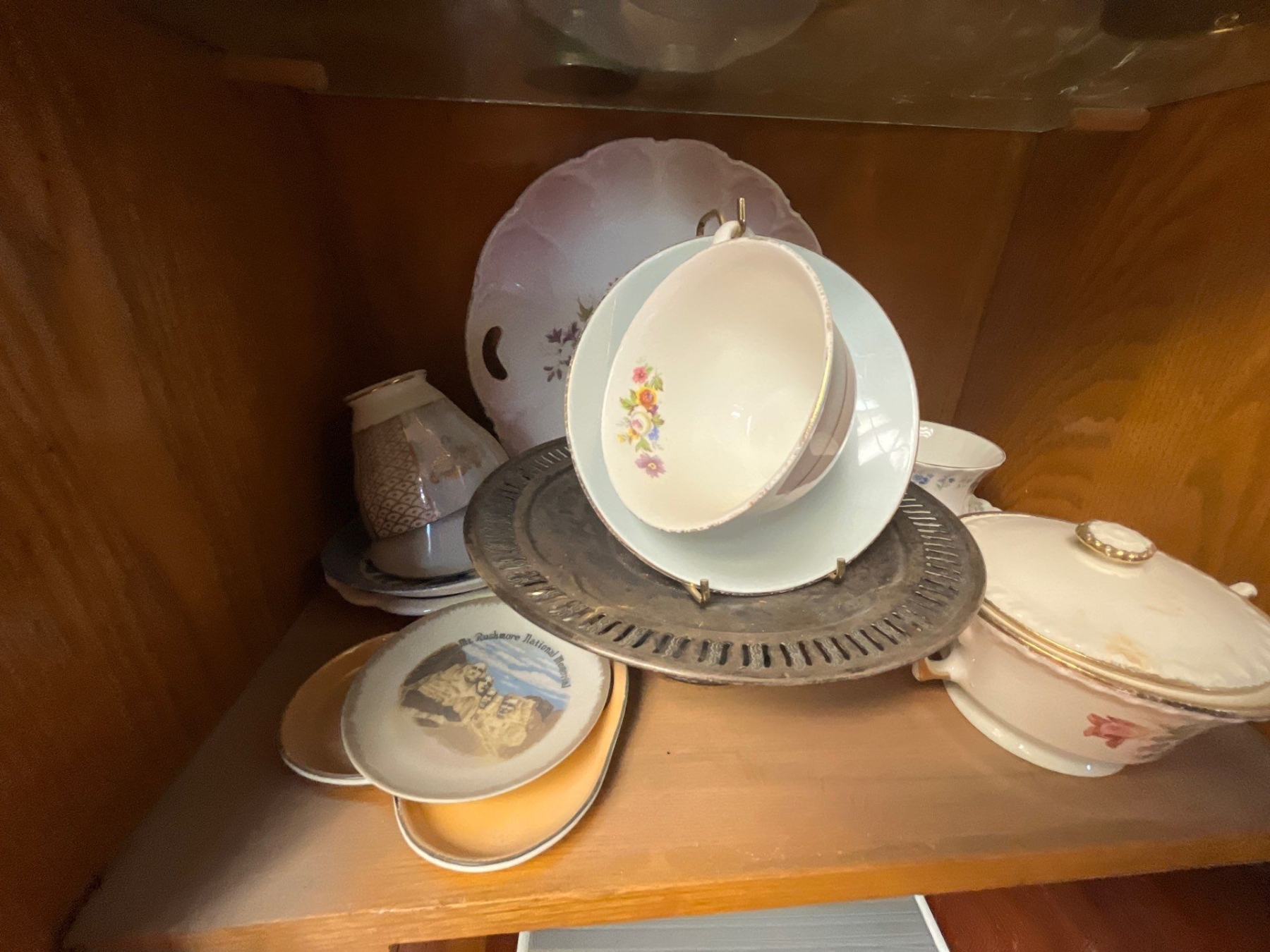 collection of China sugar, bowls, and other serving dishes, shelf six