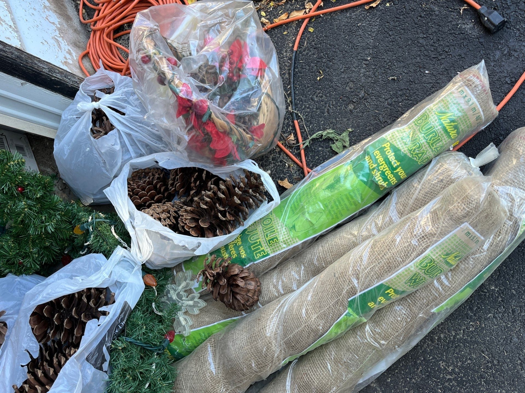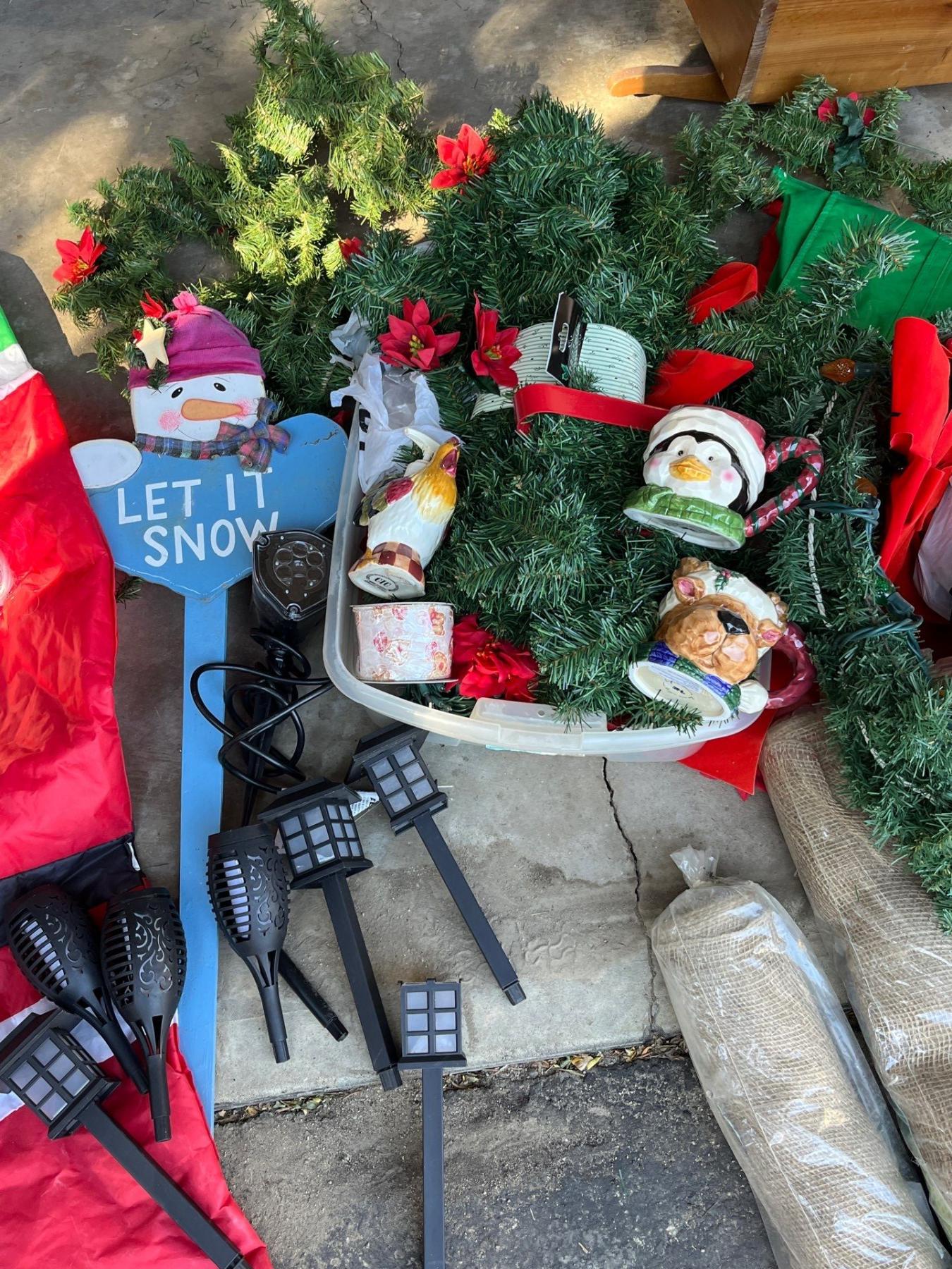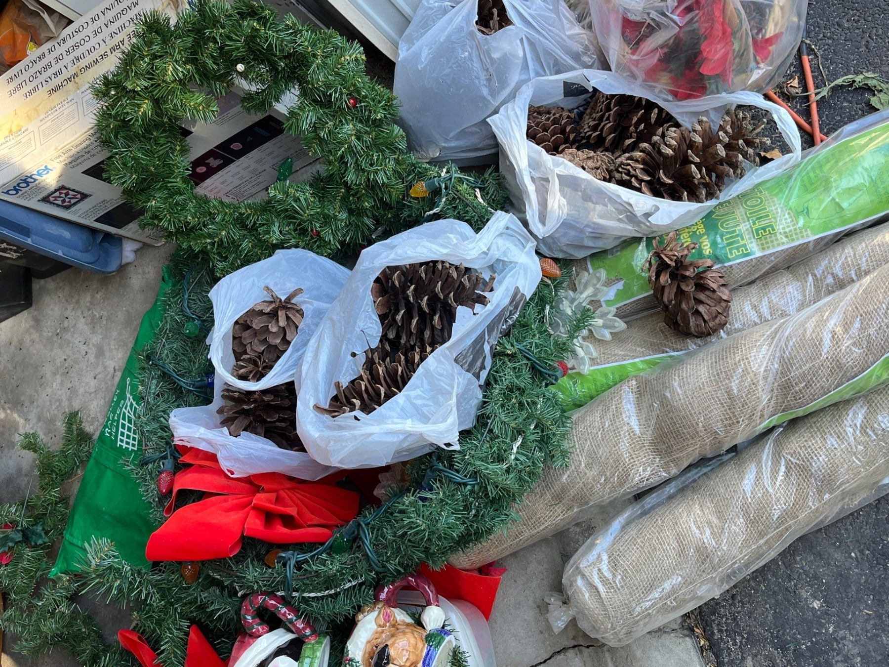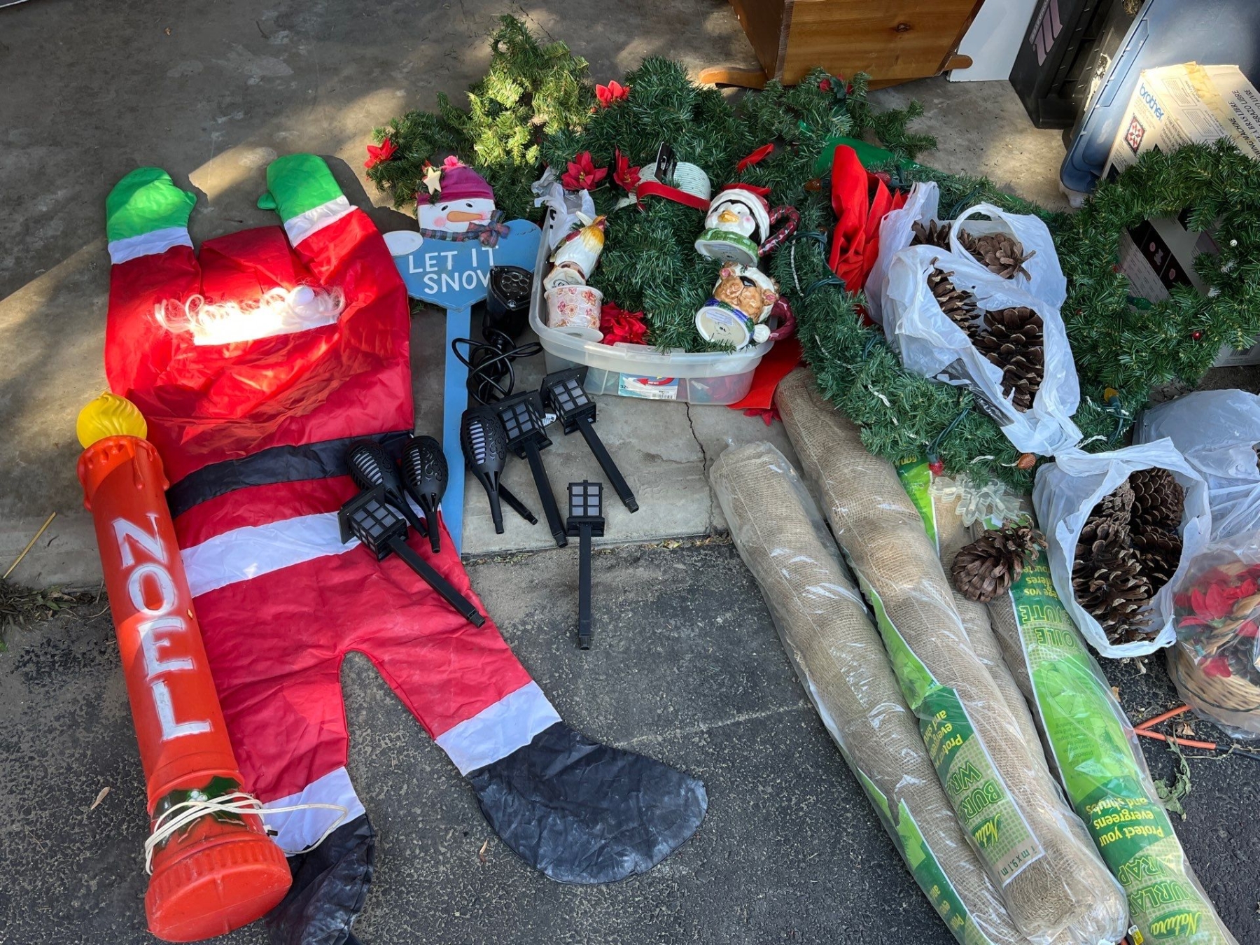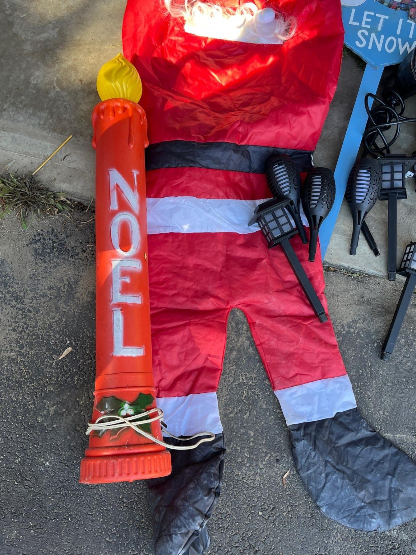 collection of Christmas decorations carline burlap a vintage plastic candle blowup Santa solar lights collection of ponderosa acorns and a basket for a centerpiece
