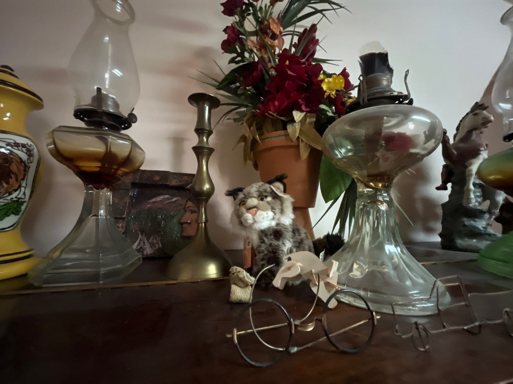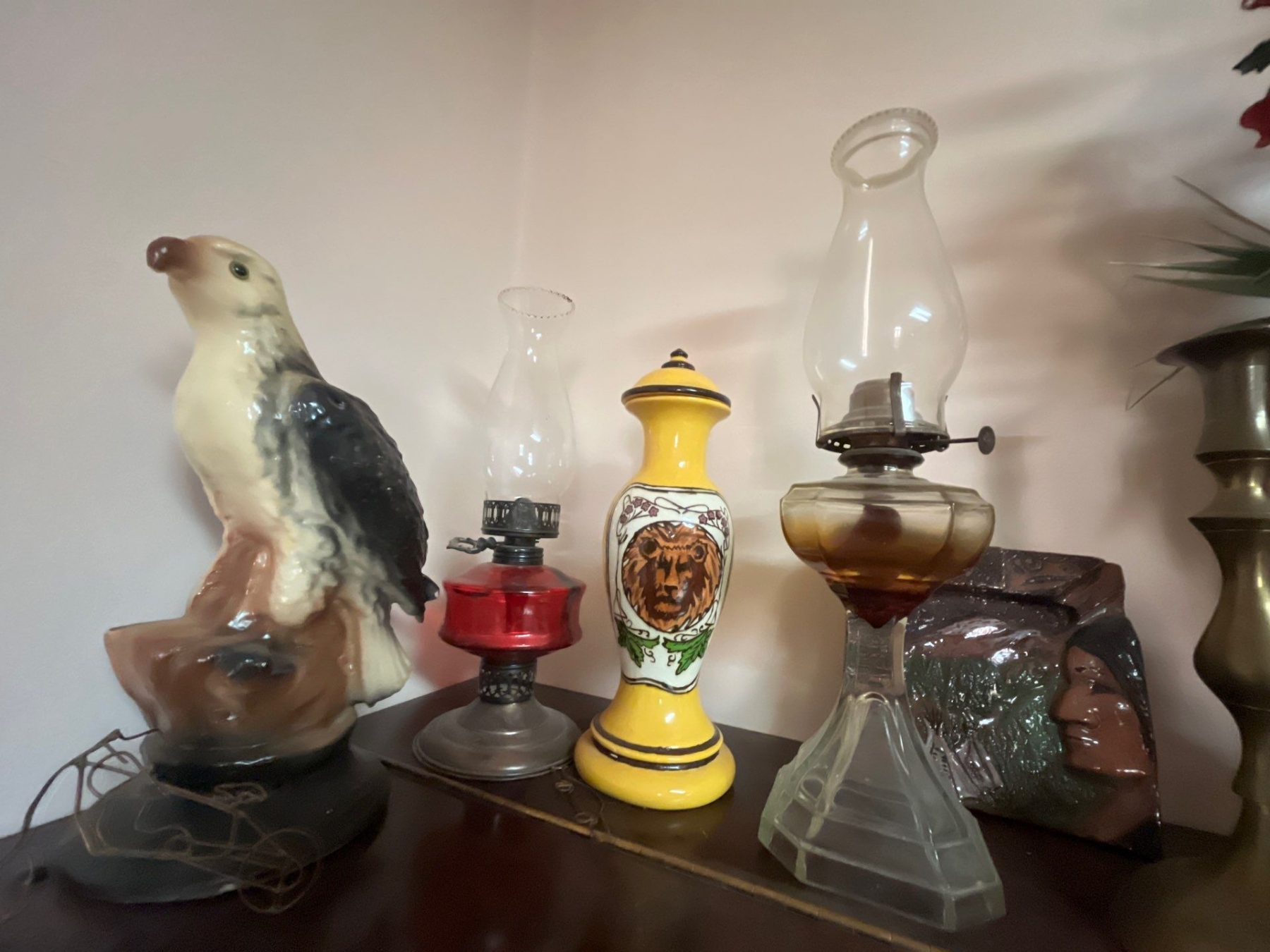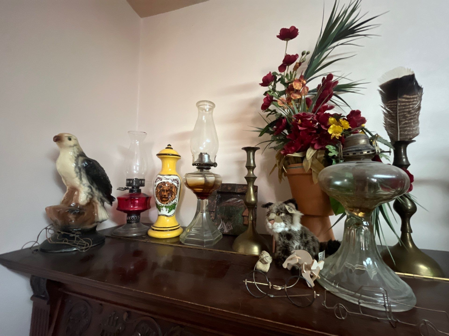 collection of antique oil lanterns, glasses, small pieces of wire art, and a ceramic eagle and two brass candle holders along with a yellow handmade vase