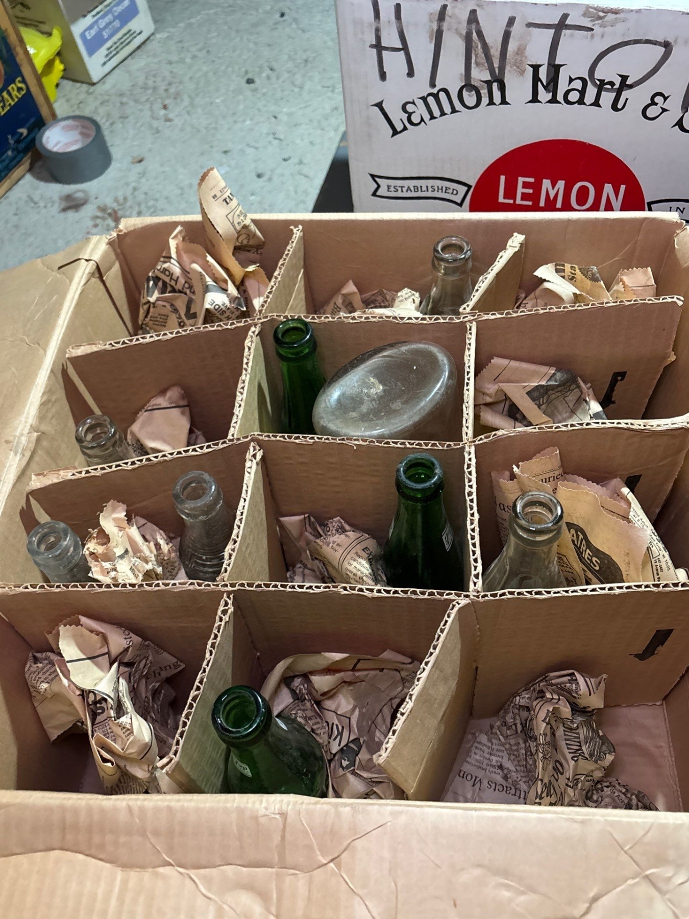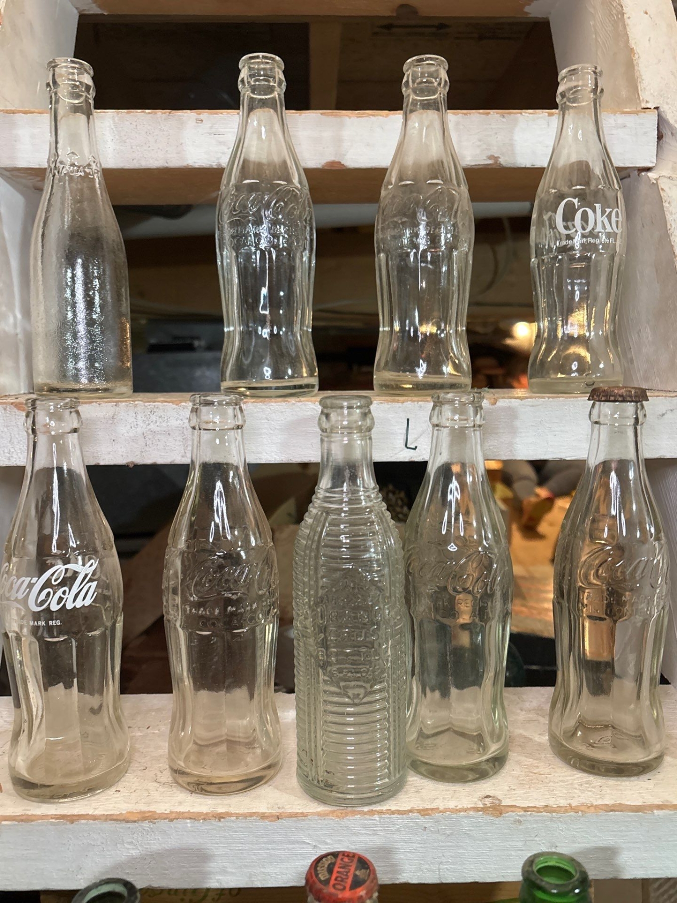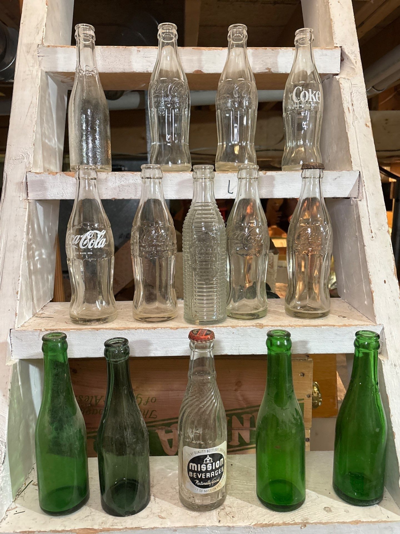 collection of antique/vintage Coca-Cola bottles, green glass bottles mission beverages clear, crush