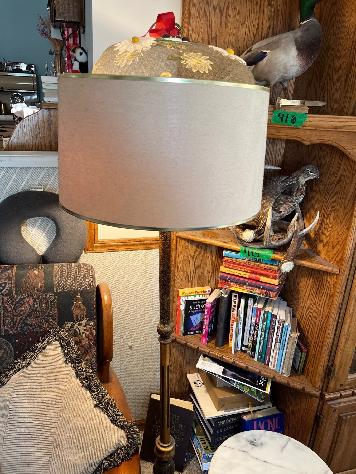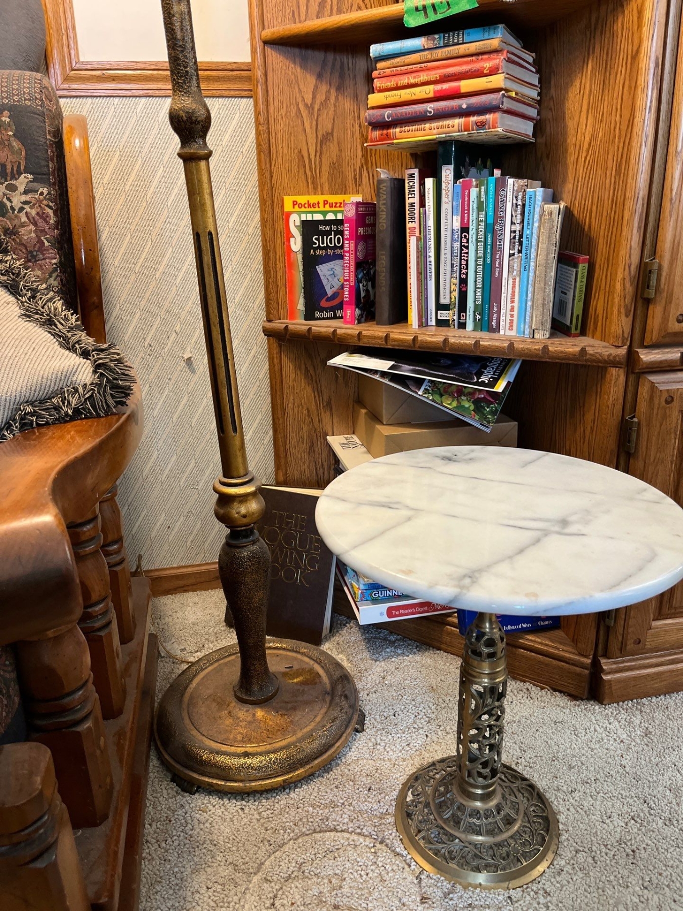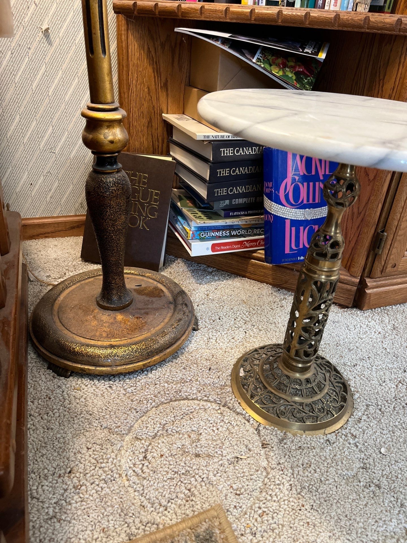 collection of books, vintage retro lamp, and marble and brass side table