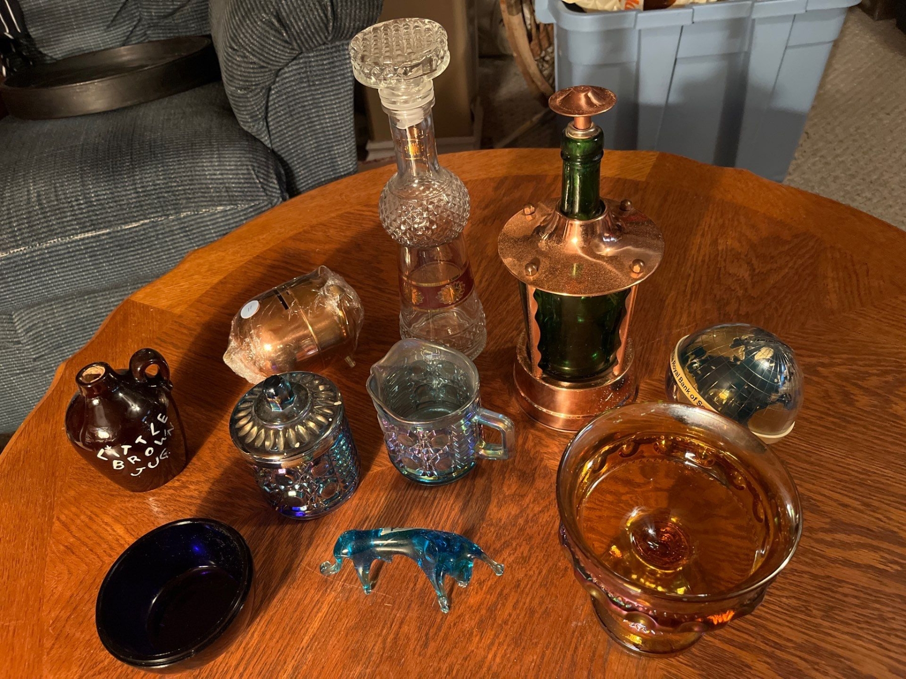 collection of carnival glass, piggy banks, whiskey, bottles, and decanters, and a vintage globe from the Royal Bank of Scotland