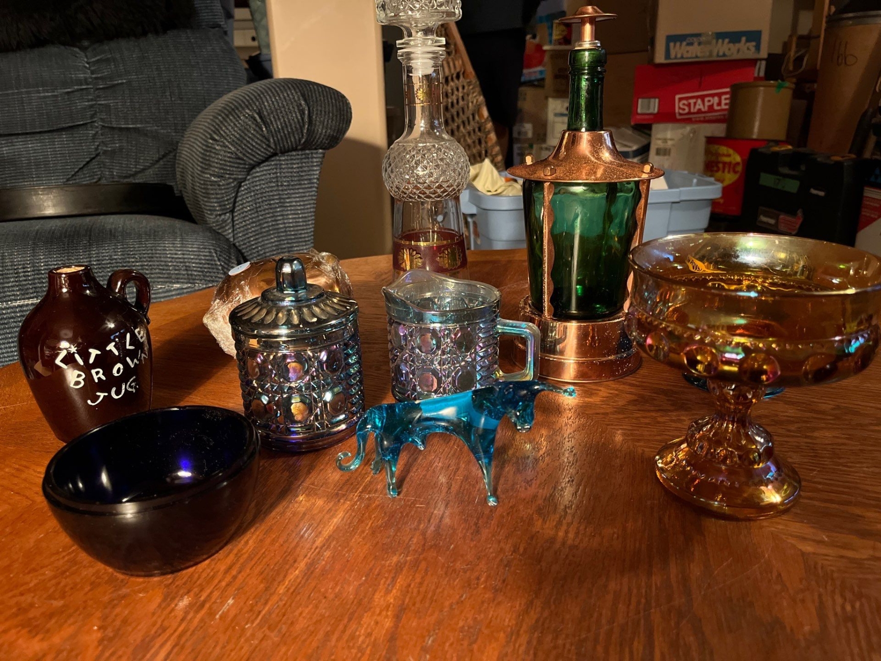collection of carnival glass, piggy banks, whiskey, bottles, and decanters, and a vintage globe from