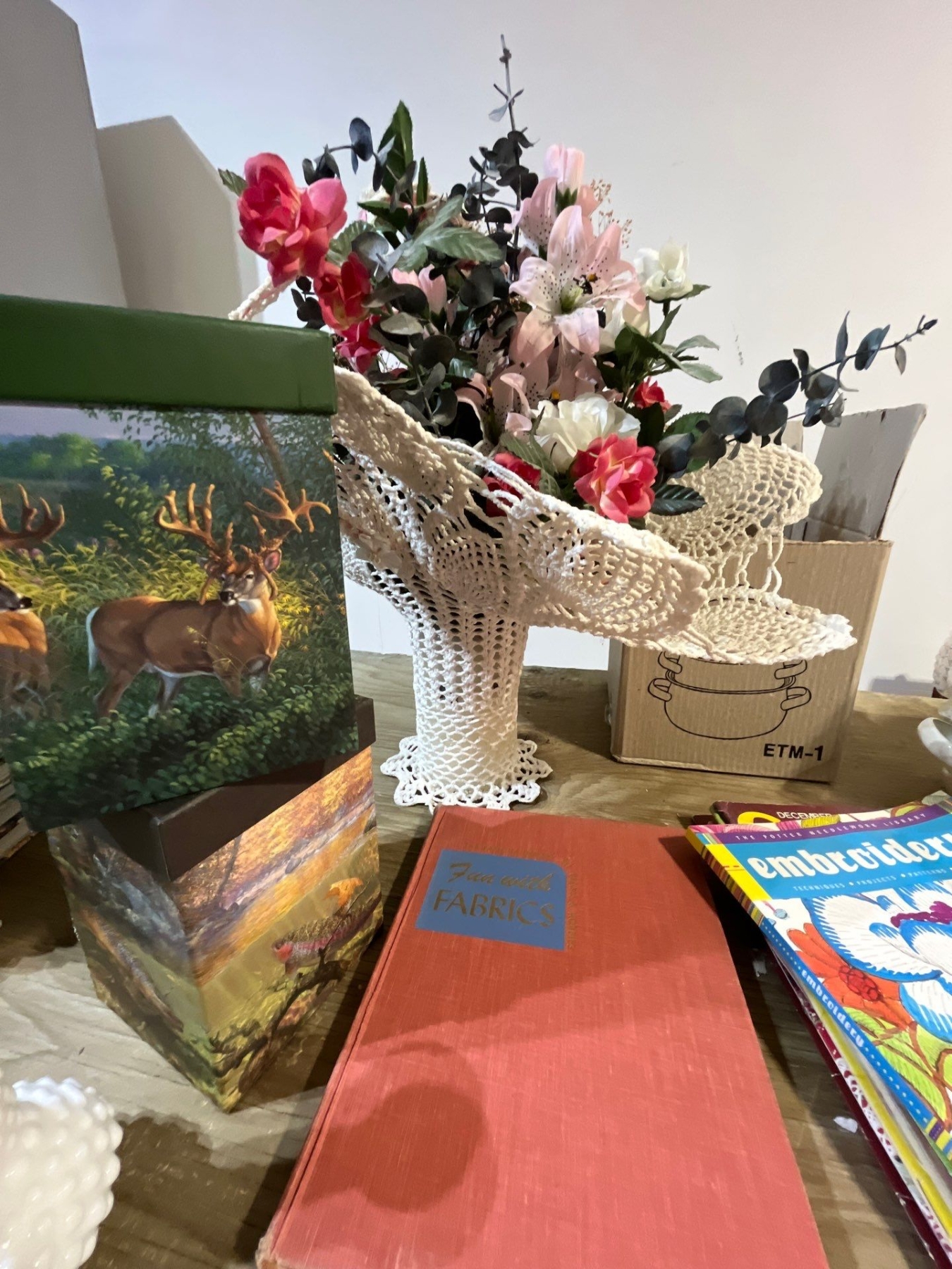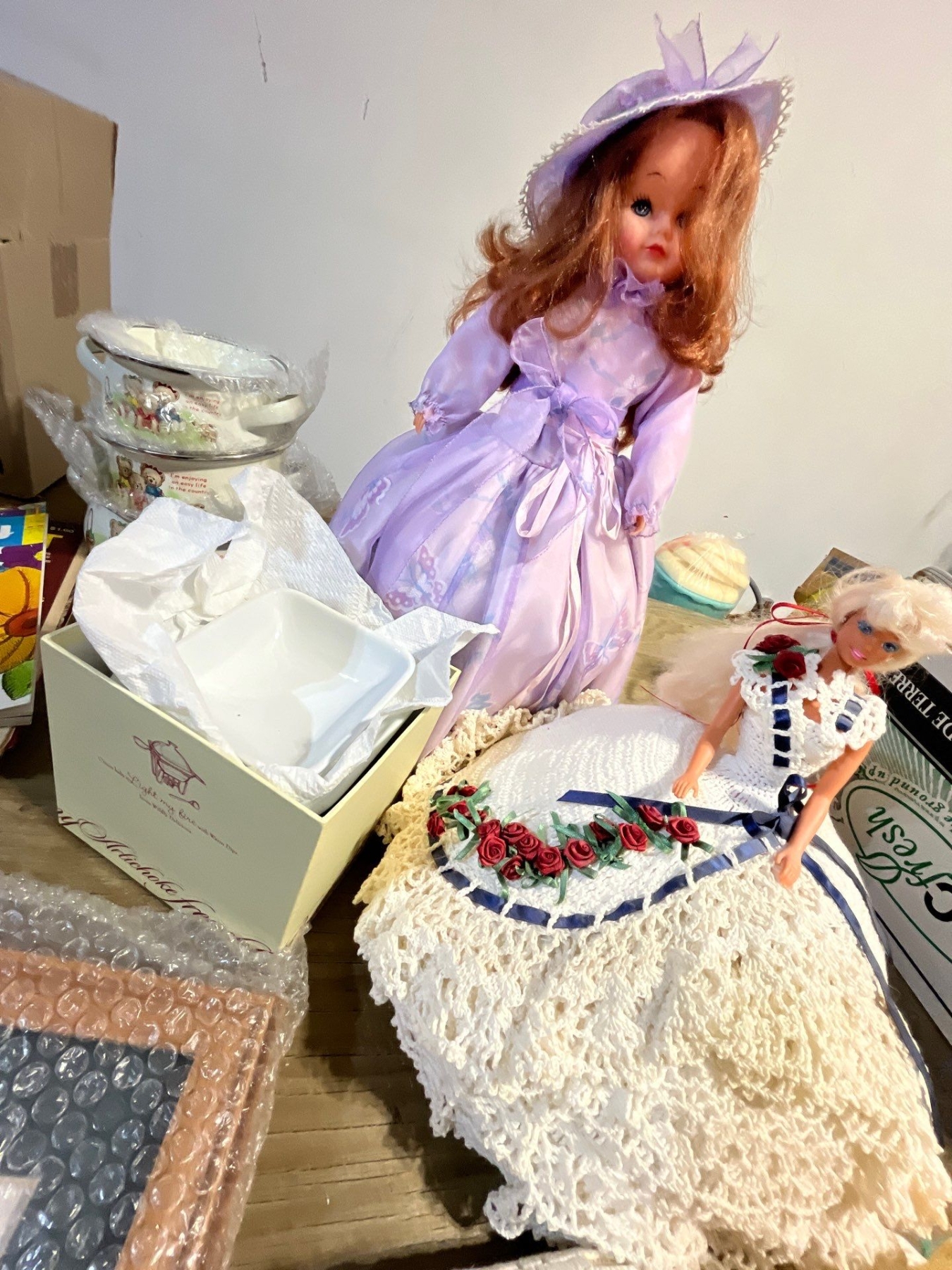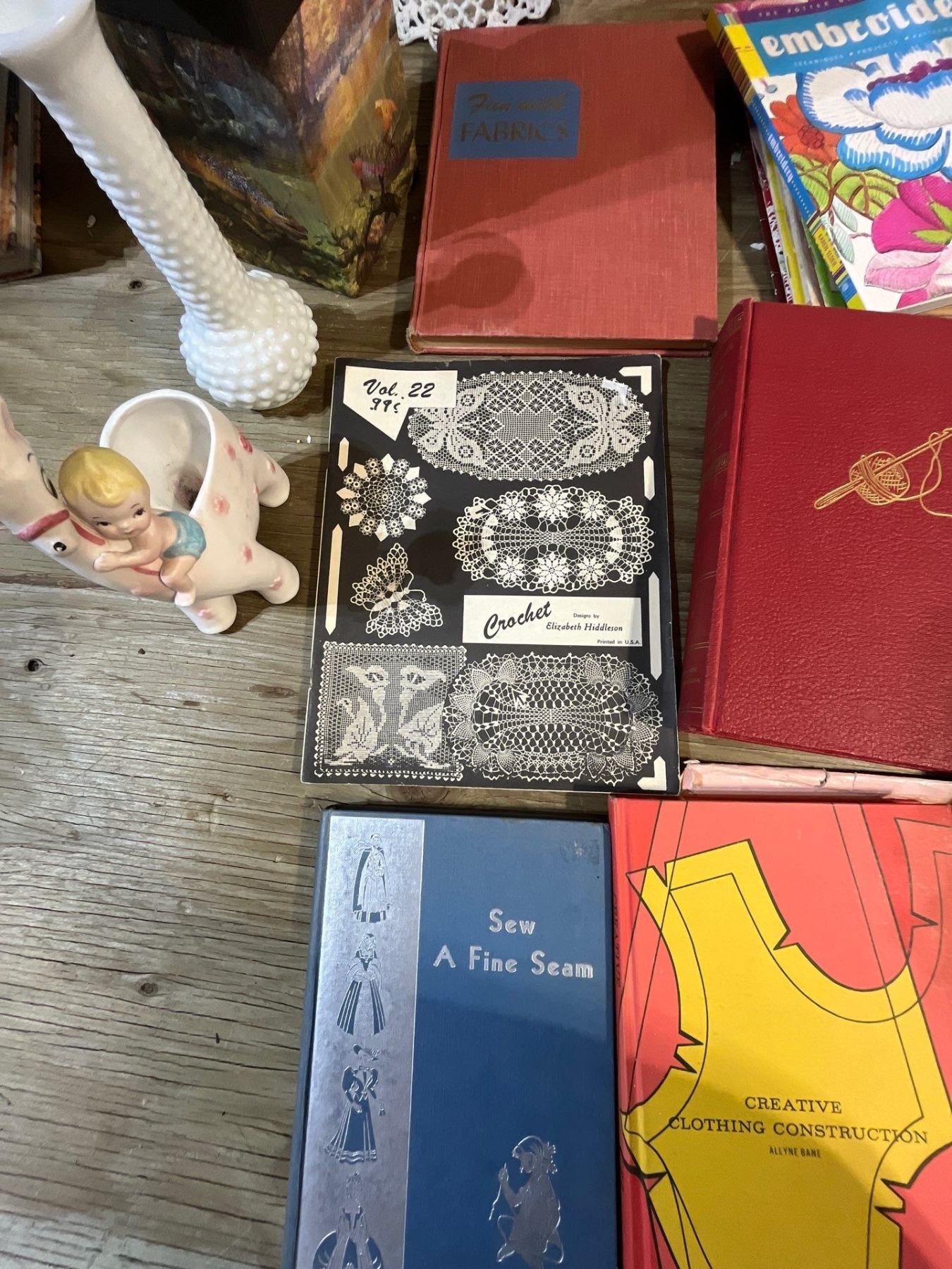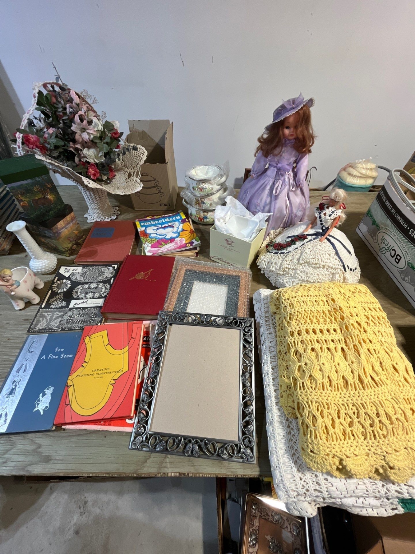 collection of crocheted, tablecloths frames, dolls with crochet dresses, kids books, knitting books and other miscellaneous items. Great surprise box