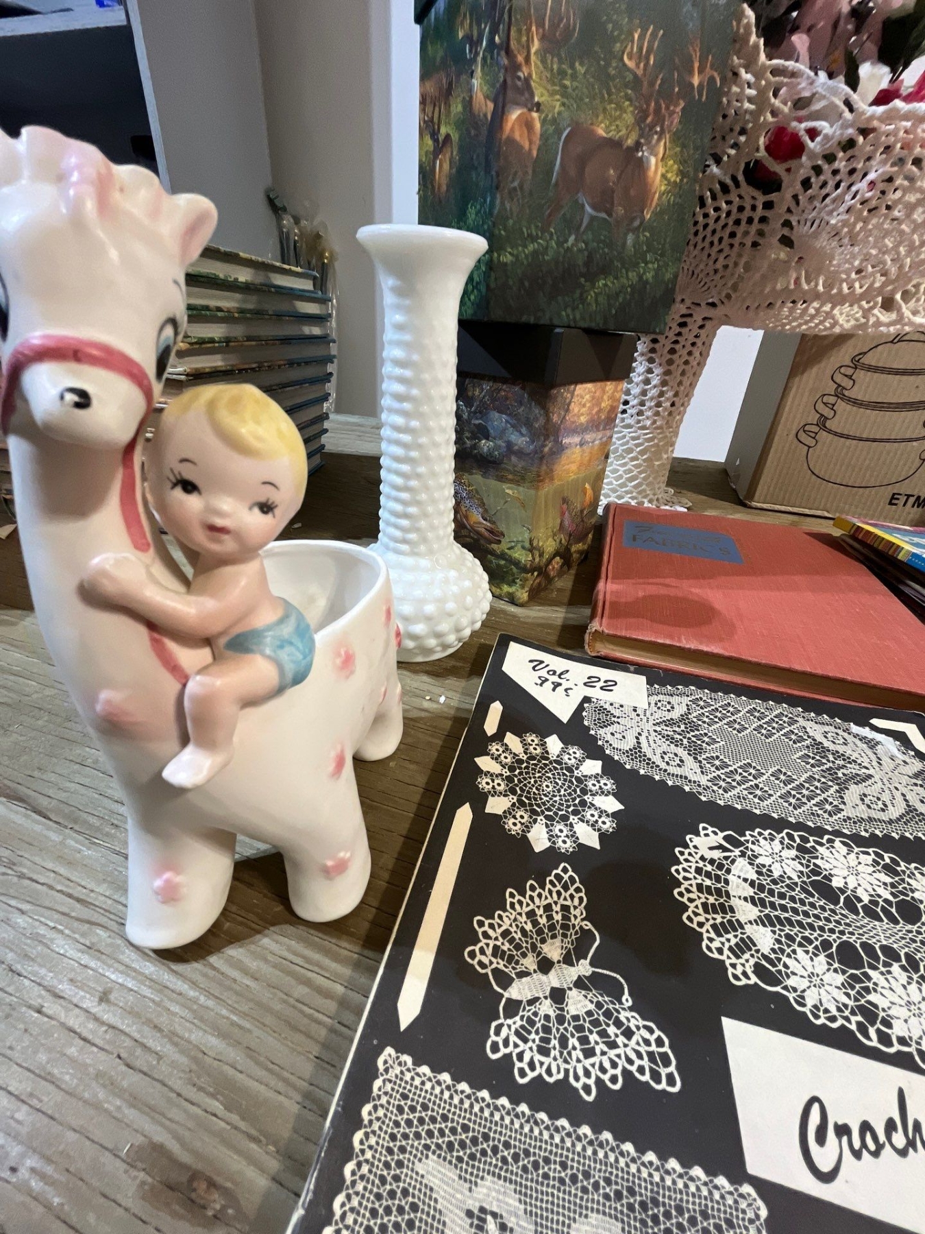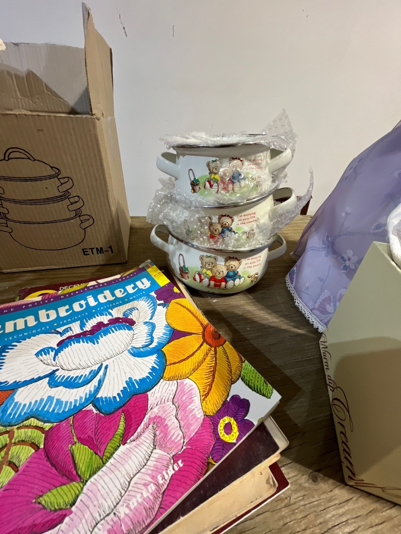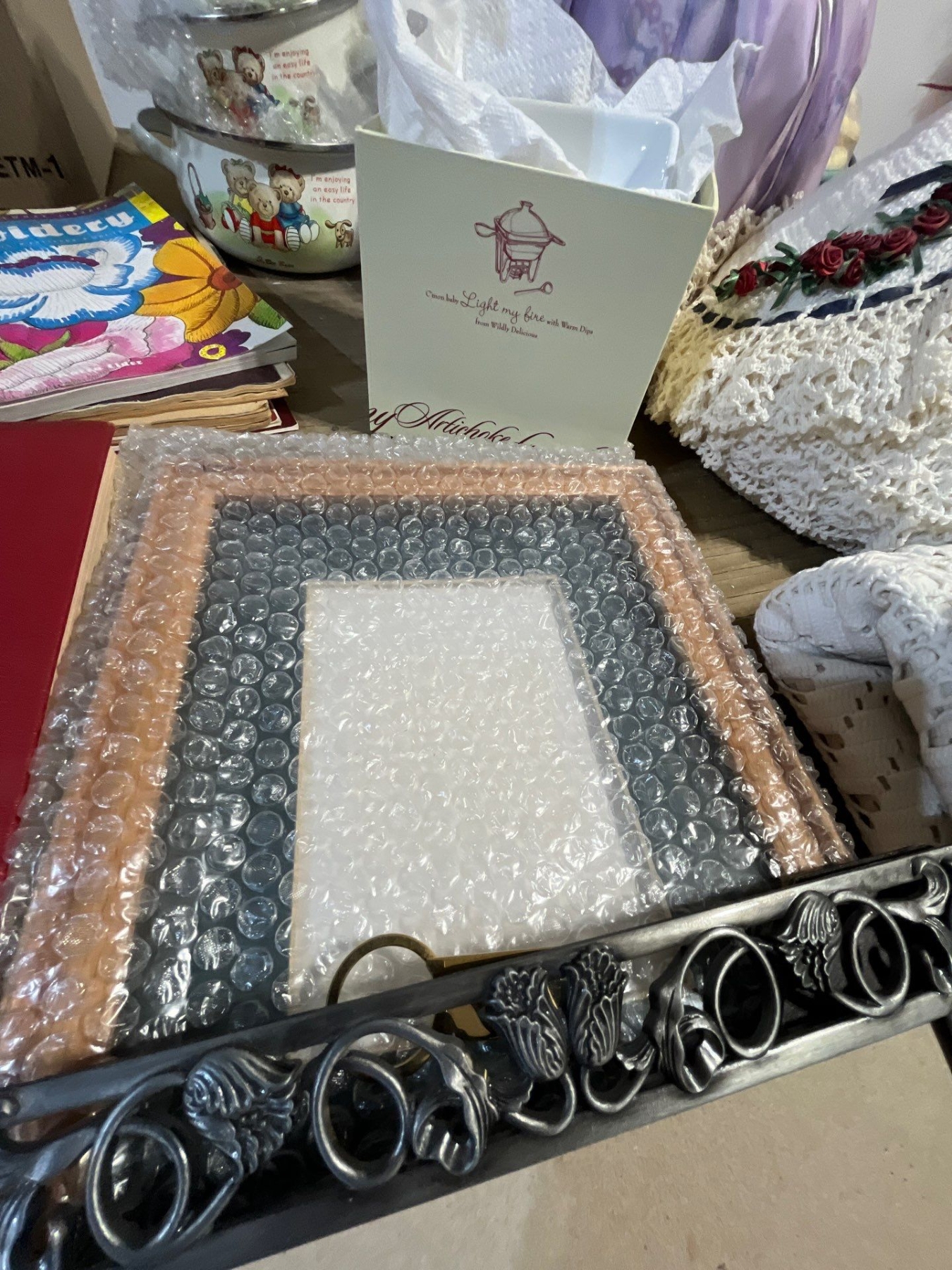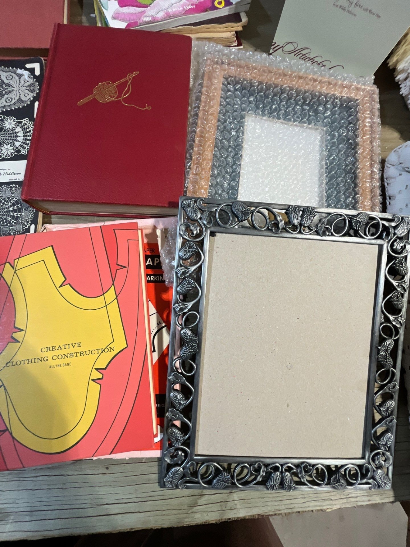 collection of crocheted, tablecloths frames, dolls with crochet dresses, kids books, knitting books and other miscellaneous items. Great surprise box