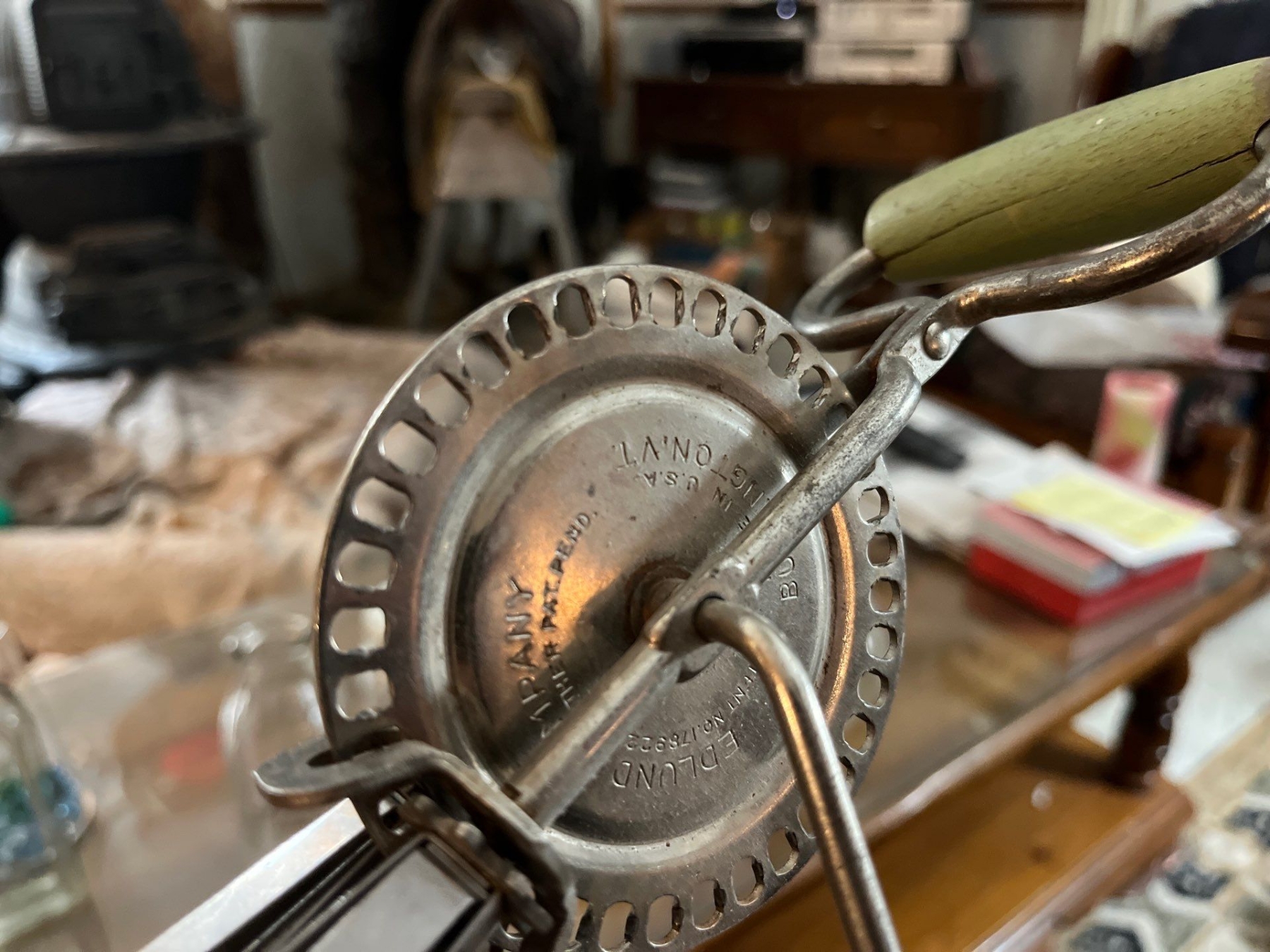 collection of glass containers ball 2863 limited Dominion glass company design registered in 1932 Antique hand crank egg beater in working condition from Ed Lund company made in USA