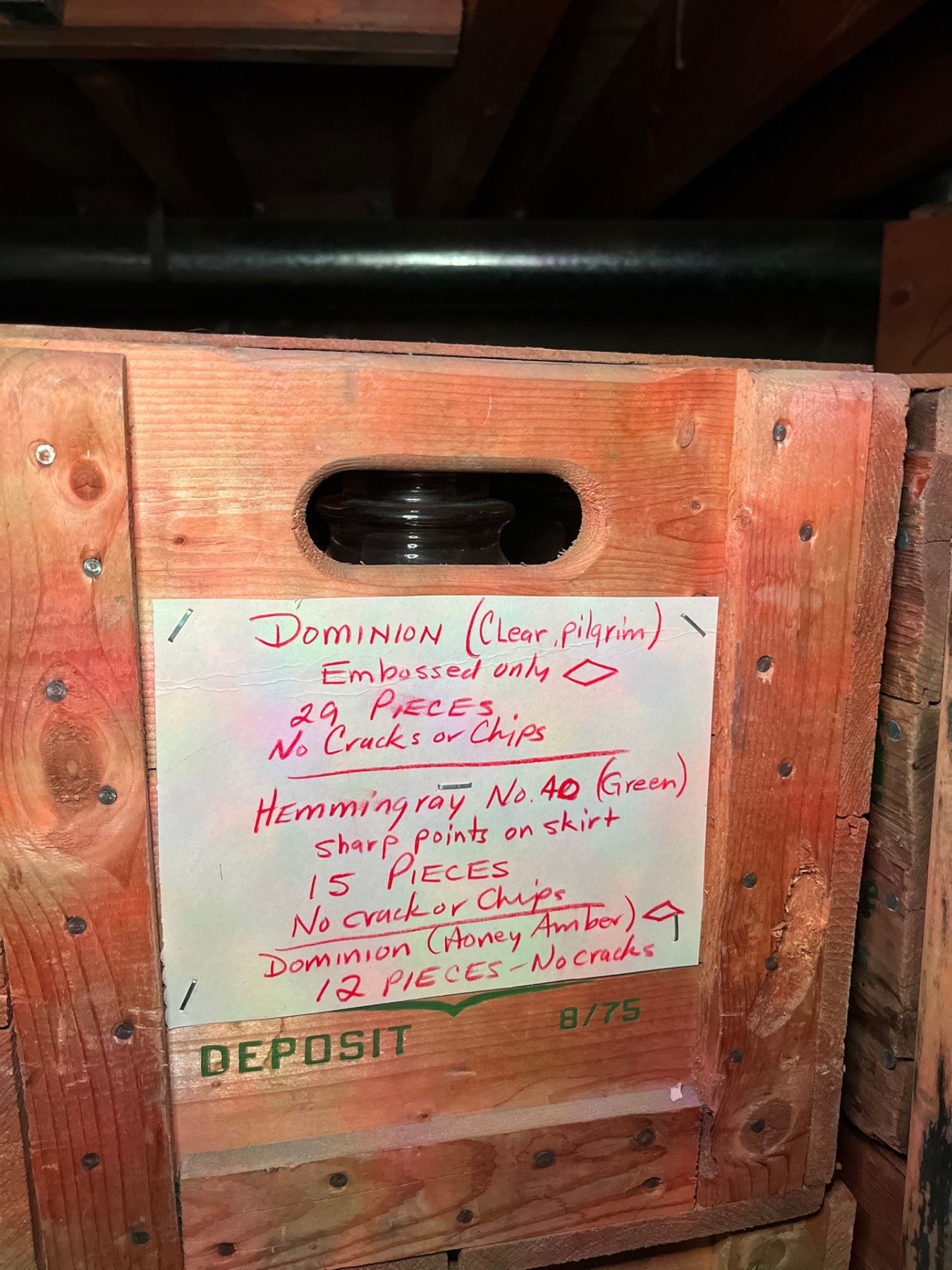 collection of insulators dominion clear Pilgrim embossed only 29 pieces no chips or cracks hemming Ray number 40 green sharp points on skirt 15 pieces no cracks or chips Dominion, honey Amber 12 pieces no cracks.