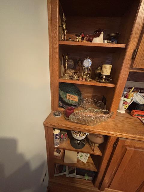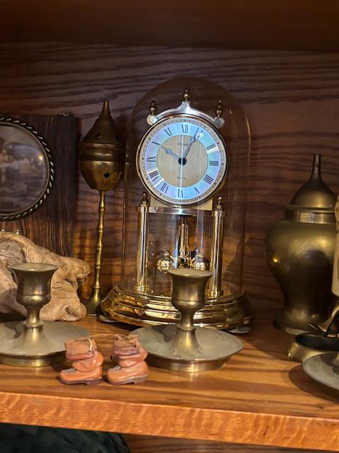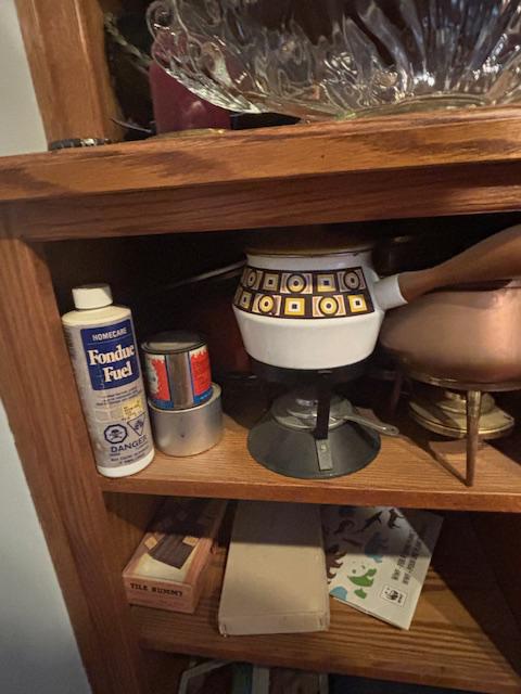 collection of miscellaneous items, including crystal serving trays, a vintage clock, and a bunch of brass candleholders, as well as some retro fondue pots