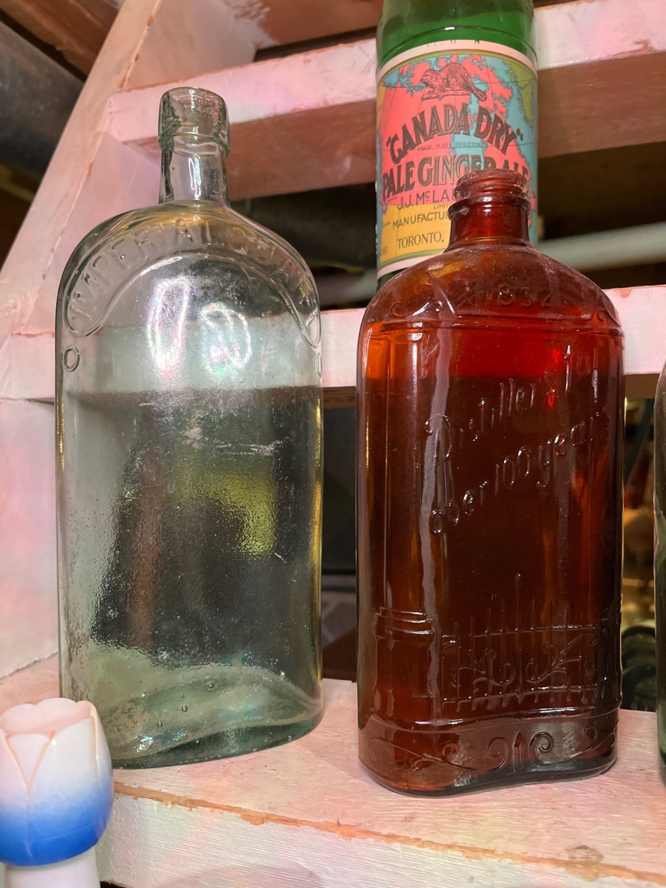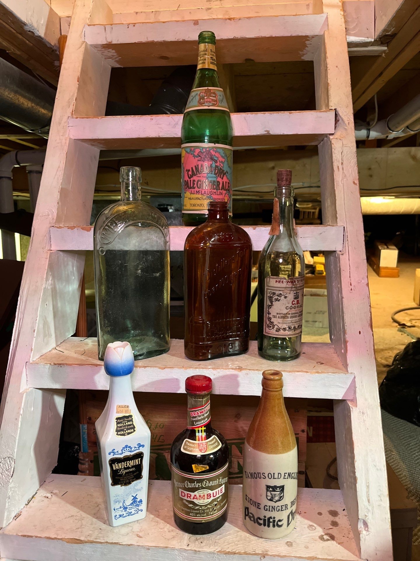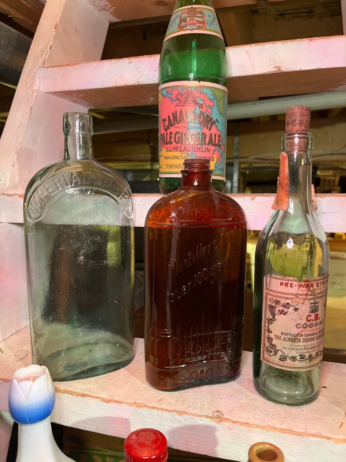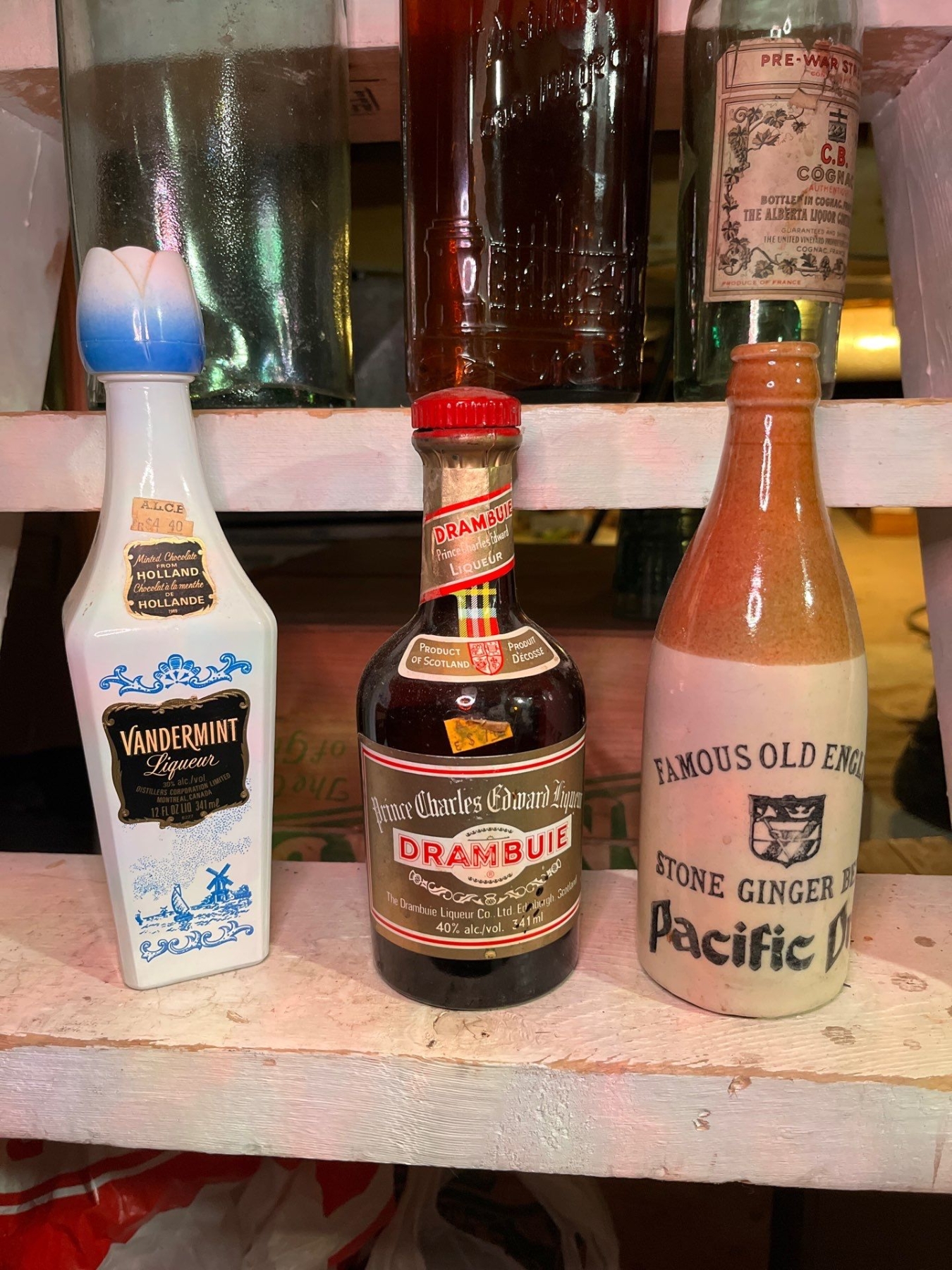 collection of seven vintage bottles, famous old English stone ginger beer Pacific dry pre-war strength cognac distillery for over 100 years GNM Mark imperial Court whiskey jug Graham Yui, and a Holland liquor bottle.
