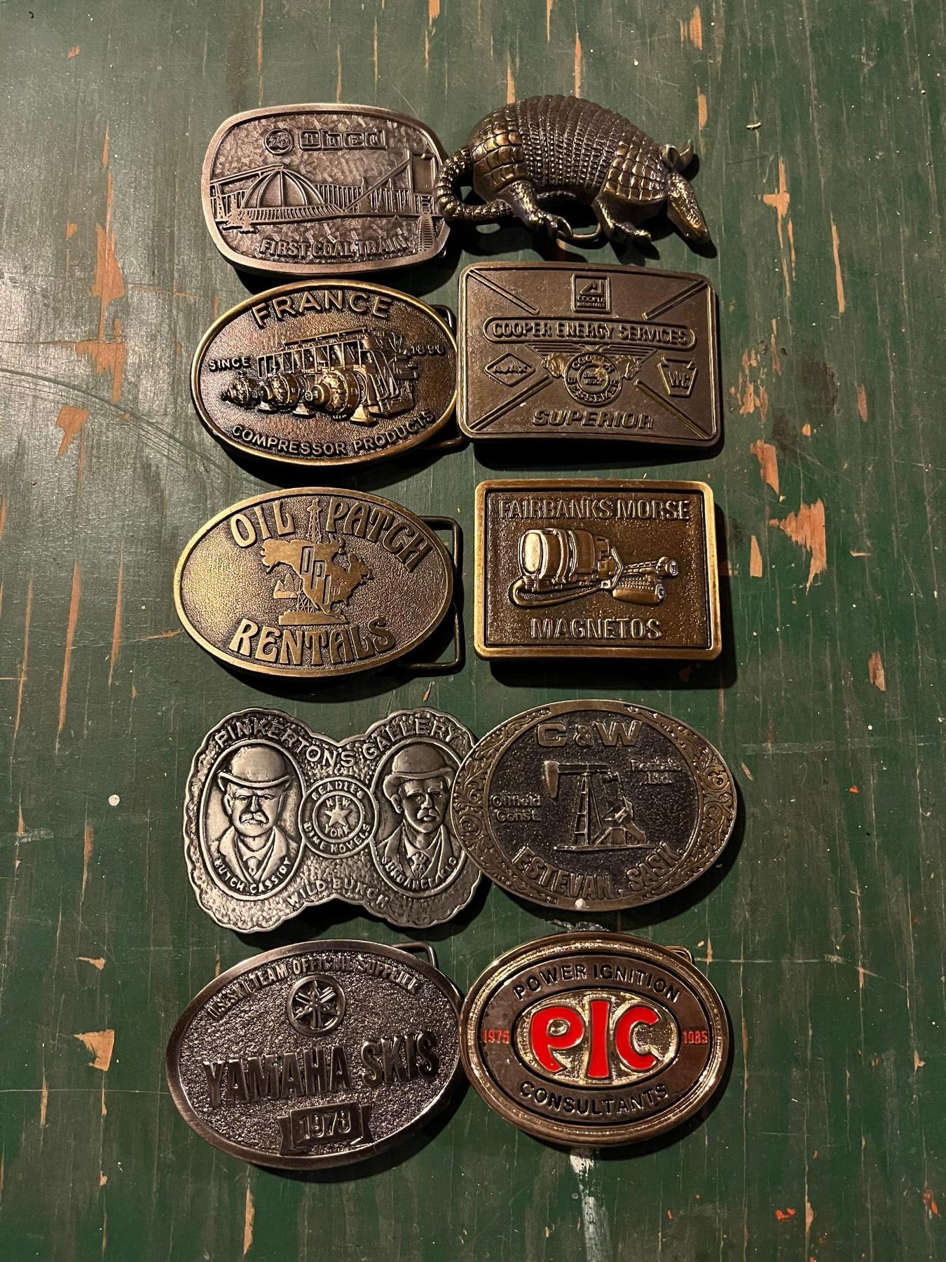 collection of vintage belt buckles from France, Alberta oil patch Yamaha skis and a armadillo all very cool