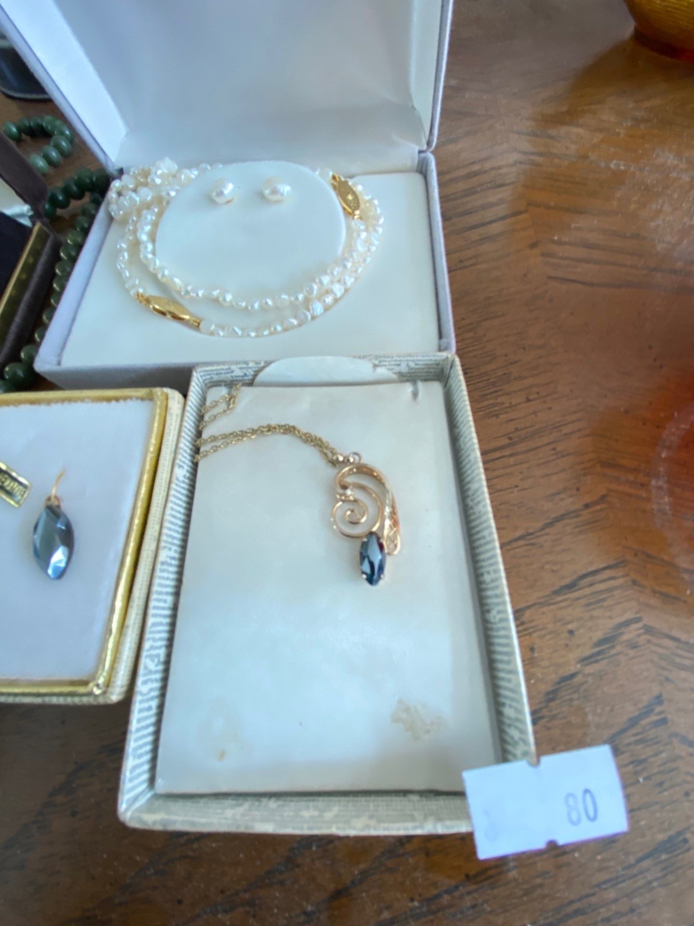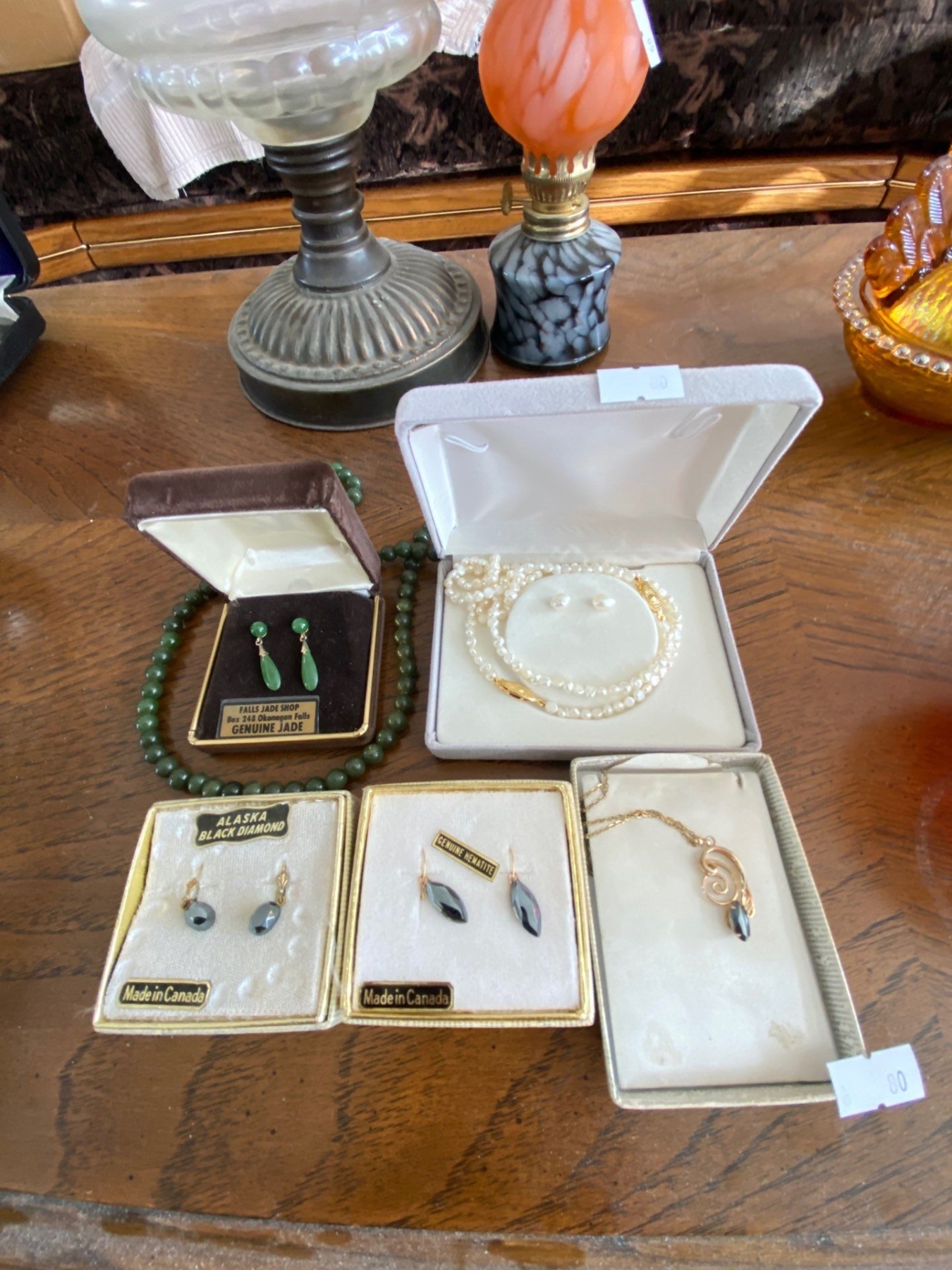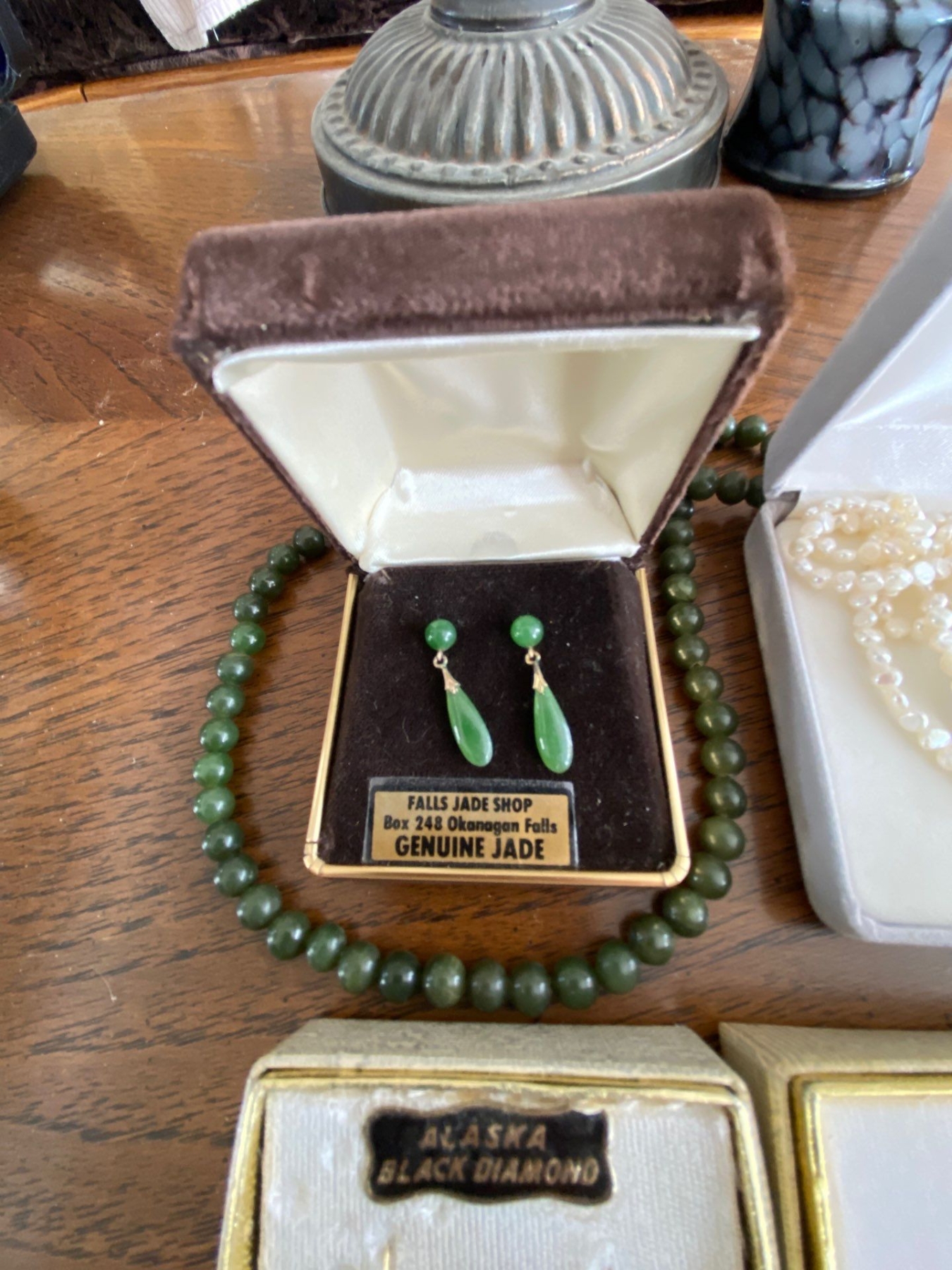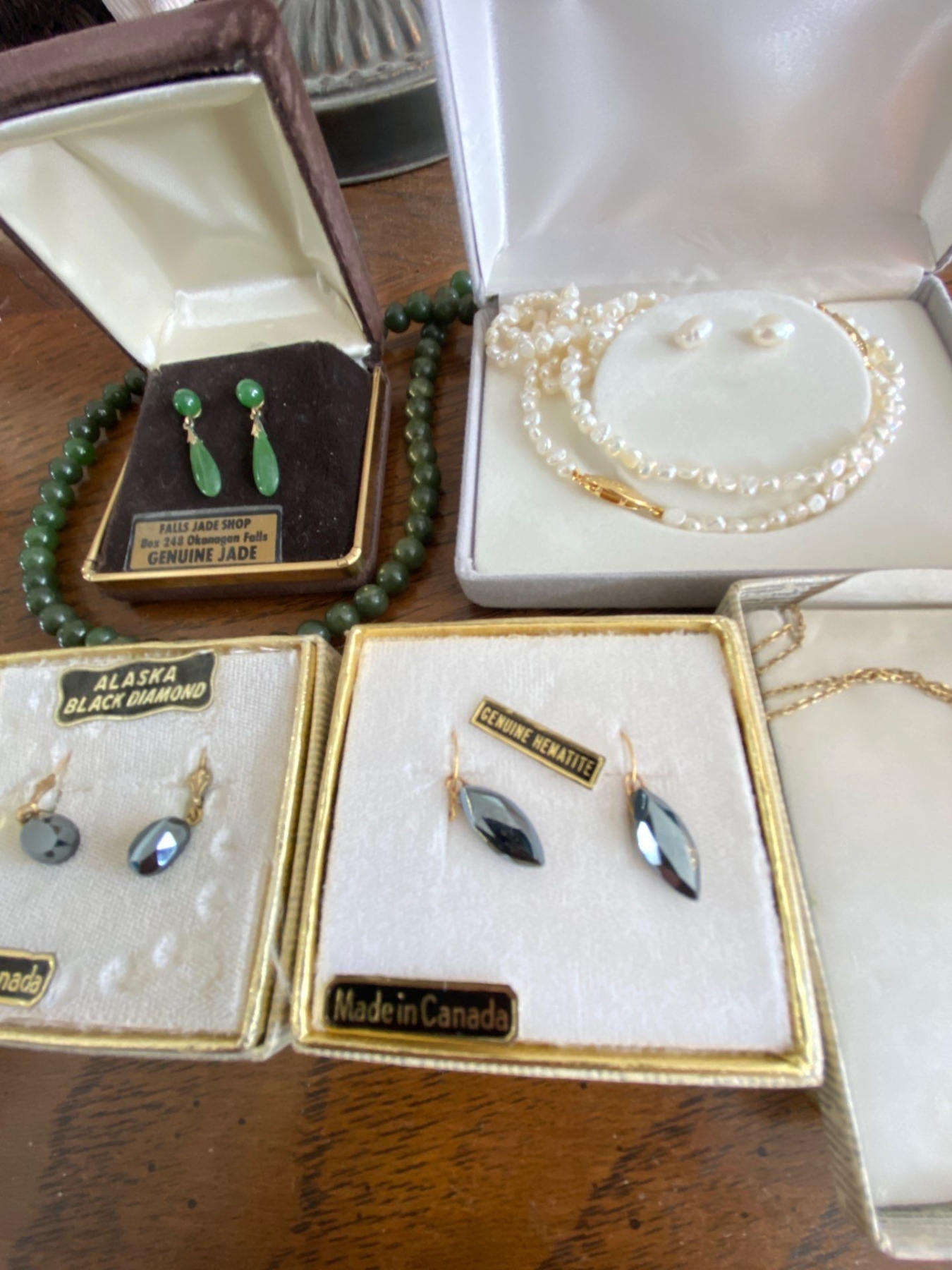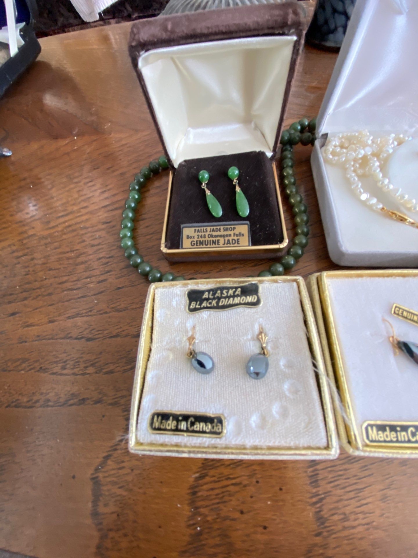 genuine Jade tagged Okanagan, Falls, earrings and necklace and genuine, pearl necklace and earrings and black diamonds from Alaska and genuine, haematite earrings and necklace