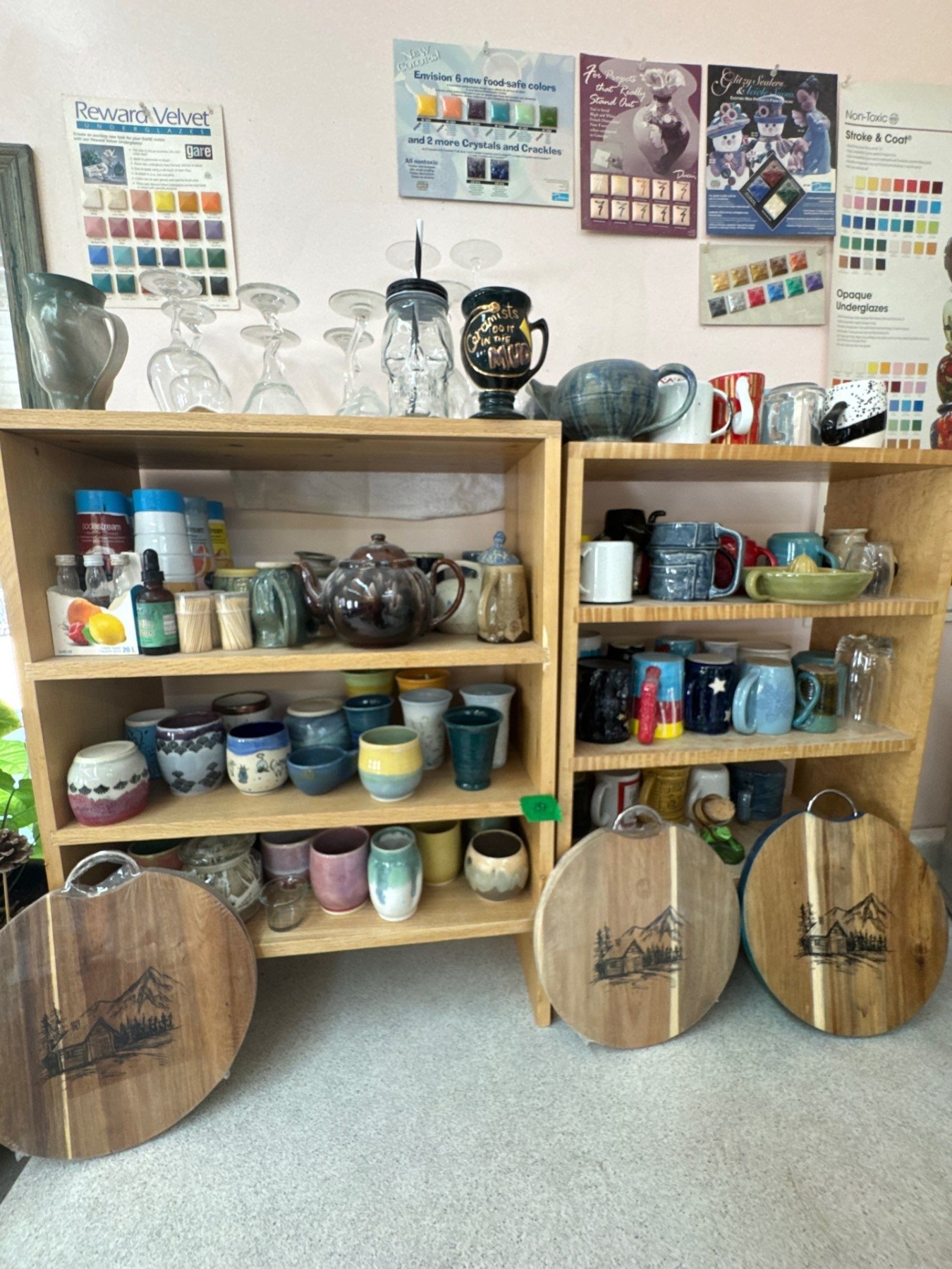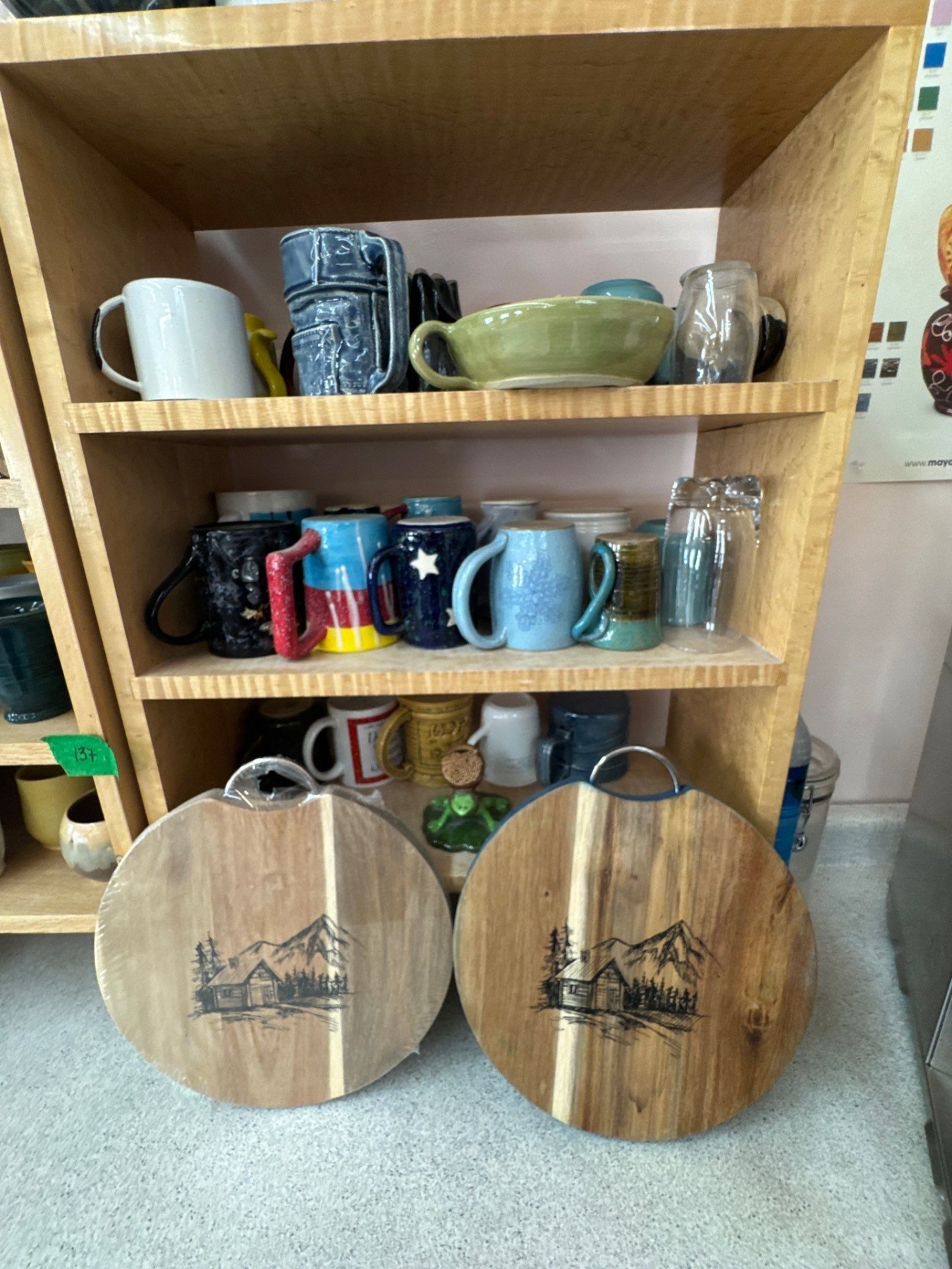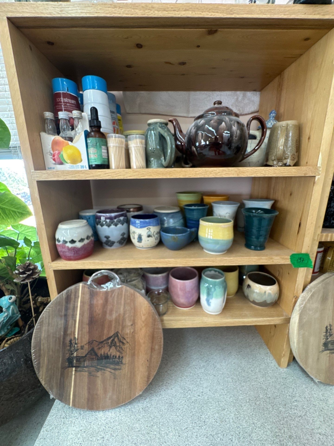 glassware shelving units ceramic cups, cutting boards, tea pots