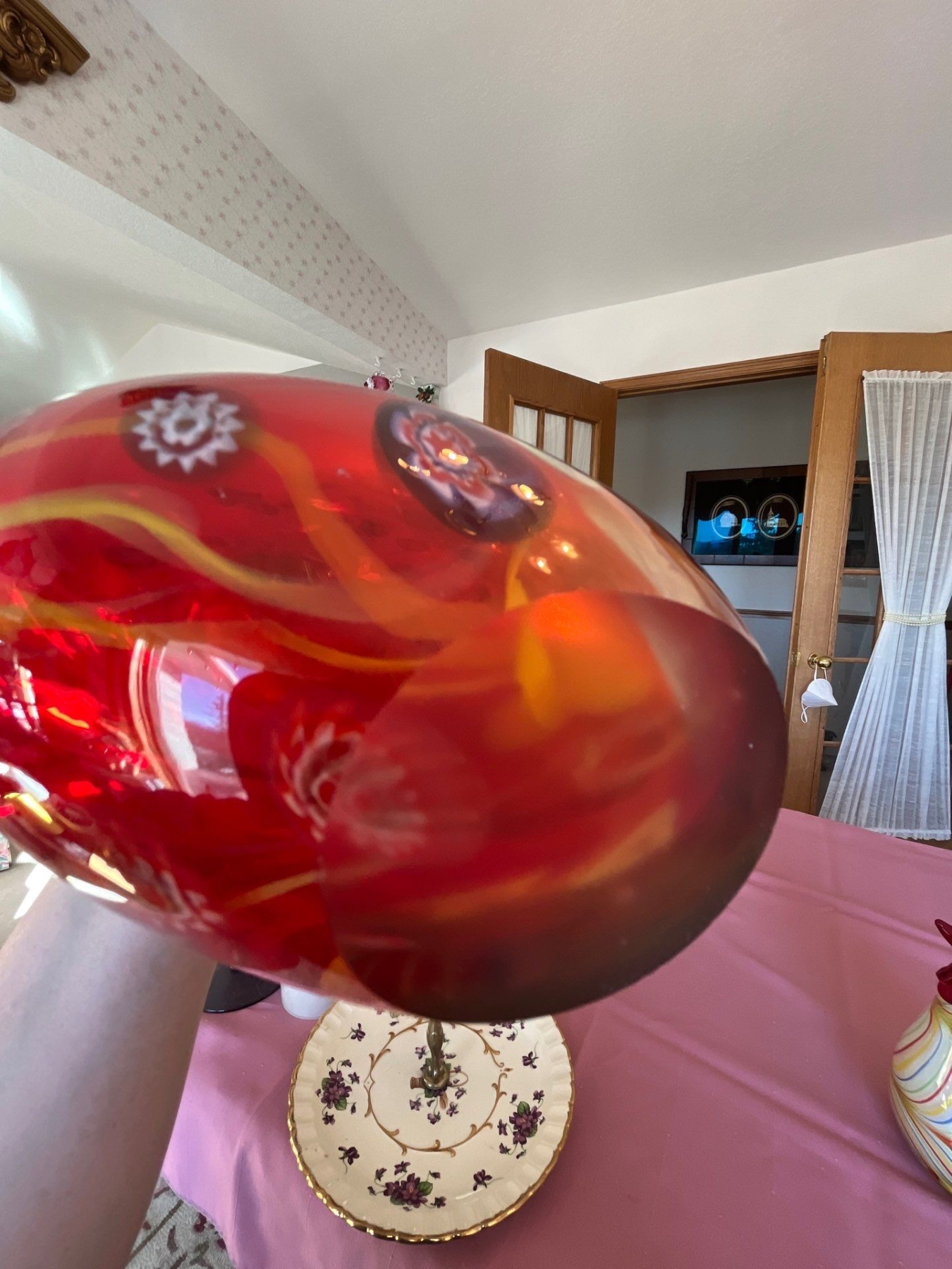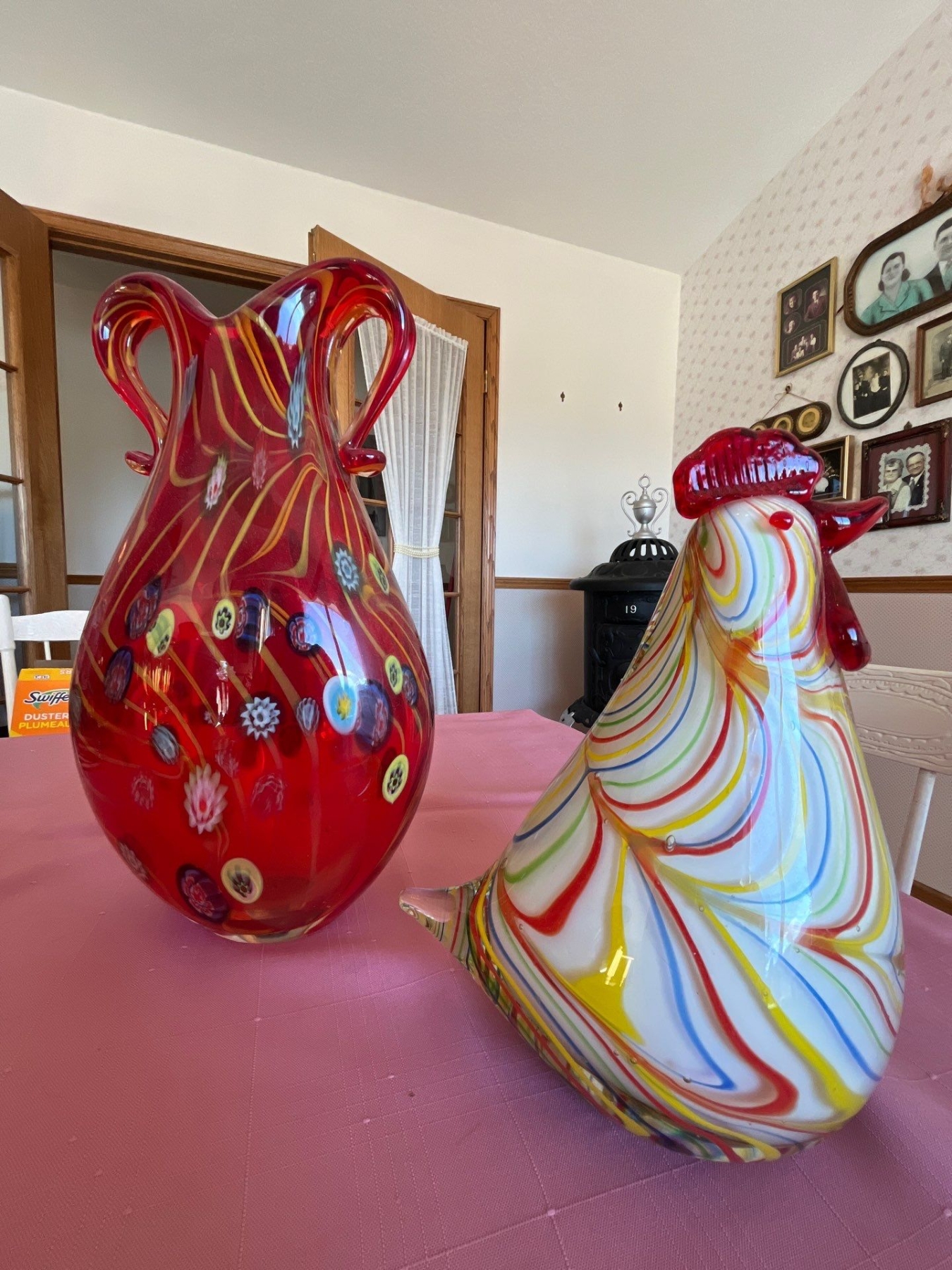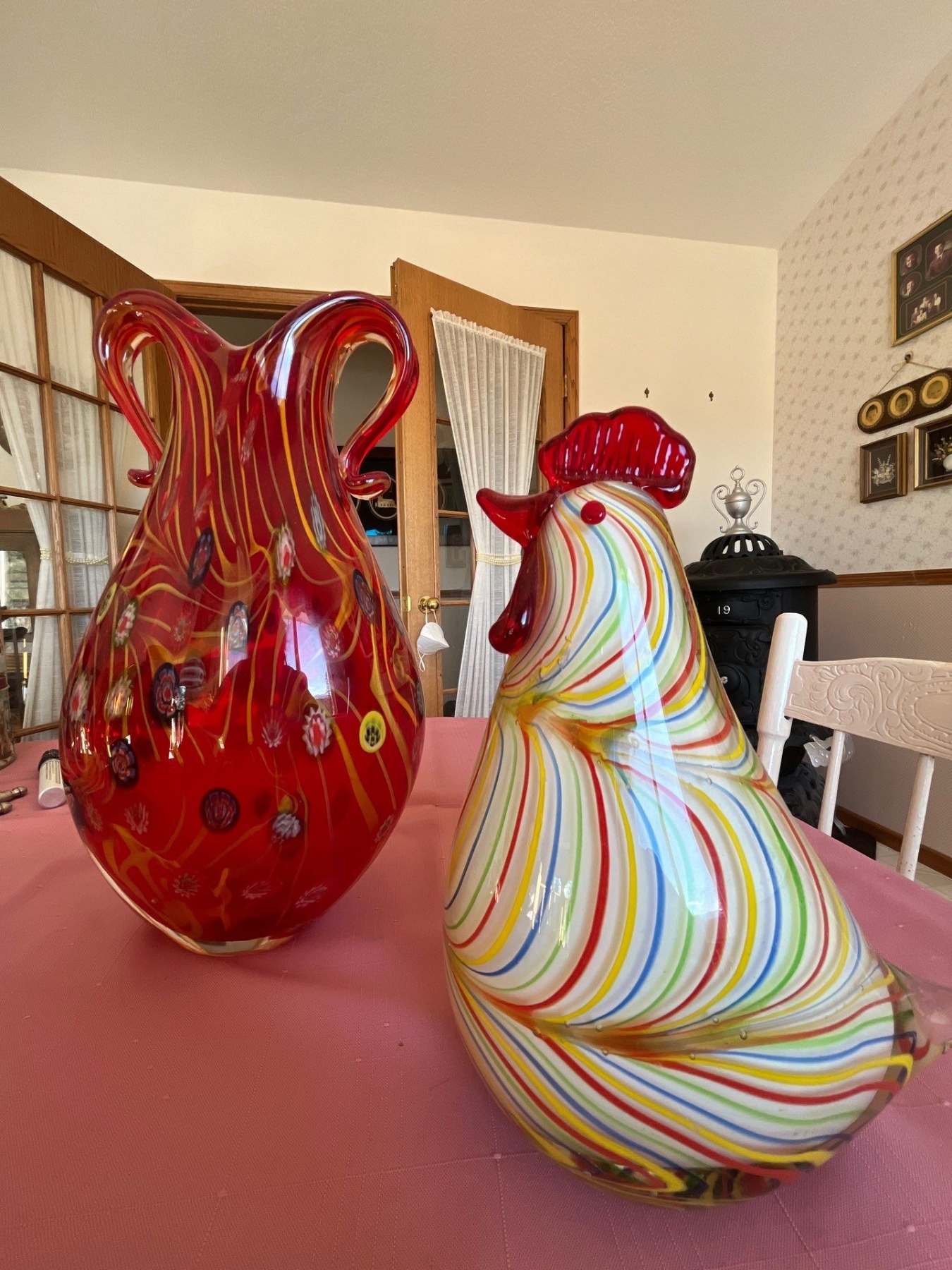 hand blowen glass, chicken and beautiful hand blowen red vase very intricate designs in great condition