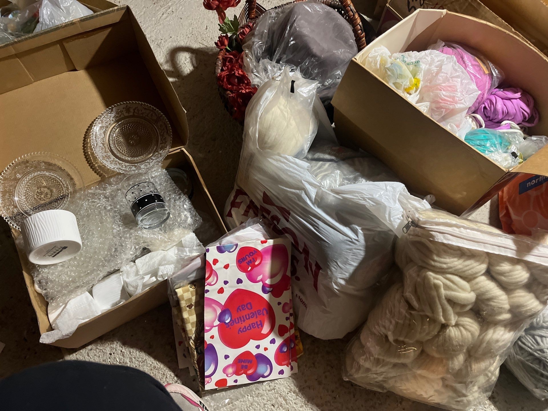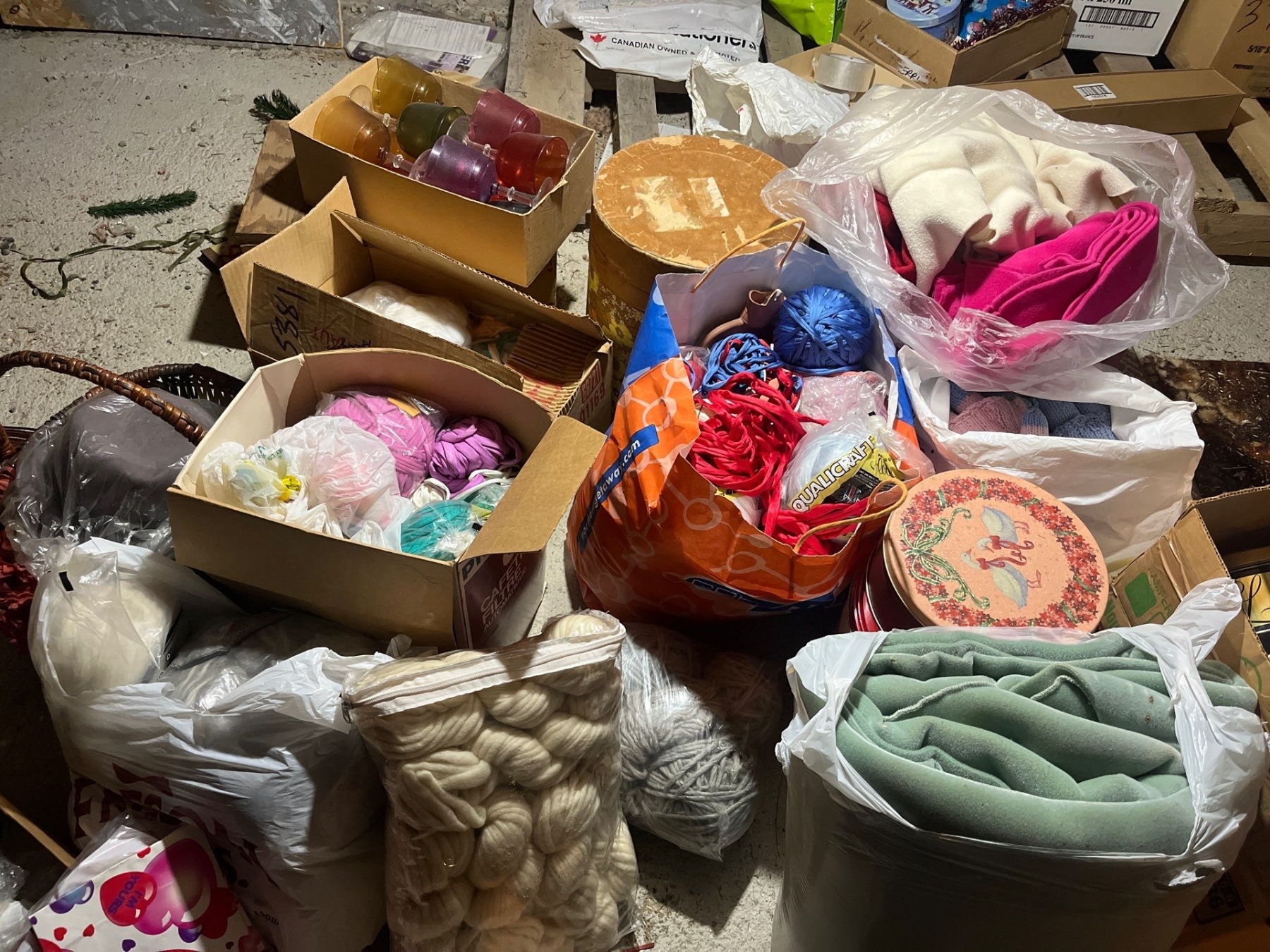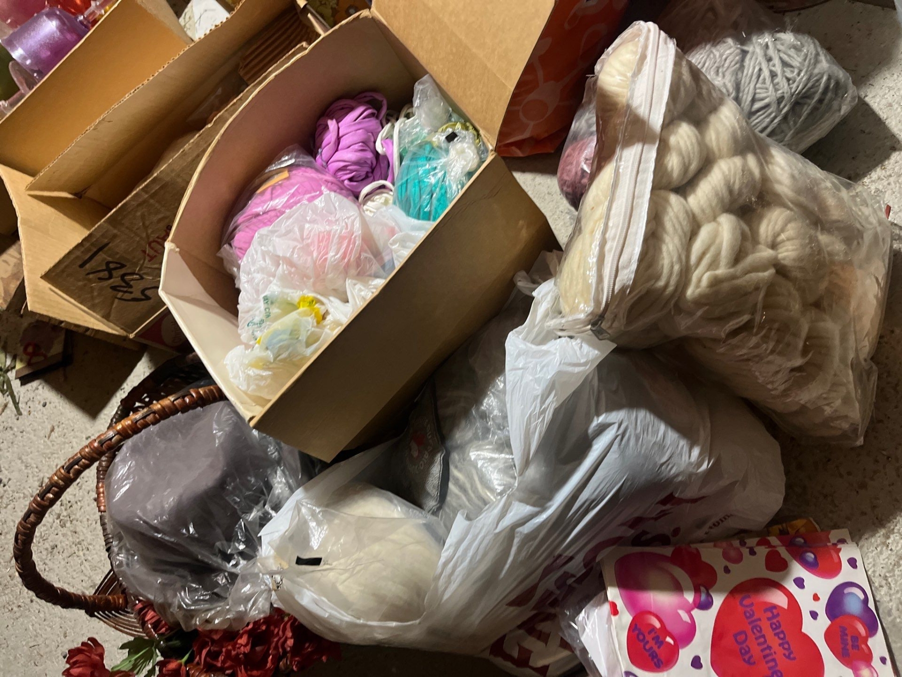 large amount of fabric, sewing supplies yarn felt coffee cups and other cups