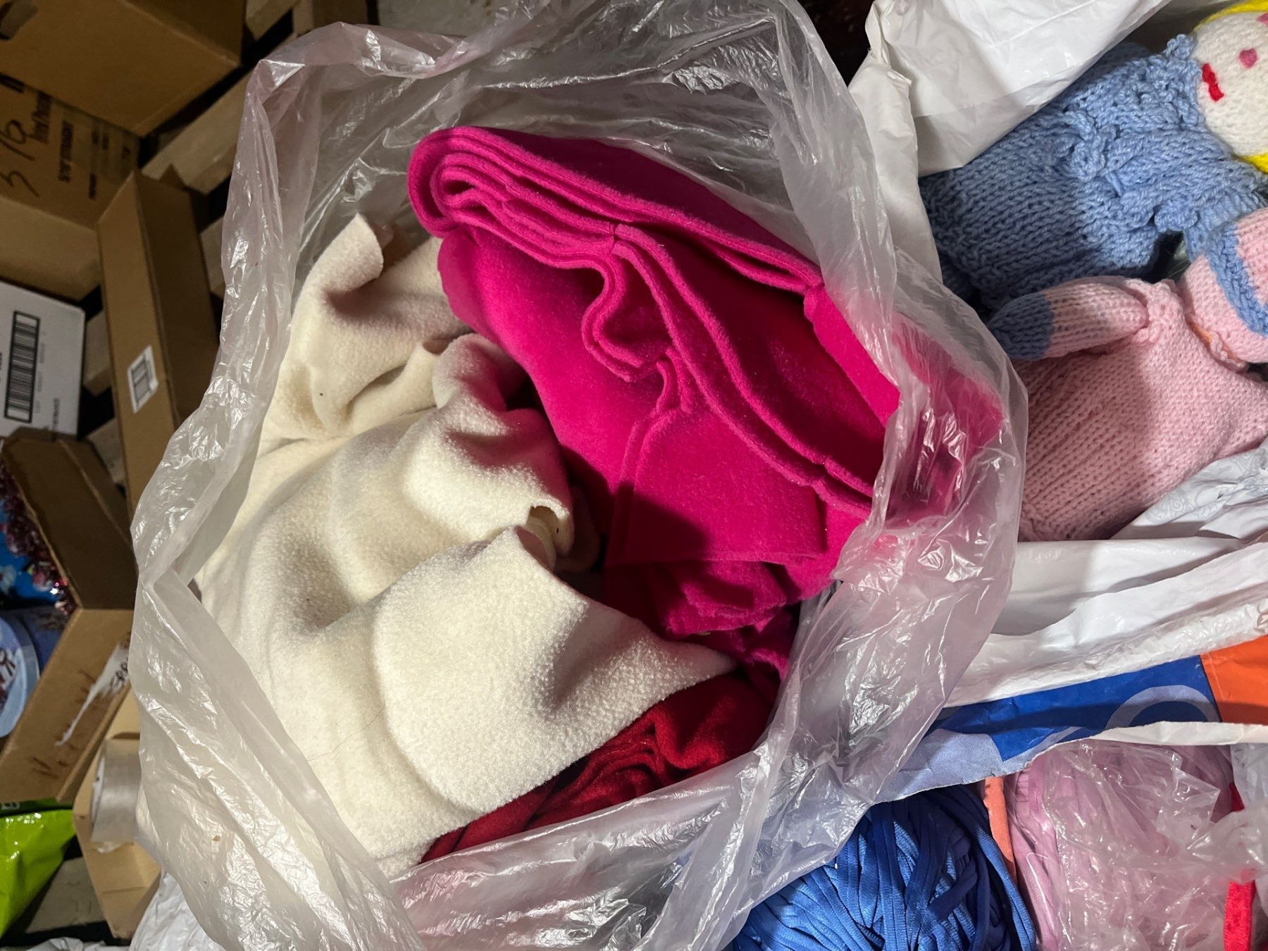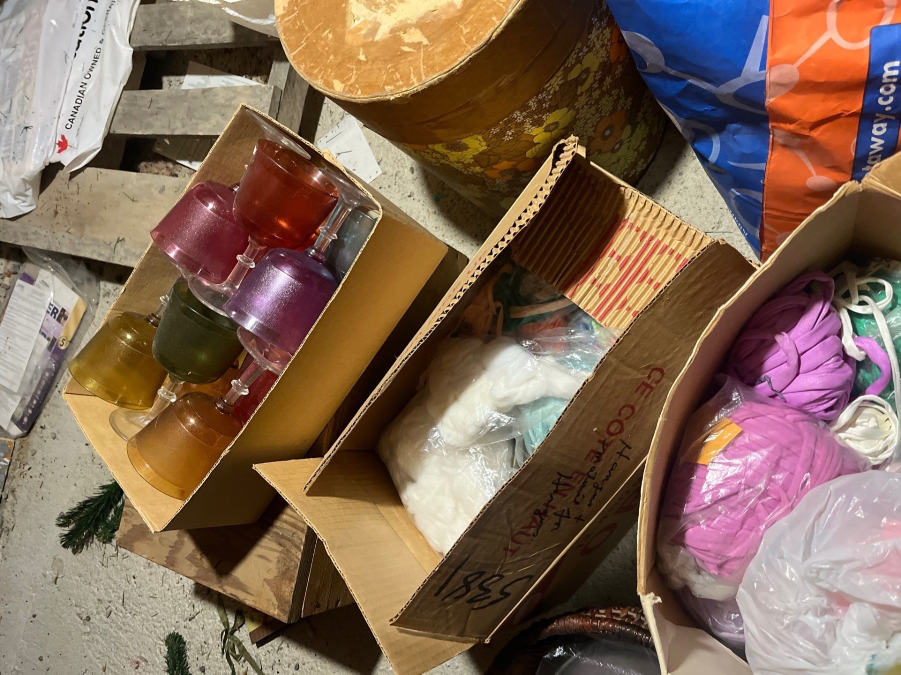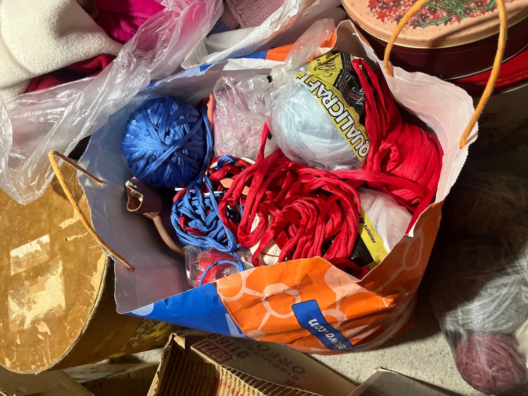 large amount of fabric, sewing supplies yarn felt coffee cups and other cups