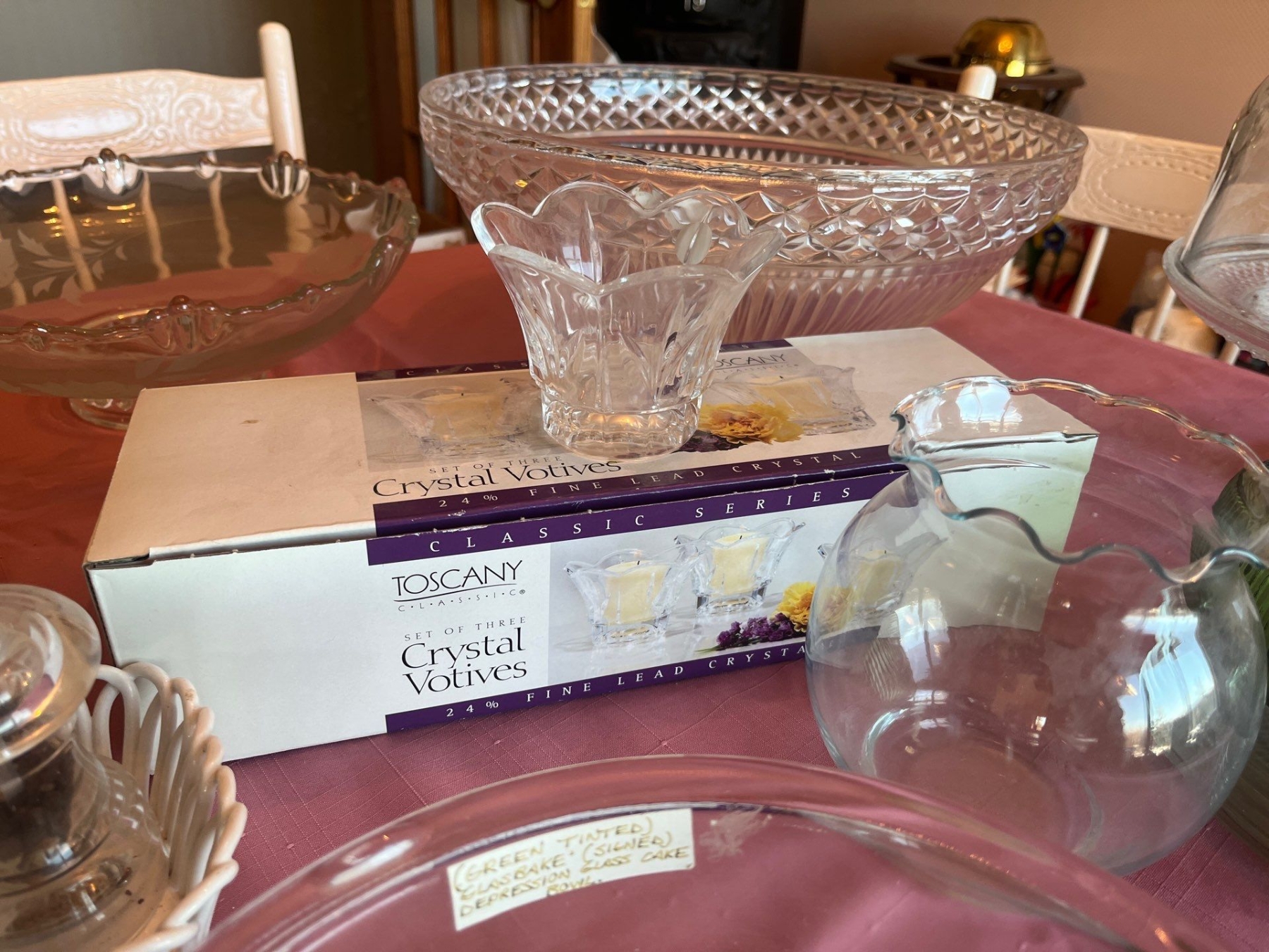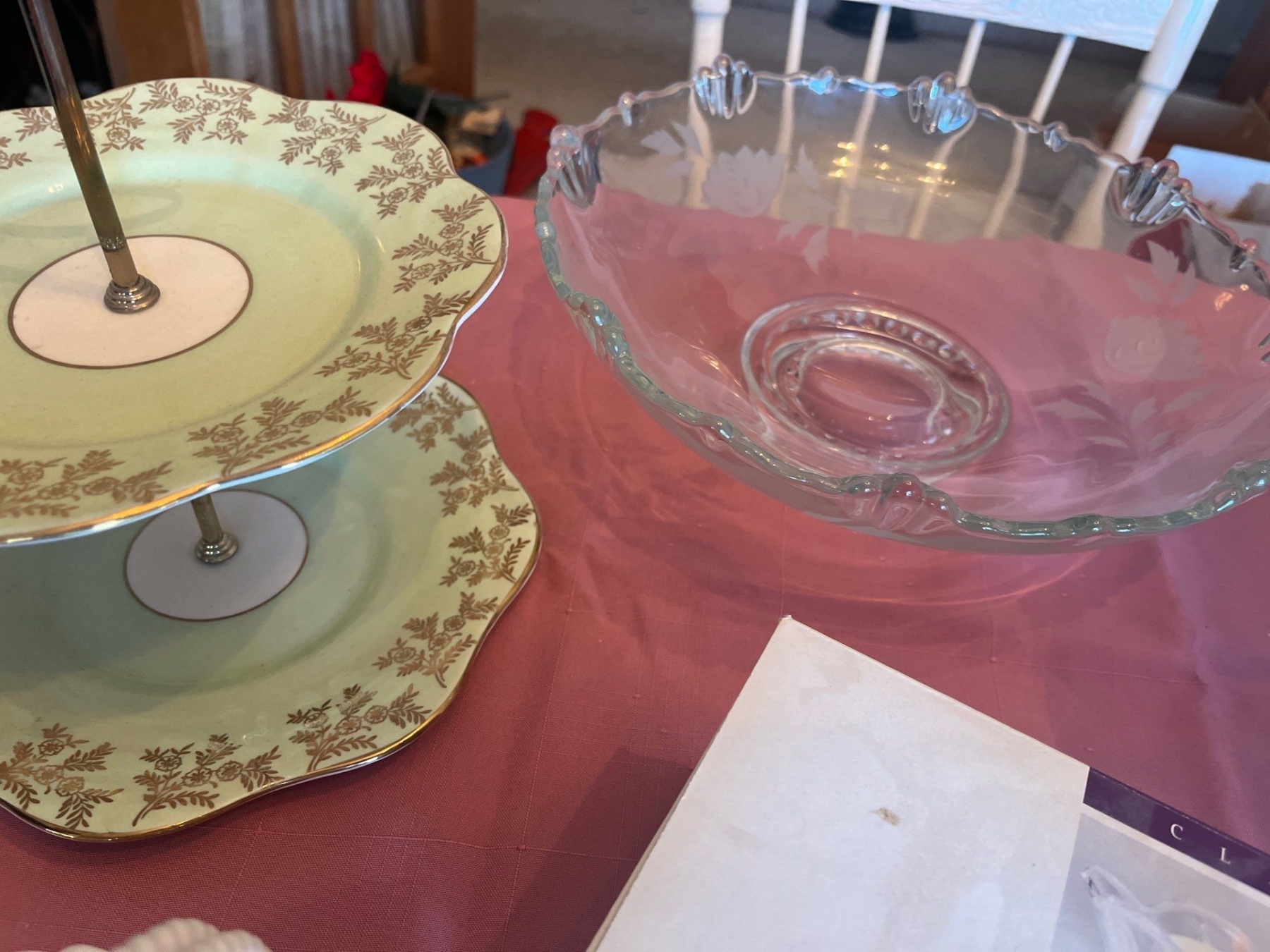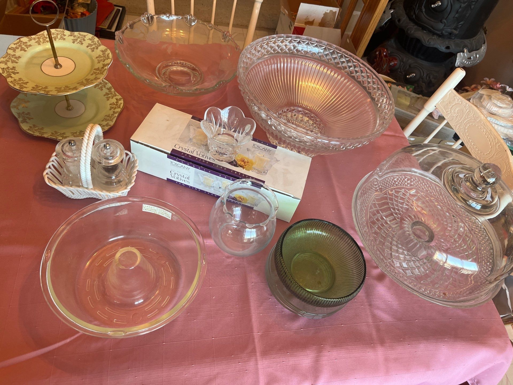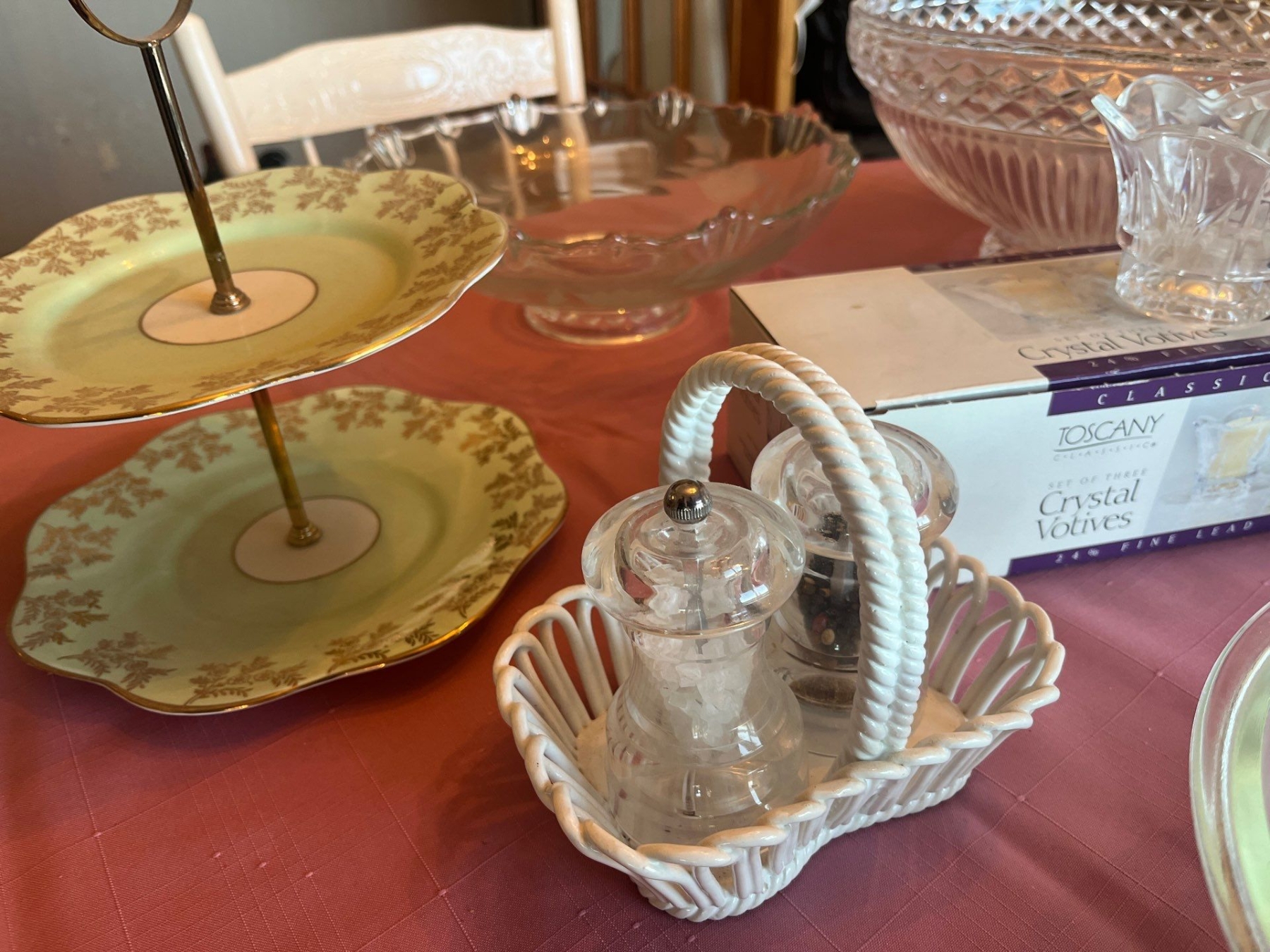large punch bowls, serving dishes, salt, and pepper, shaker cake, bowl 2 tier mint green pastry plat